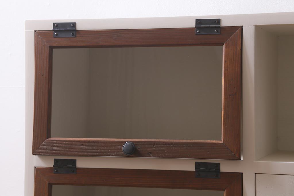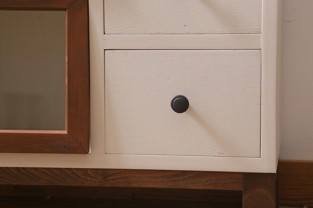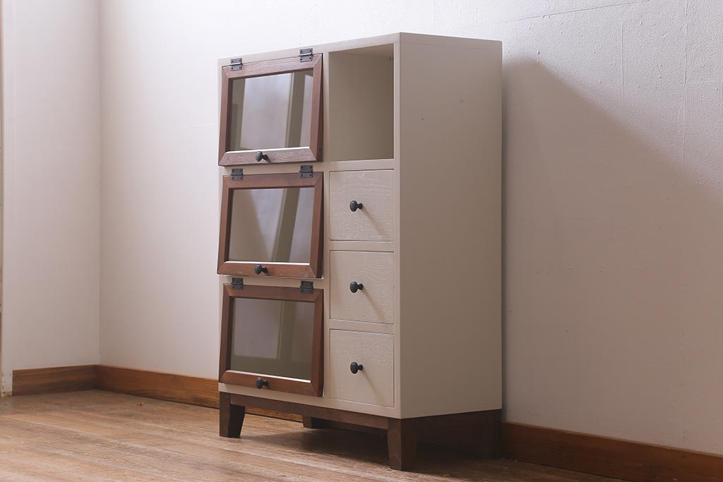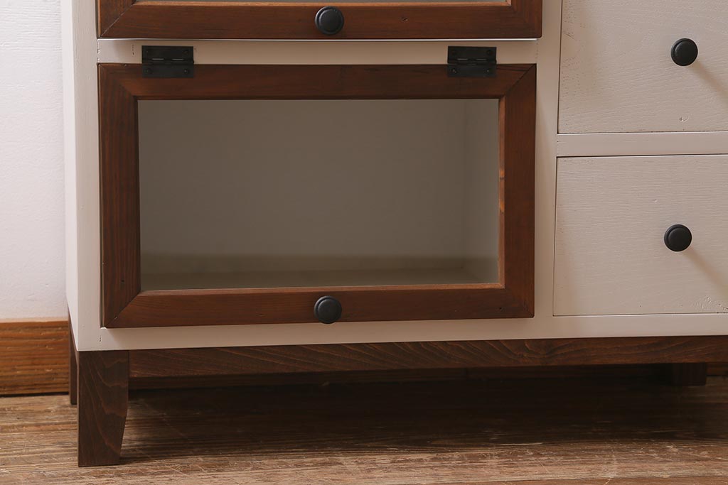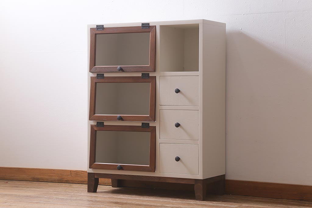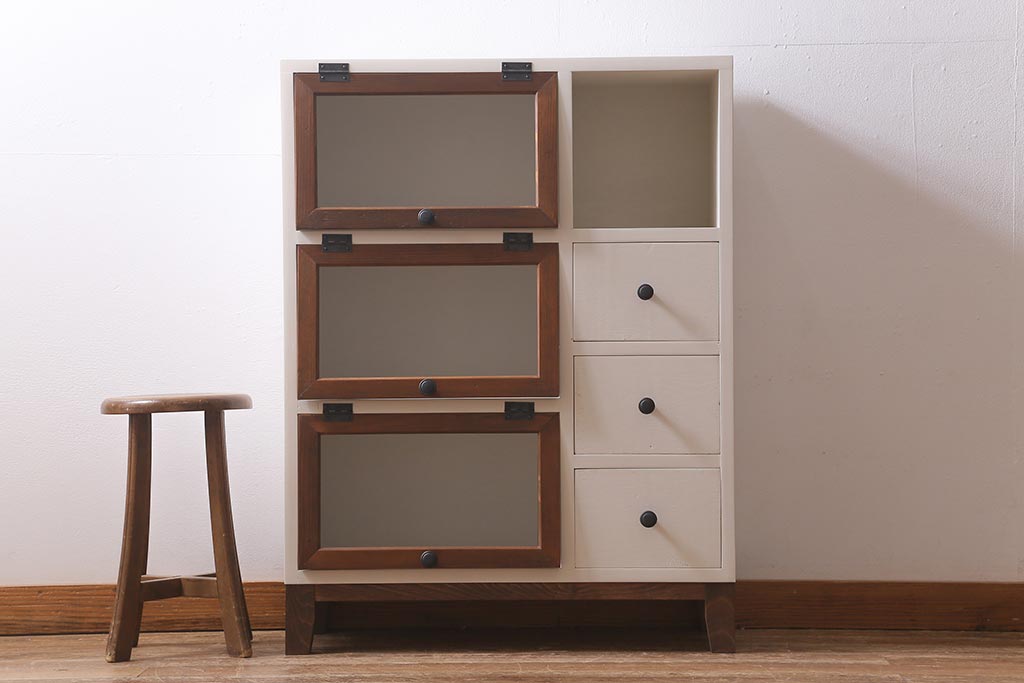 ラフジュ工房オリジナル 古材使用 リメイク家具 ペイント バイカラーがレトロなパタパタ扉のキャビネット(収納棚、リビングボード)(R-040255)です。