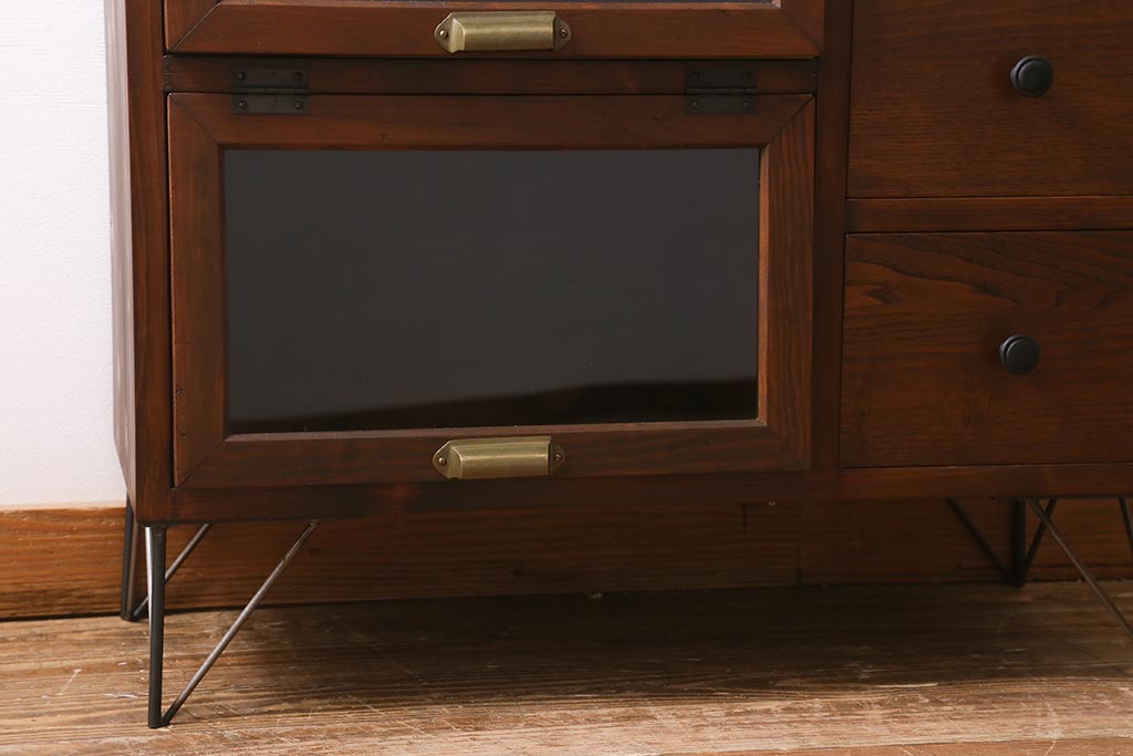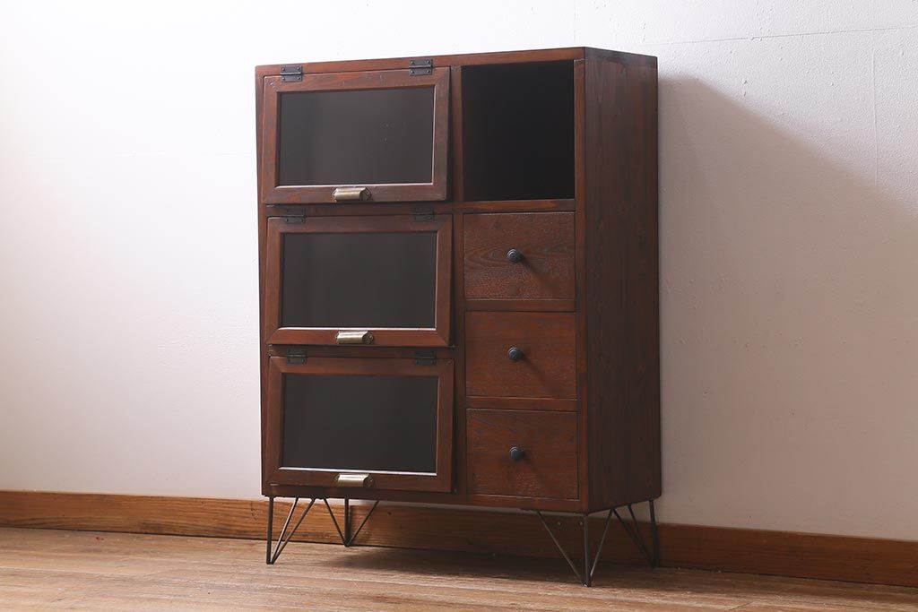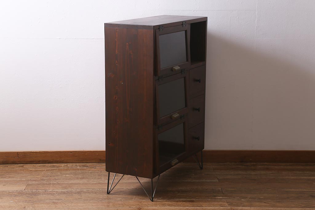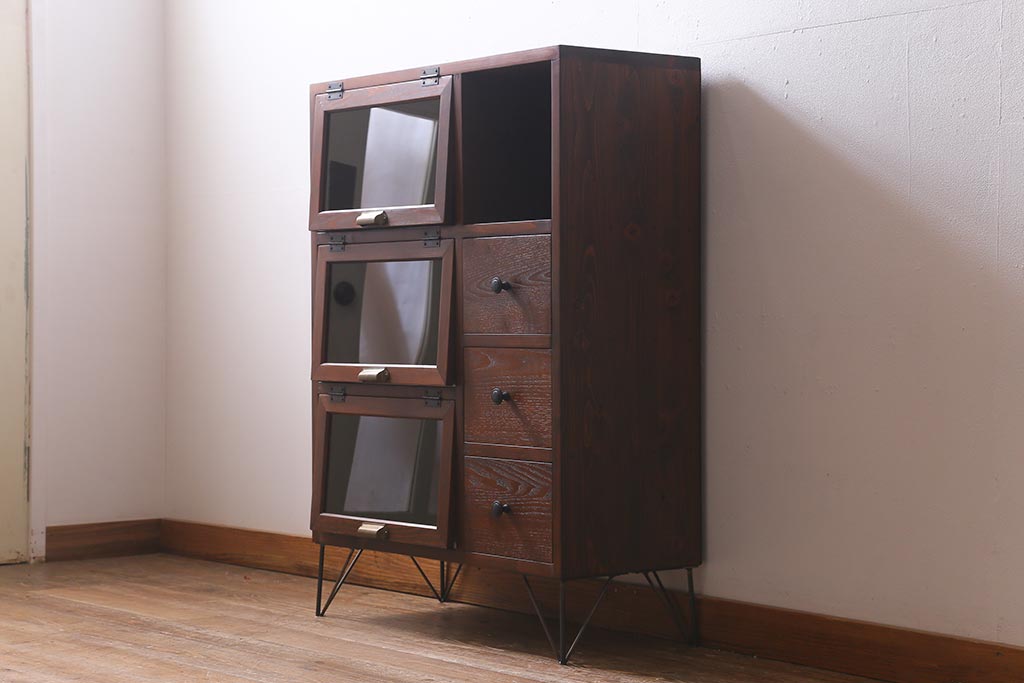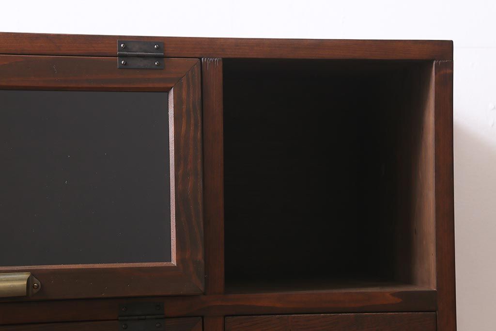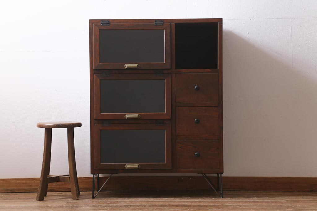 ラフジュ工房オリジナル 古材使用 リメイク家具 濃い色味が素敵なパタパタ扉付きキャビネット(収納棚)(R-040253)です。