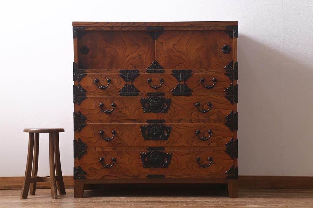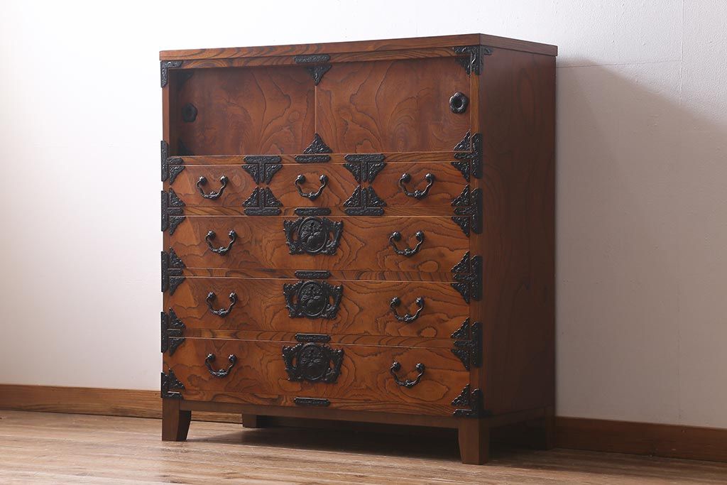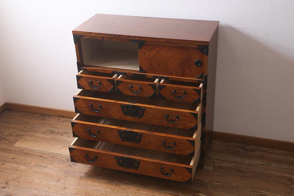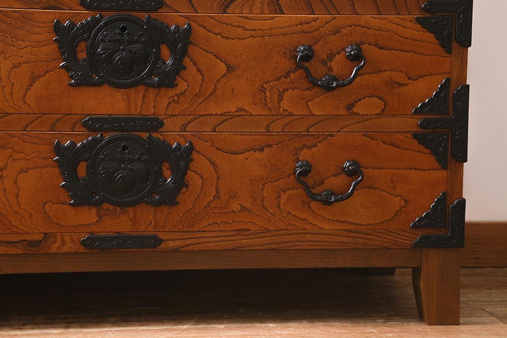 リメイク家具 岩谷堂箪笥 脚付きリメイク 美しい杢目と黒い金具が魅力の整理箪笥(戸棚、チェスト、引き出し、和タンス)(R-040328)