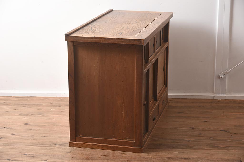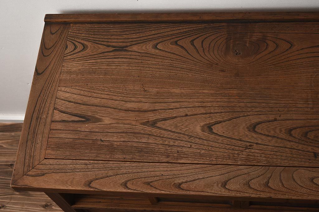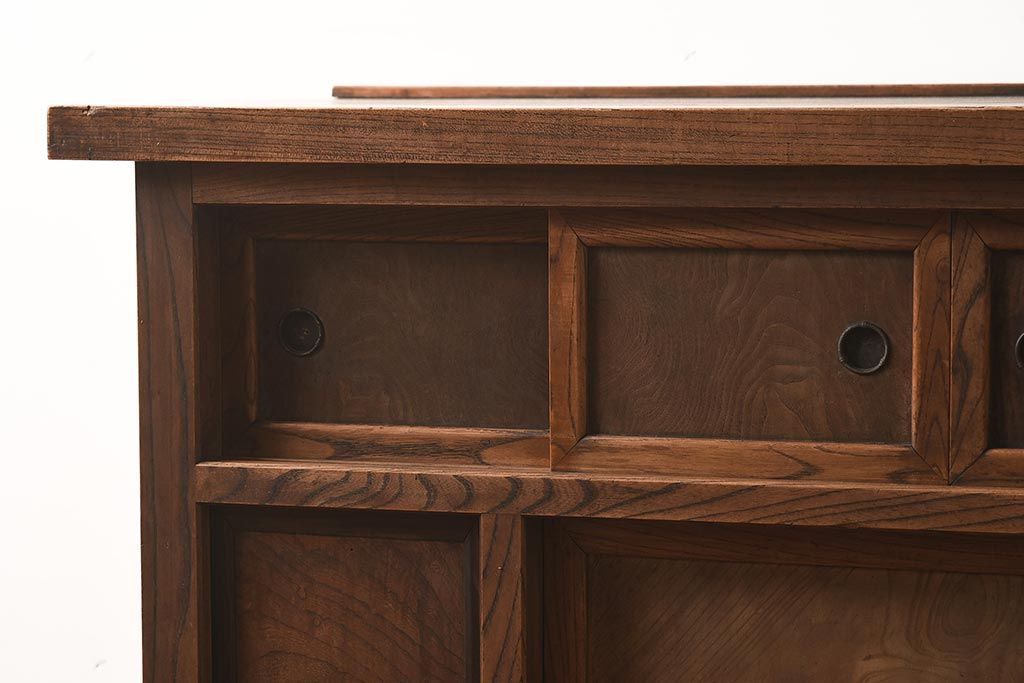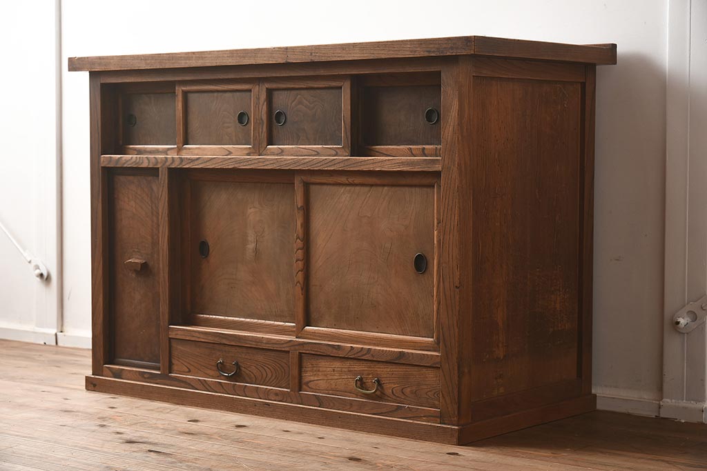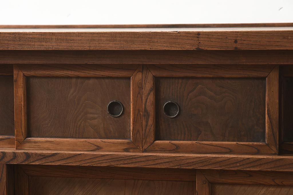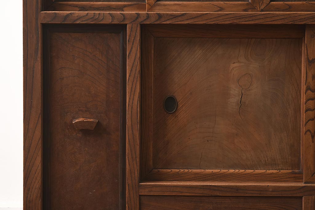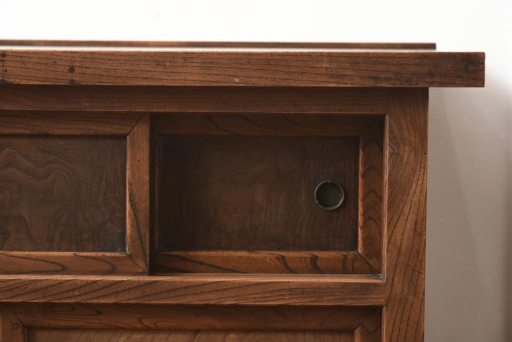 和箪笥> 茶箪笥・茶棚 > アンティーク家具 和製アンティーク 明治期 倹飩式 前面・天板ケヤキ材 味わい深い木の風合いが魅力の茶棚(戸棚、収納棚、キャビネット、引き出し)(R-040337)