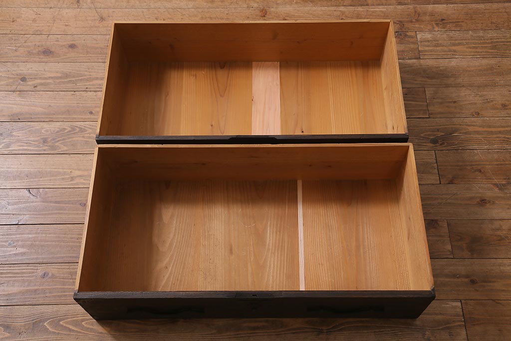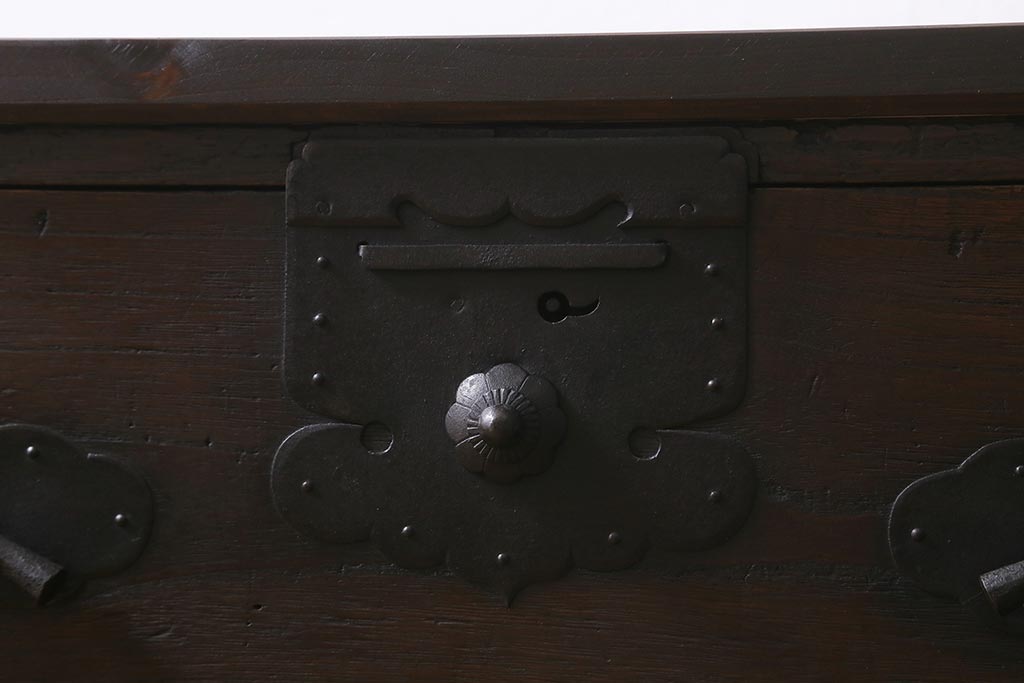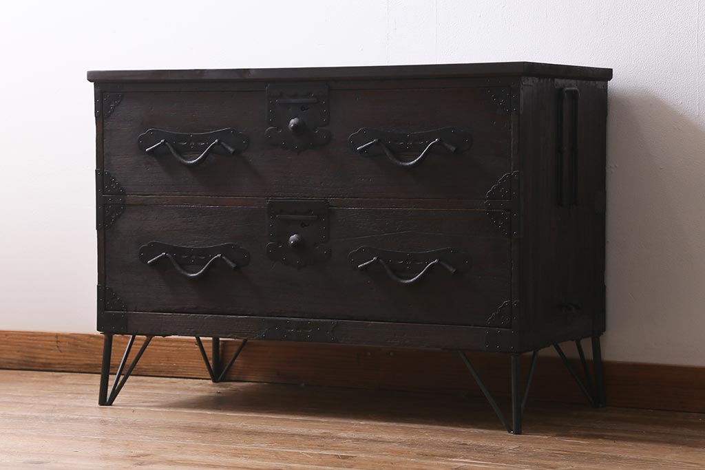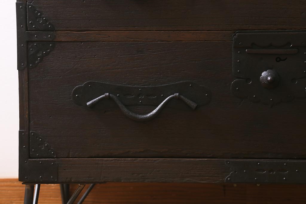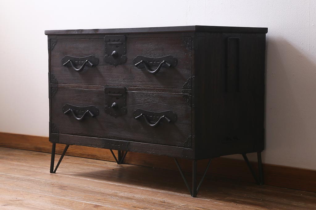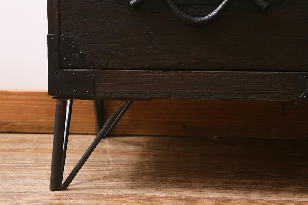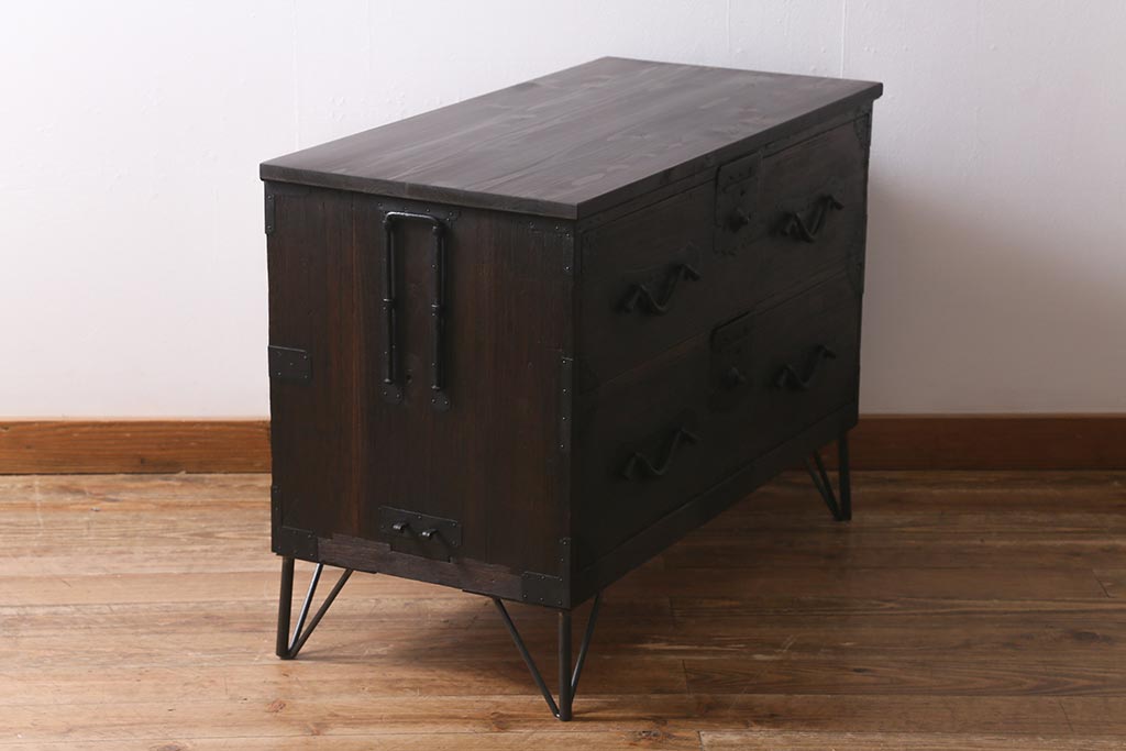 チェスト・引き出し> ローチェスト > アンティーク家具 和製アンティーク 鉄脚リメイク 大きな蛭手が目を引く箪笥ローボード(衣装箪笥、チェスト、引き出し、リビングボード)(R-040393)