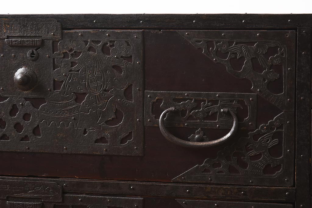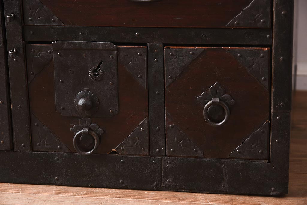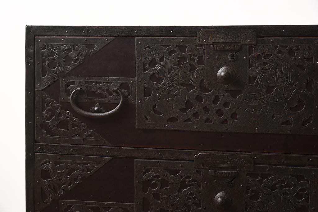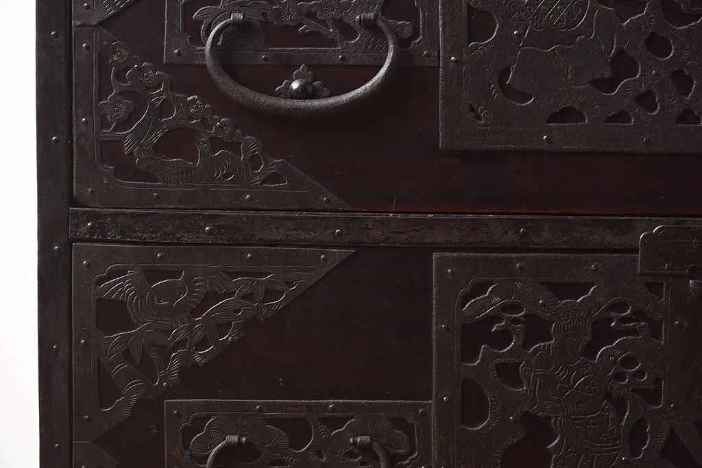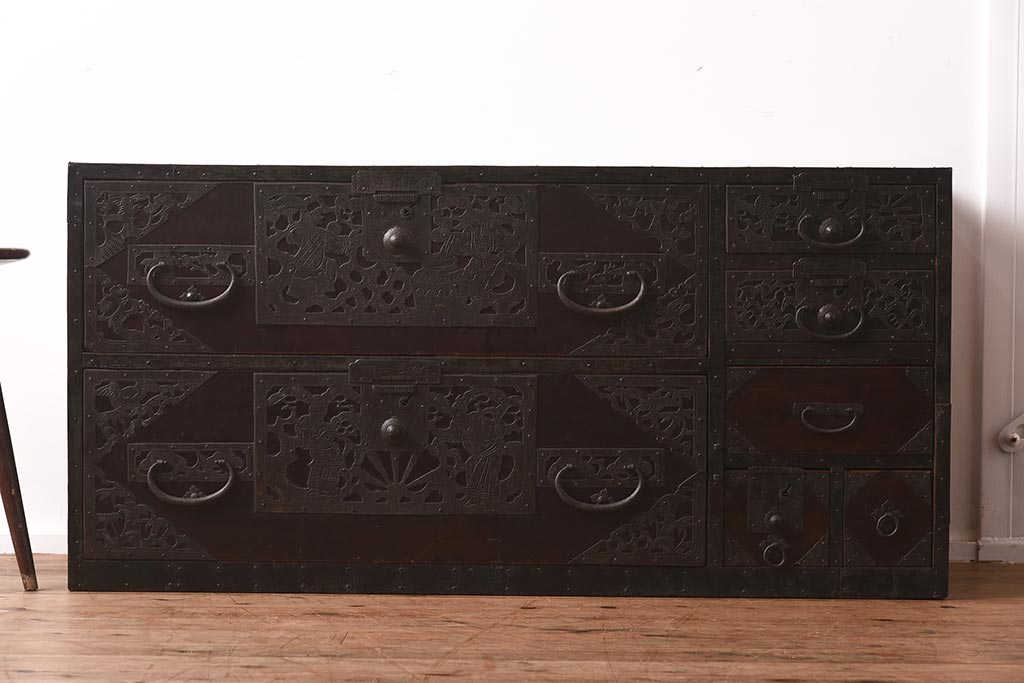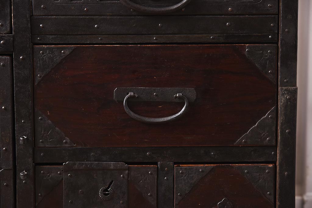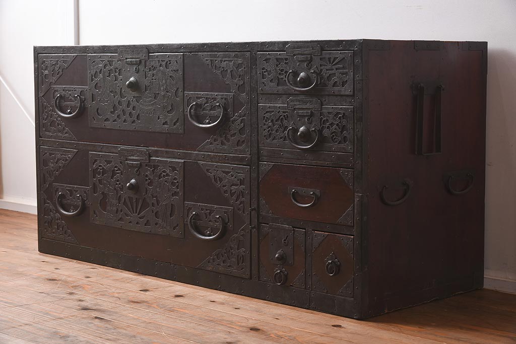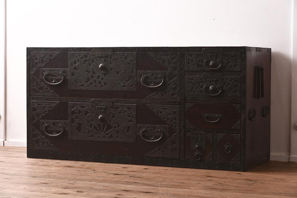和箪笥> 衣装箪笥 > アンティーク家具 和製アンティーク 明治期 細かな透かし金具が目を引く佐渡箪笥(八幡箪笥、衣装箪笥、引き出し、チェスト)(R-040248)