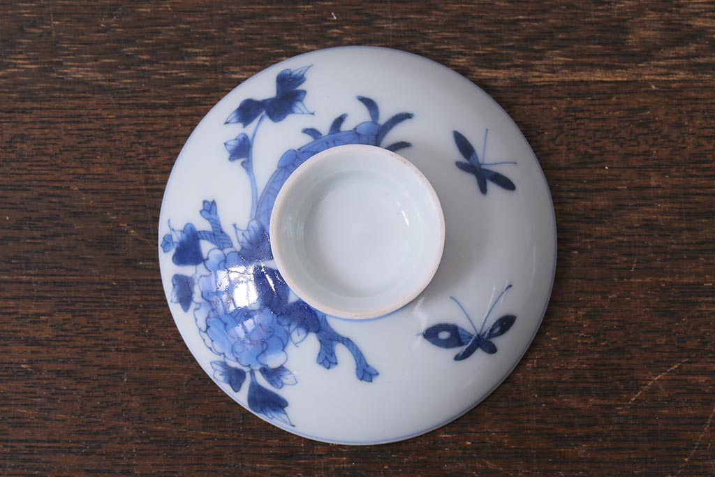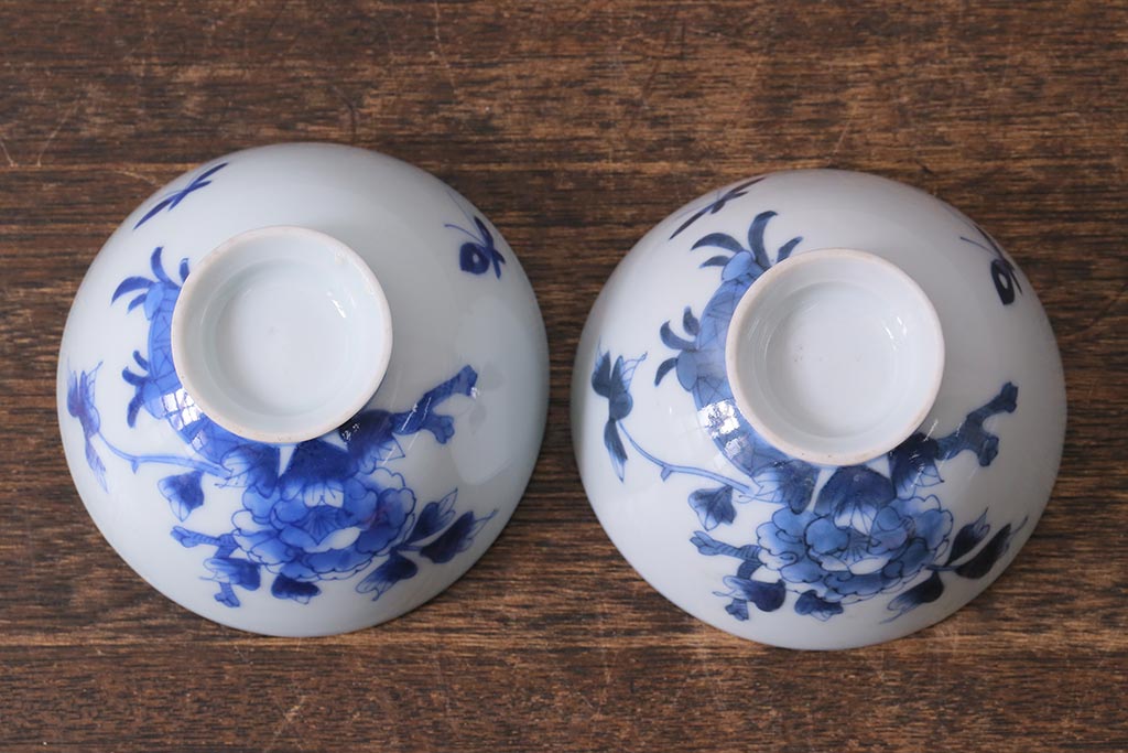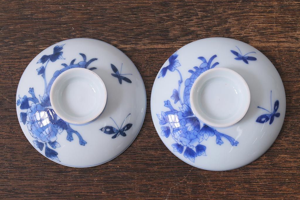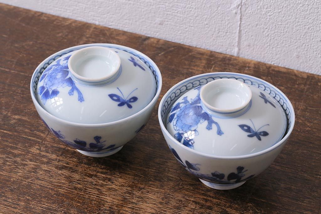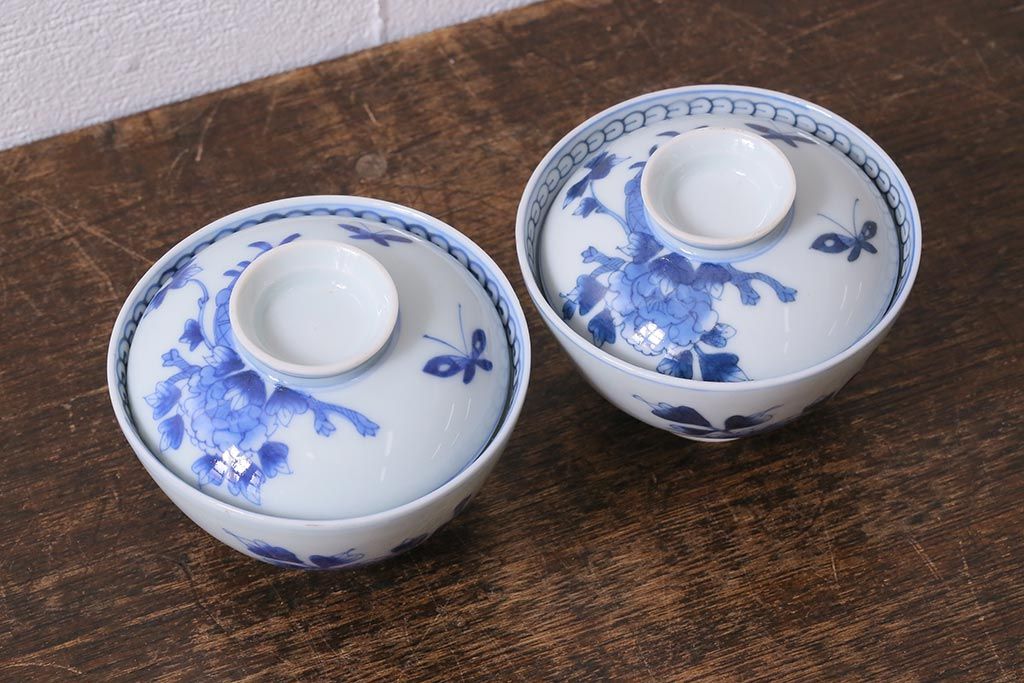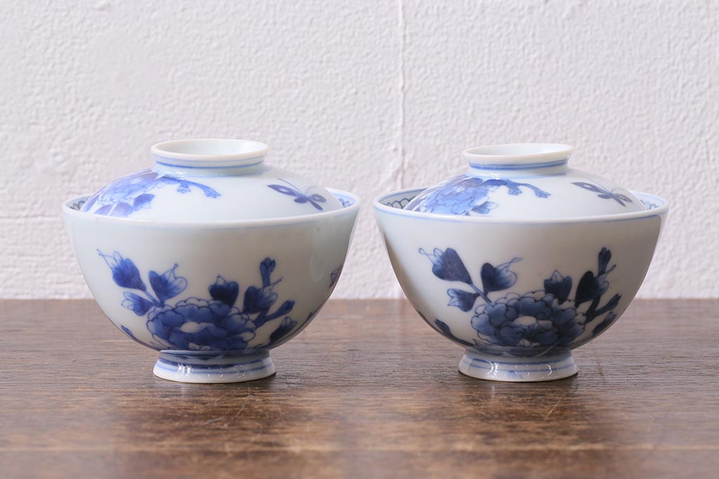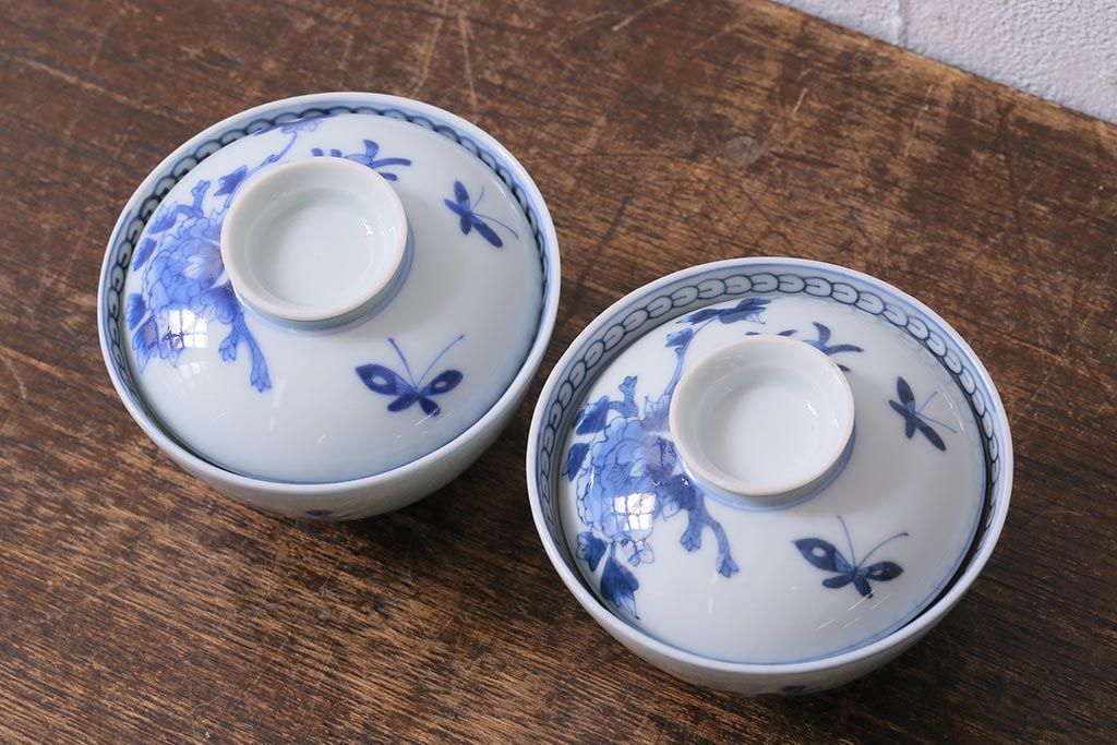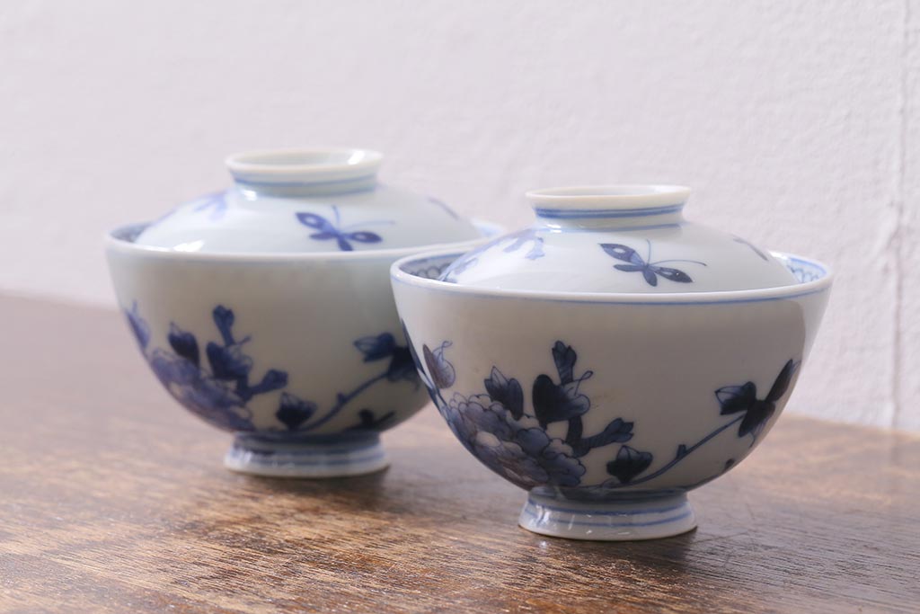 アンティーク雑貨 明治期 花蝶文染付蓋茶碗2客セット(蓋付茶碗、和食器)(R-040499)