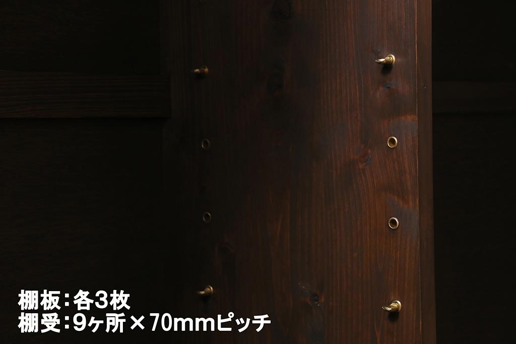 棚板は取り外しできます。棚板は3枚あります。棚受け穴は9ヶ所、70mmピッチで調整できます。棚幅サイズのものが1枚の作りです。