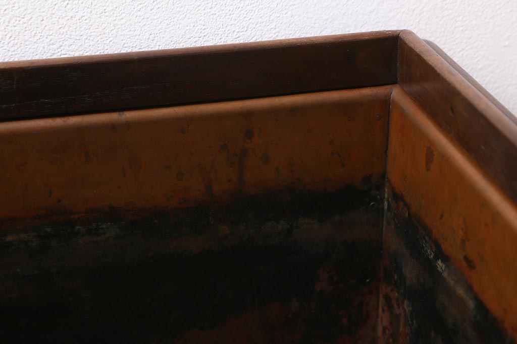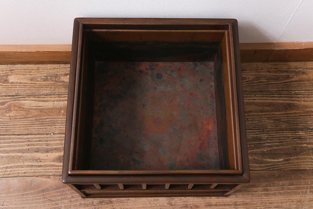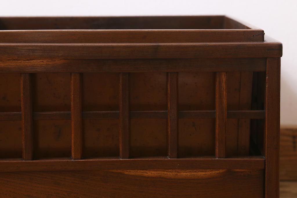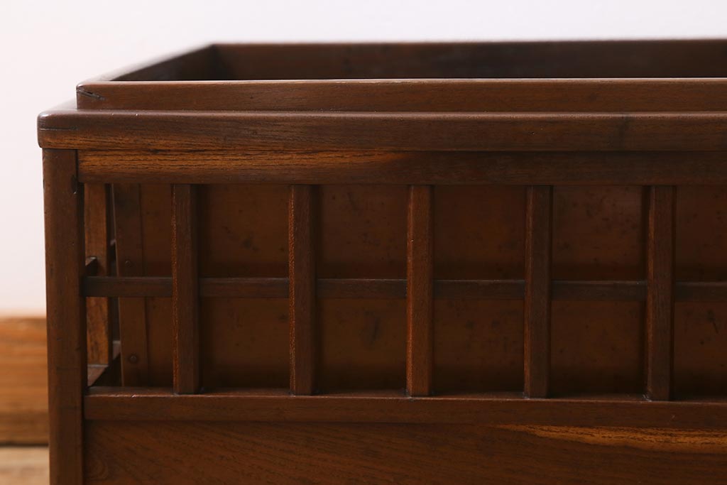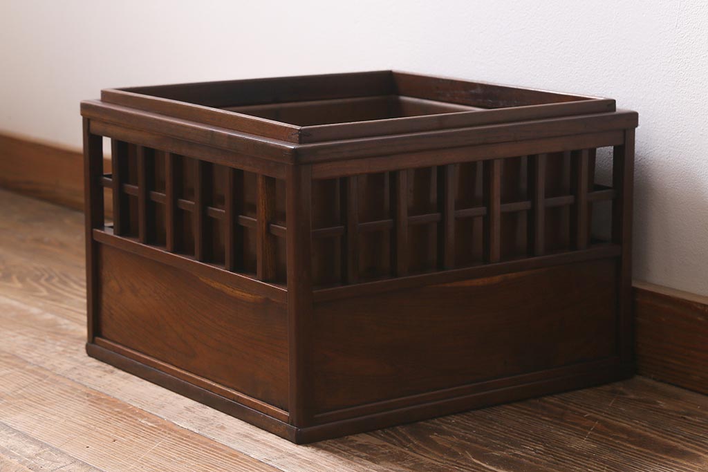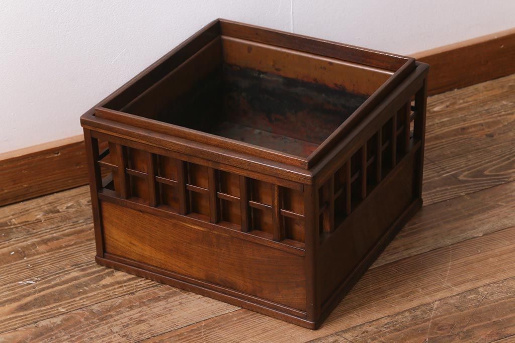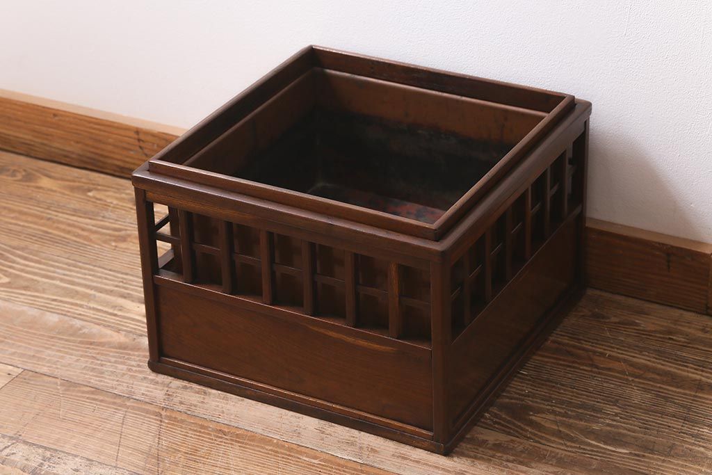 アンティーク雑貨 昭和中期 工芸品 京都産 桑材 格子が目を惹く角火鉢(木製火鉢、箱火鉢)(R-040395)です。