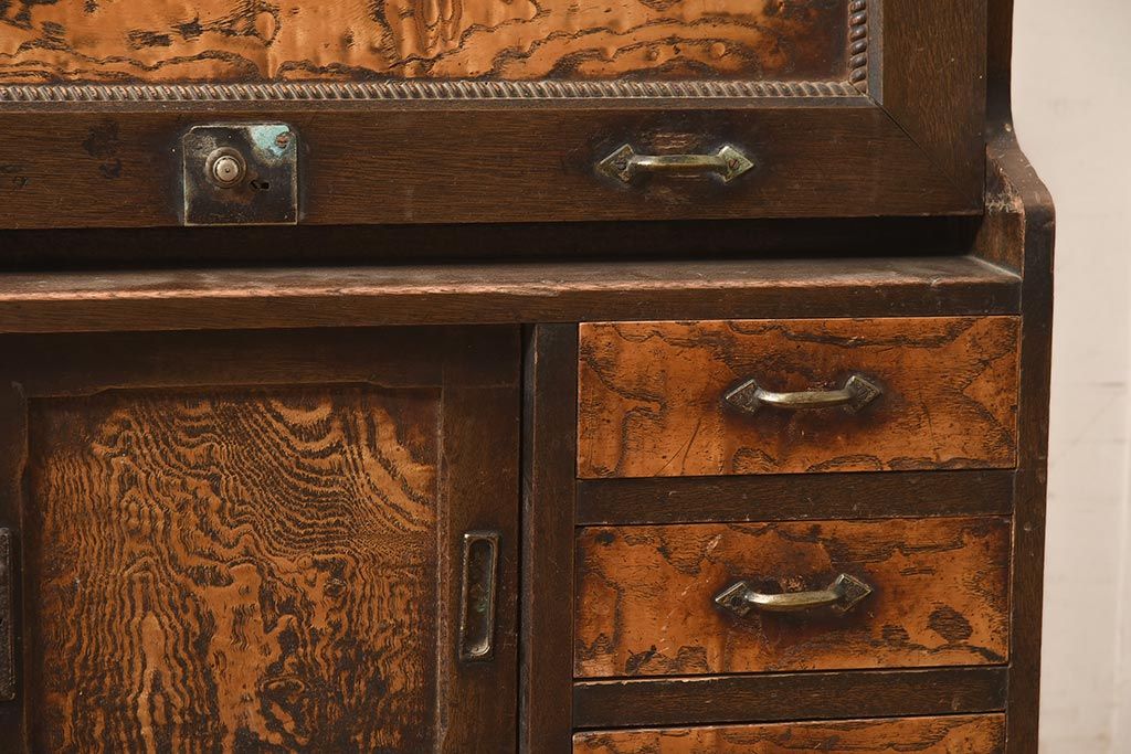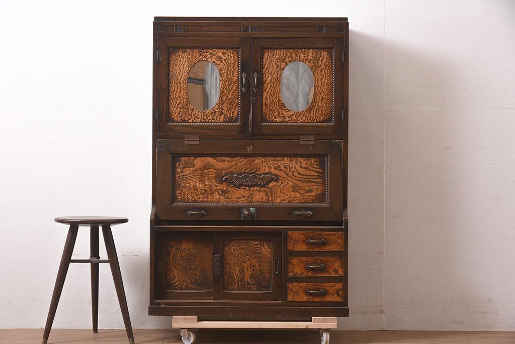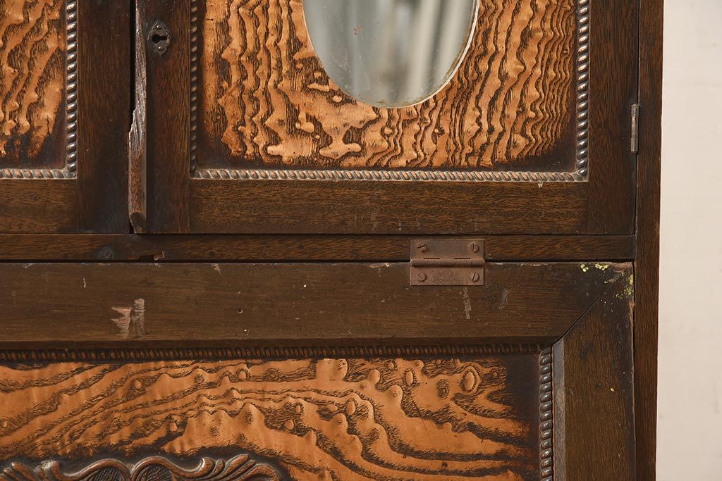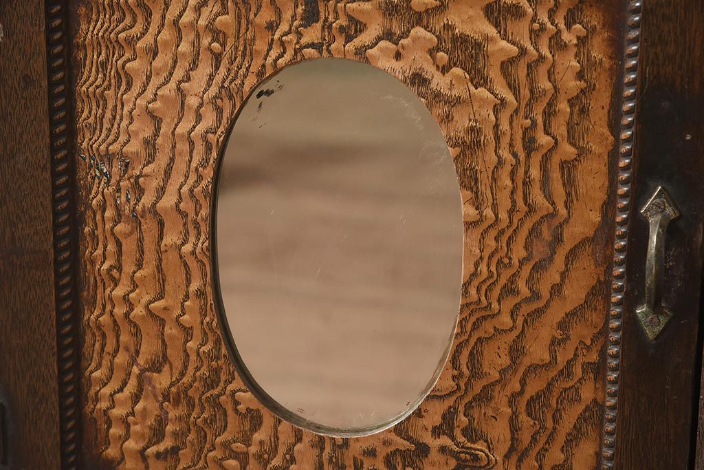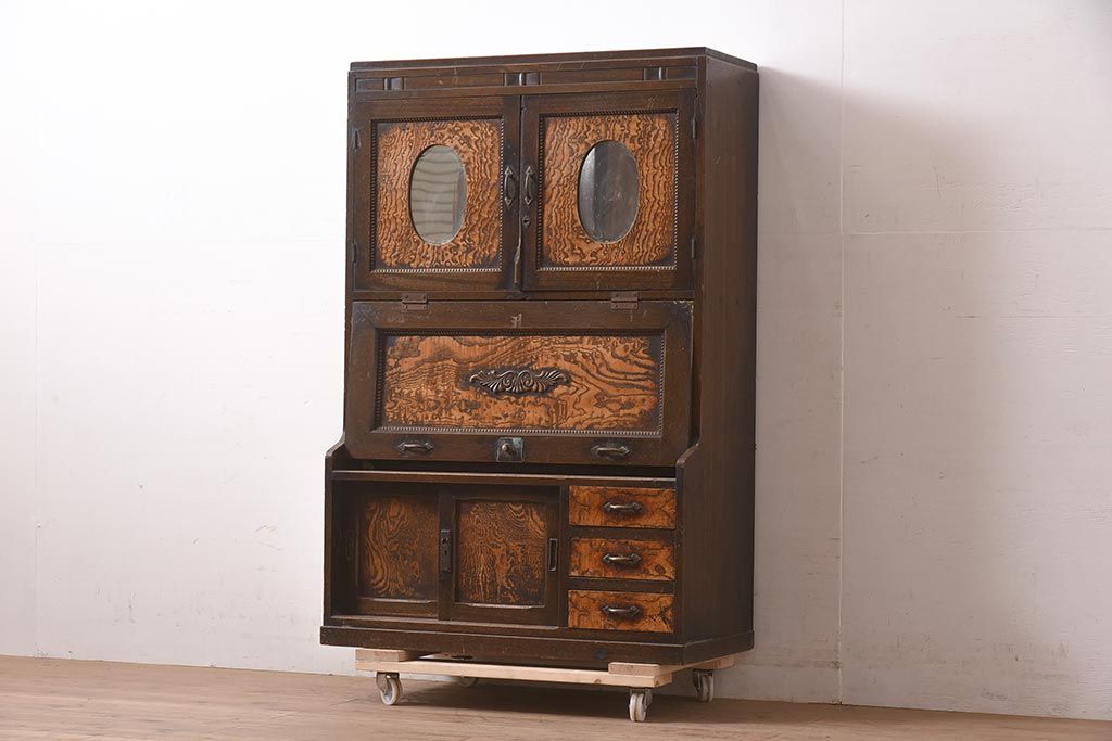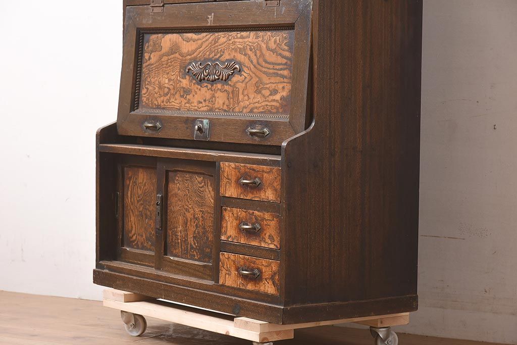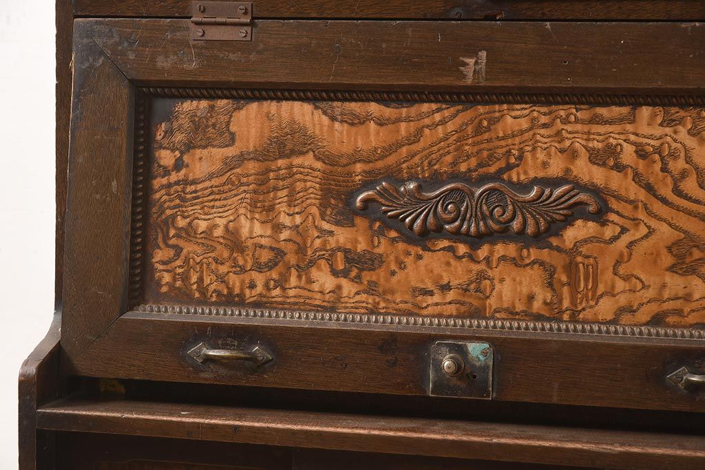 アンティーク家具 鏡付き レリーフなど凝った意匠がおしゃれなライティングビューロー(簿記机、ワークデスク)(R-040520)です。