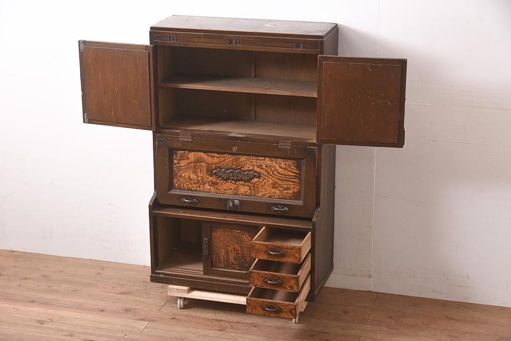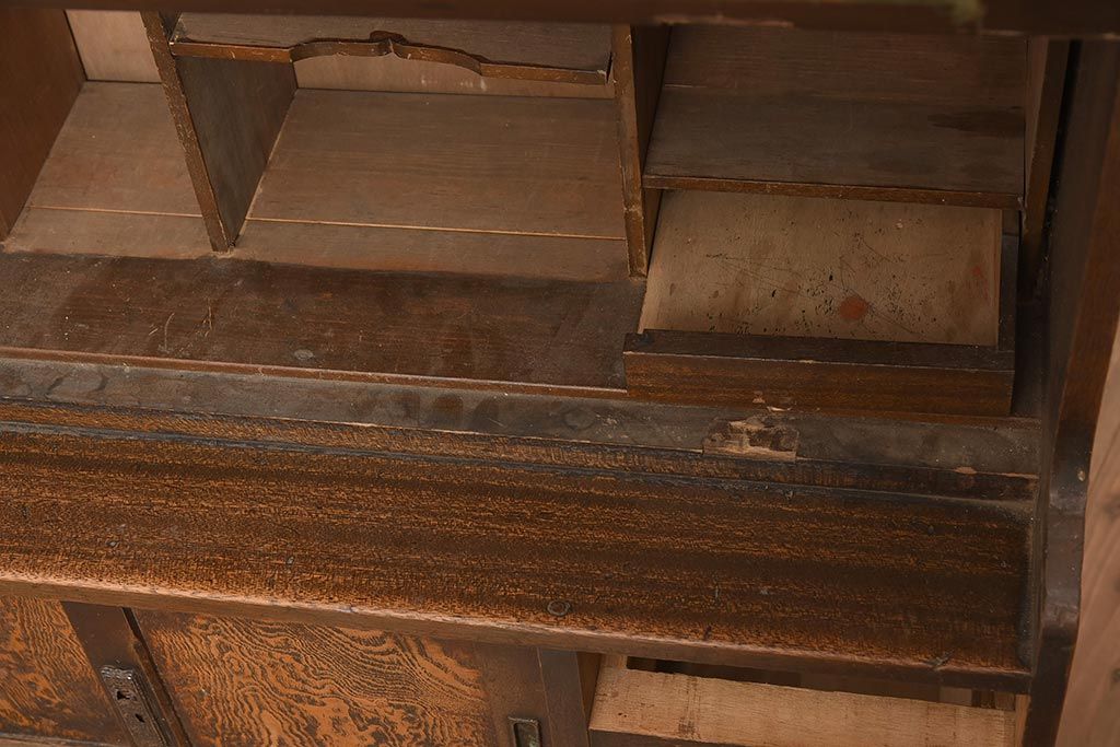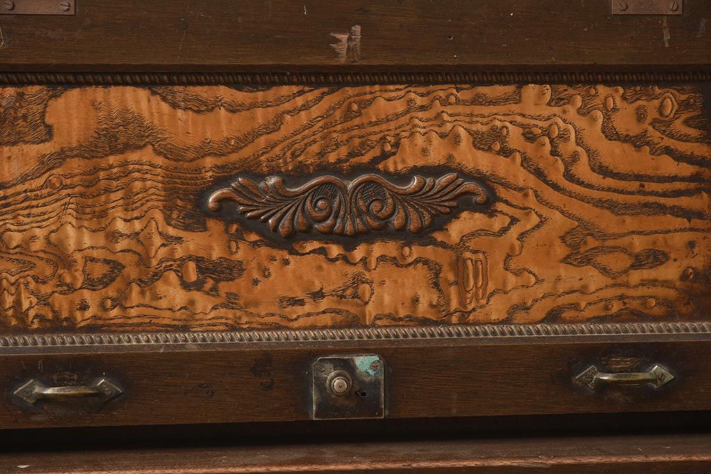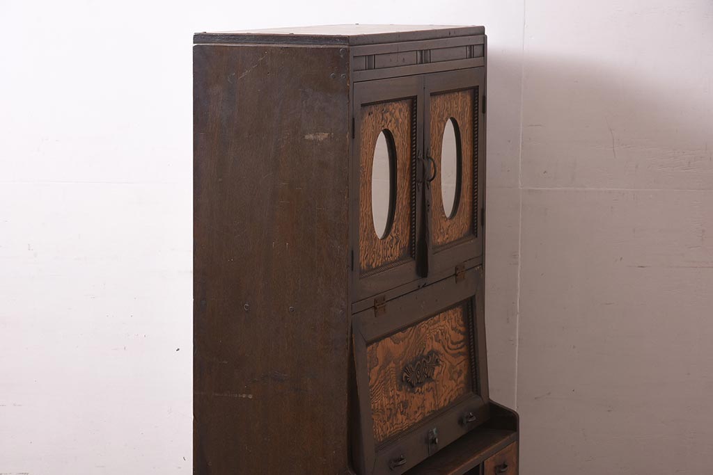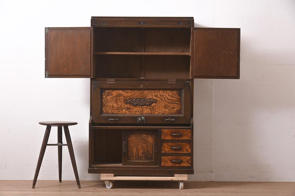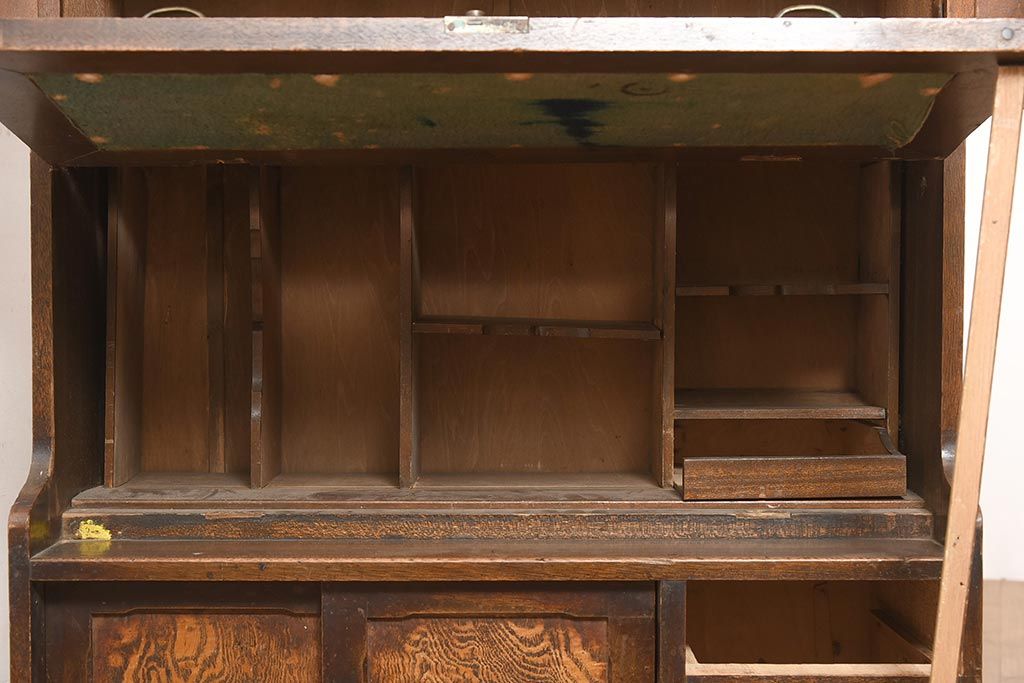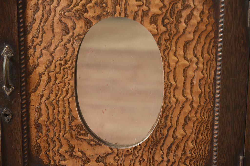 アンティーク家具 鏡付き レリーフなど凝った意匠がおしゃれなライティングビューロー(簿記机、ワークデスク)(R-040520)です。