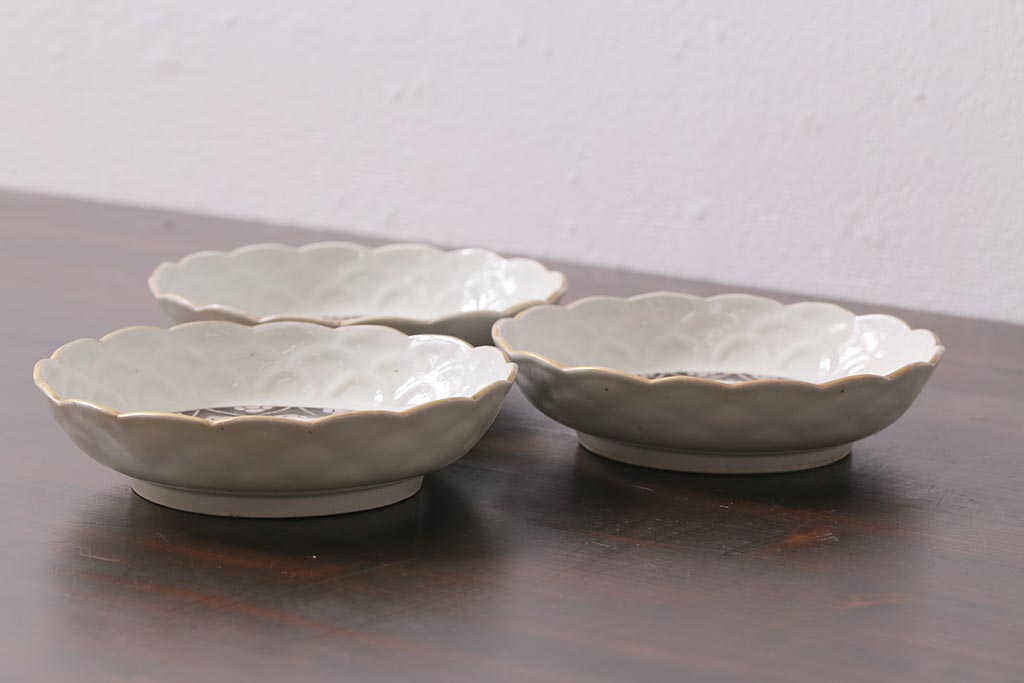 ラフジュ工房> 和食器・茶道具> 皿 > アンティーク雑貨 江戸明治期 白磁陽刻なます皿3枚セット(中皿、和食器)(R-040066)