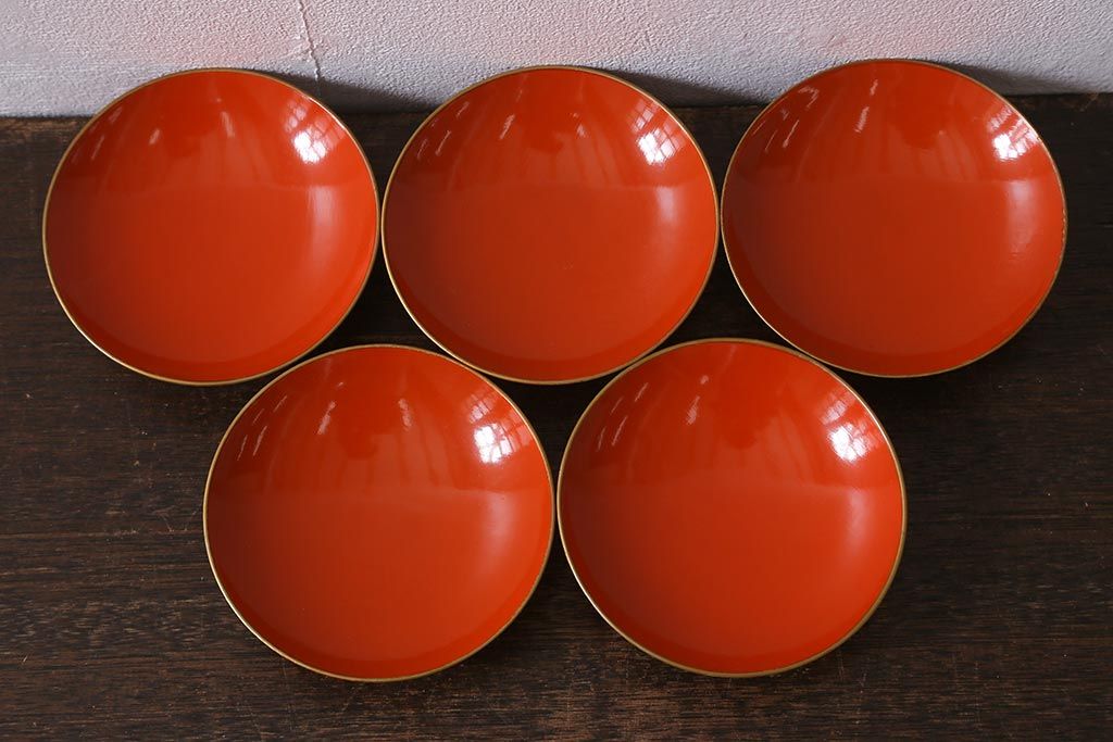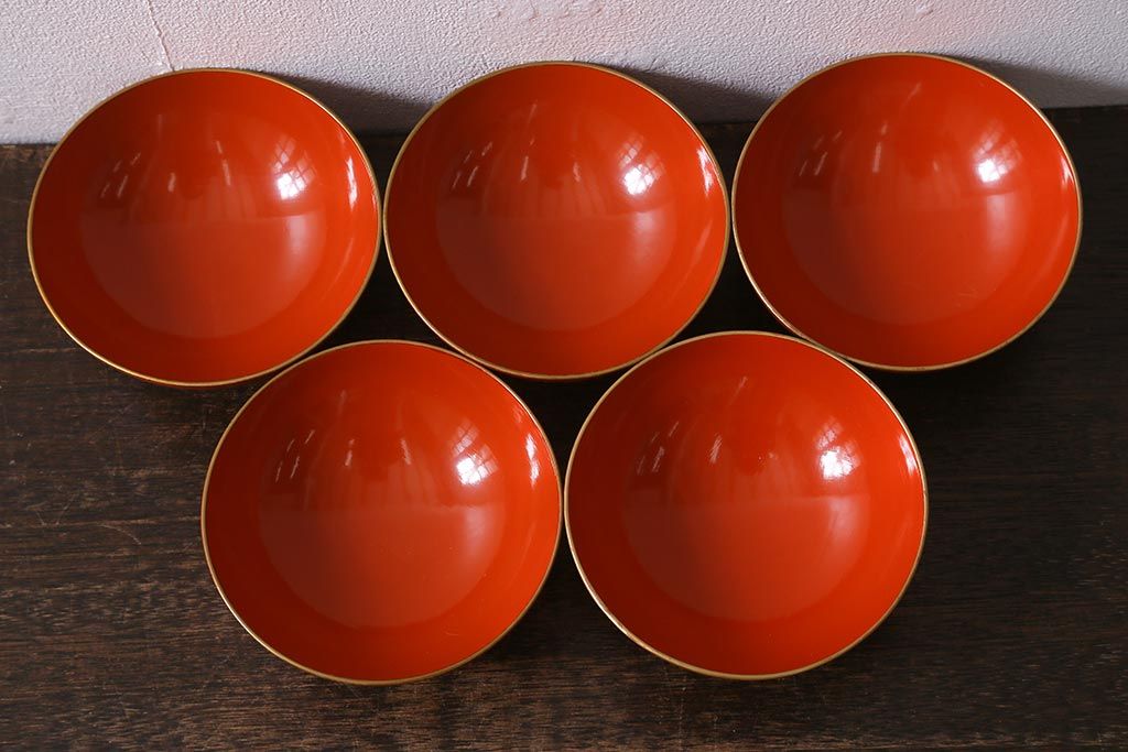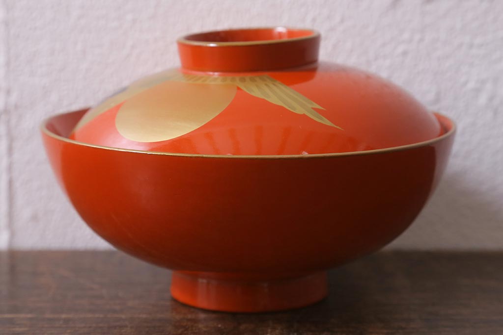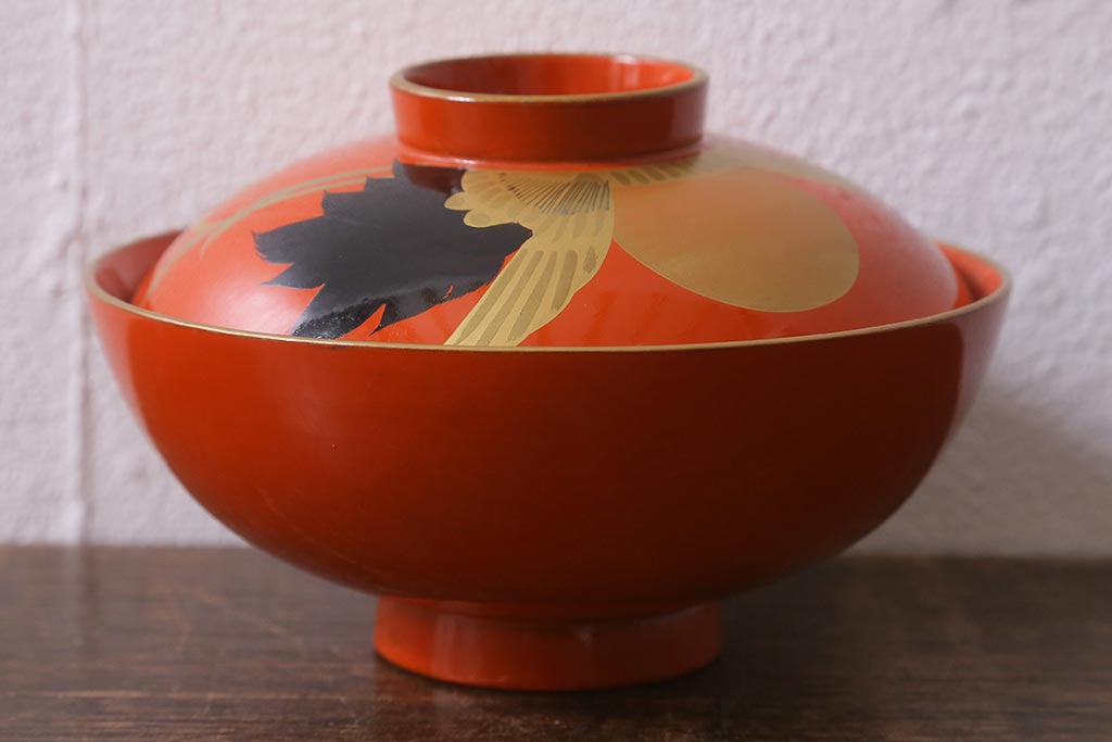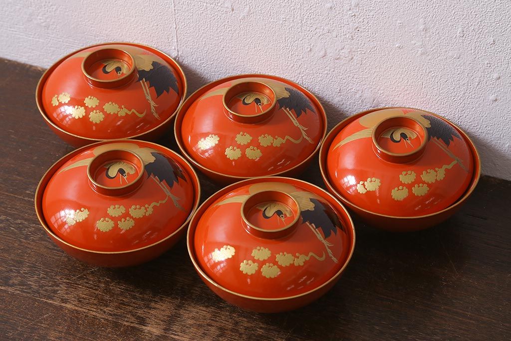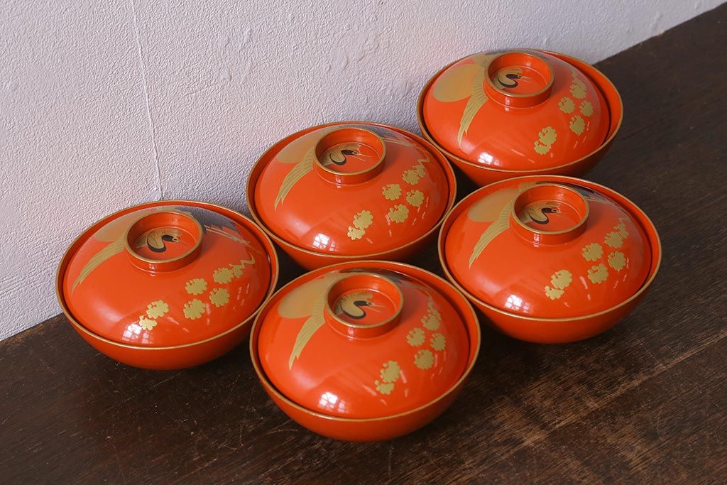 ラフジュ工房> 骨董・美術品> 骨董-漆器 > アンティーク雑貨 大正昭和初期 朱塗り 鶴蒔絵 お椀5客セット(木製漆器、和食器)(R-040552)