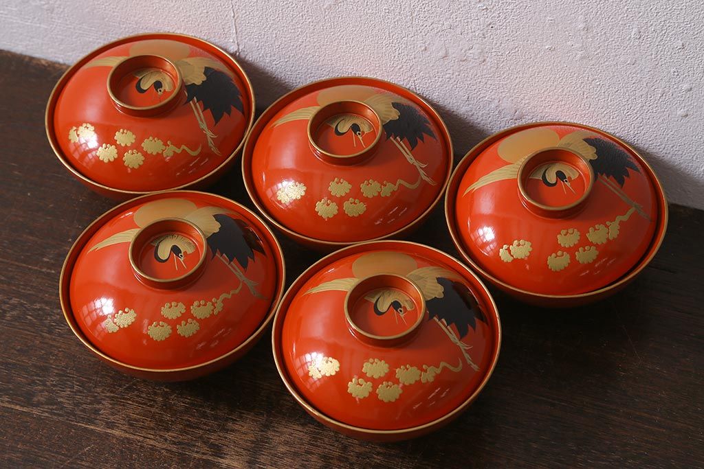 ラフジュ工房> 和食器・茶道具> お椀・茶碗 > アンティーク雑貨 大正昭和初期 朱塗り 鶴蒔絵 お椀5客セット(木製漆器、和食器)(R-040552)