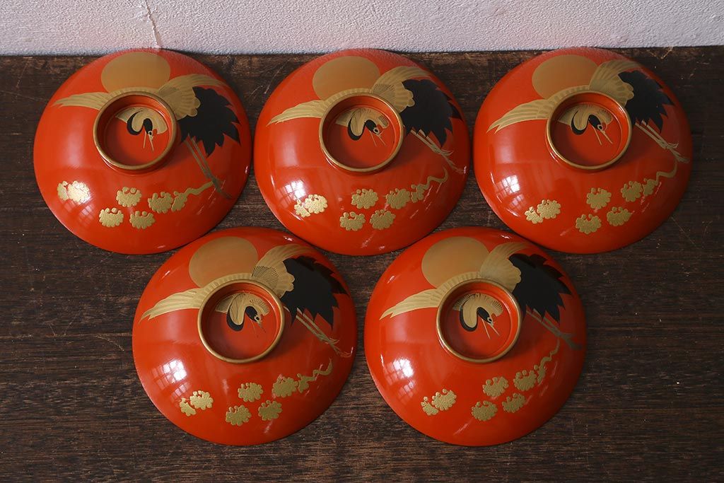 アンティーク雑貨 大正昭和初期 朱塗り 鶴蒔絵 お椀5客セット(木製漆器、和食器)(R-040552)