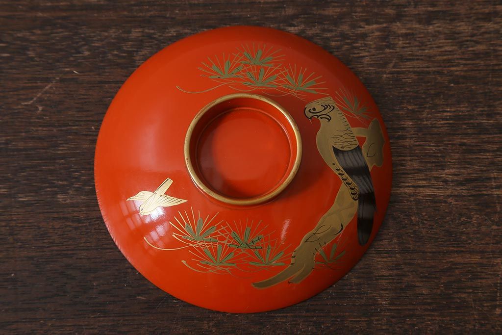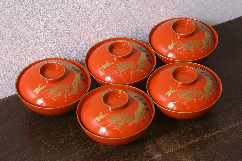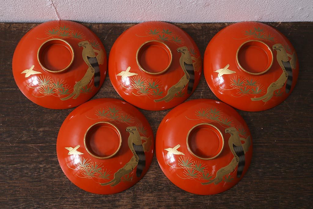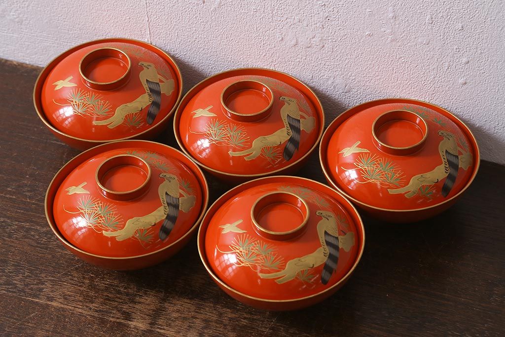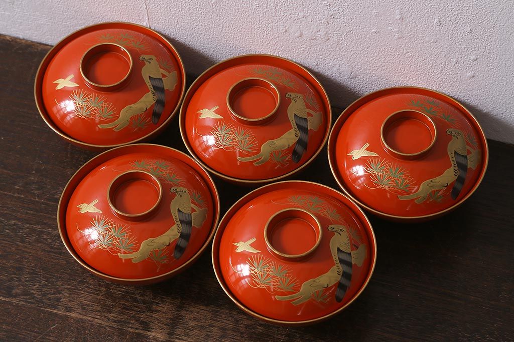 ラフジュ工房> 骨董・美術品> 骨董-漆器 > アンティーク雑貨 大正昭和初期 朱塗り 鷹蒔絵 お椀5客セット(木製漆器、和食器)(R-040556)
