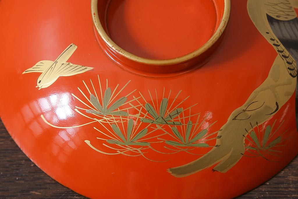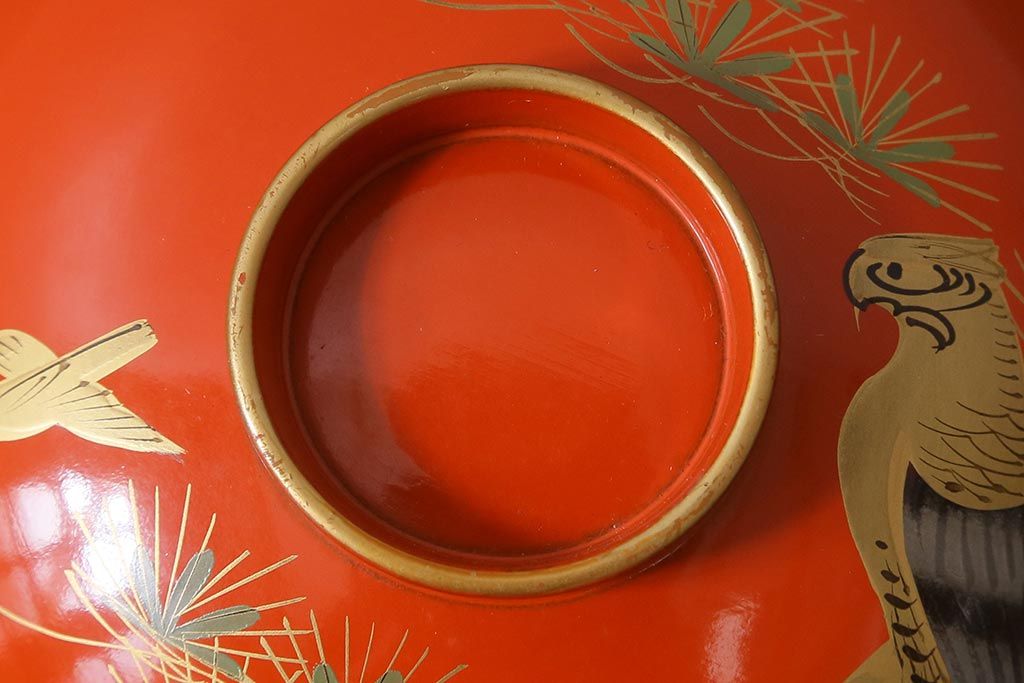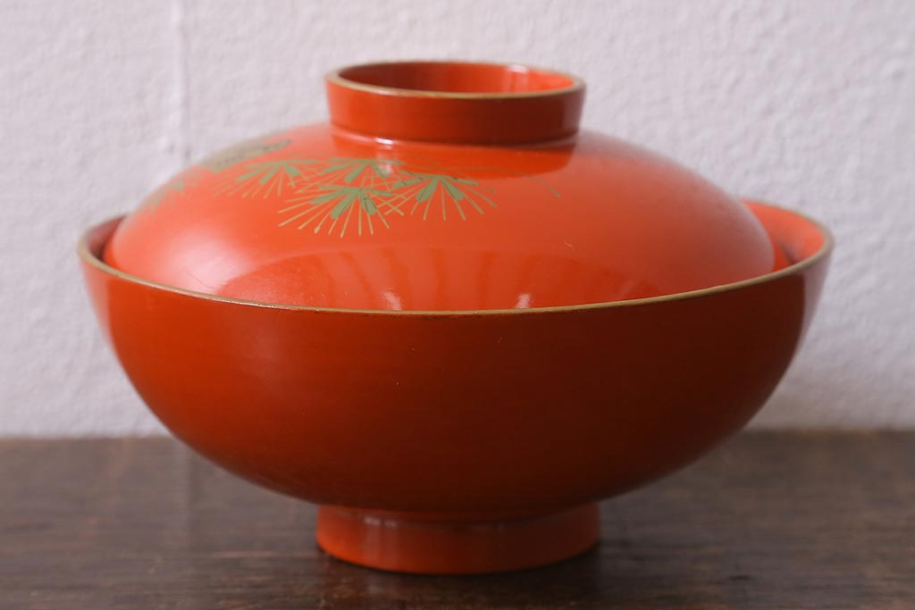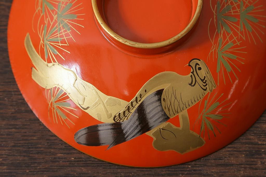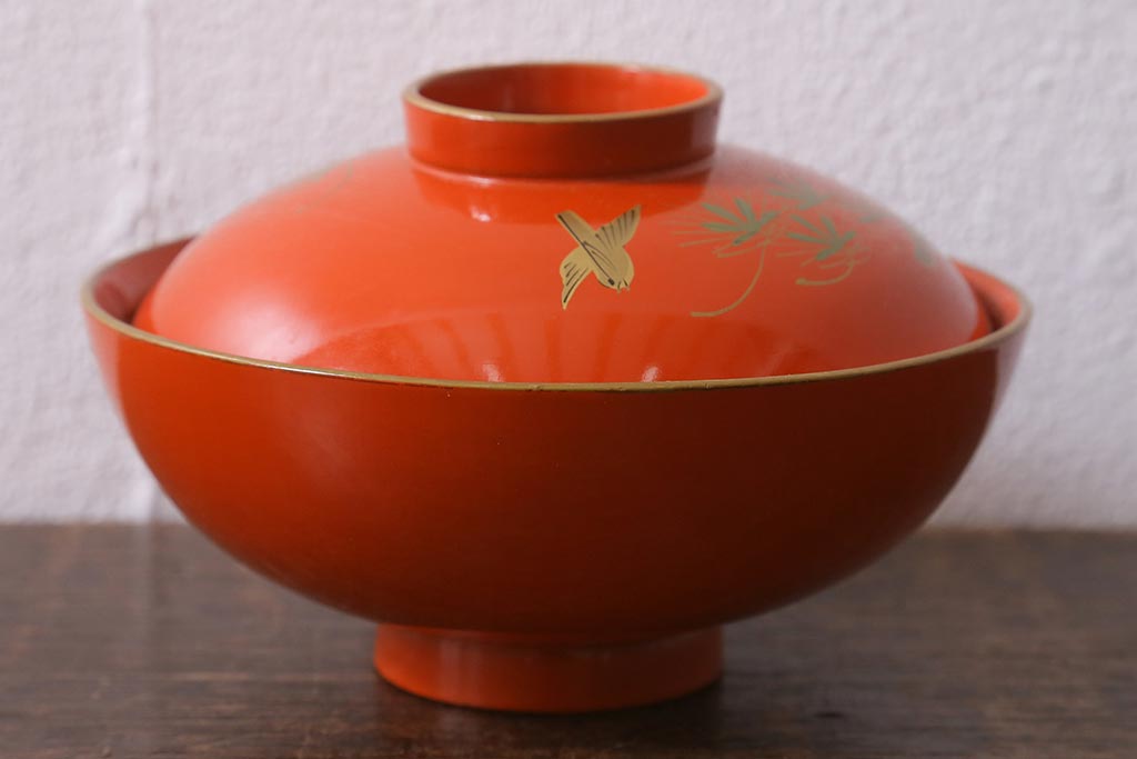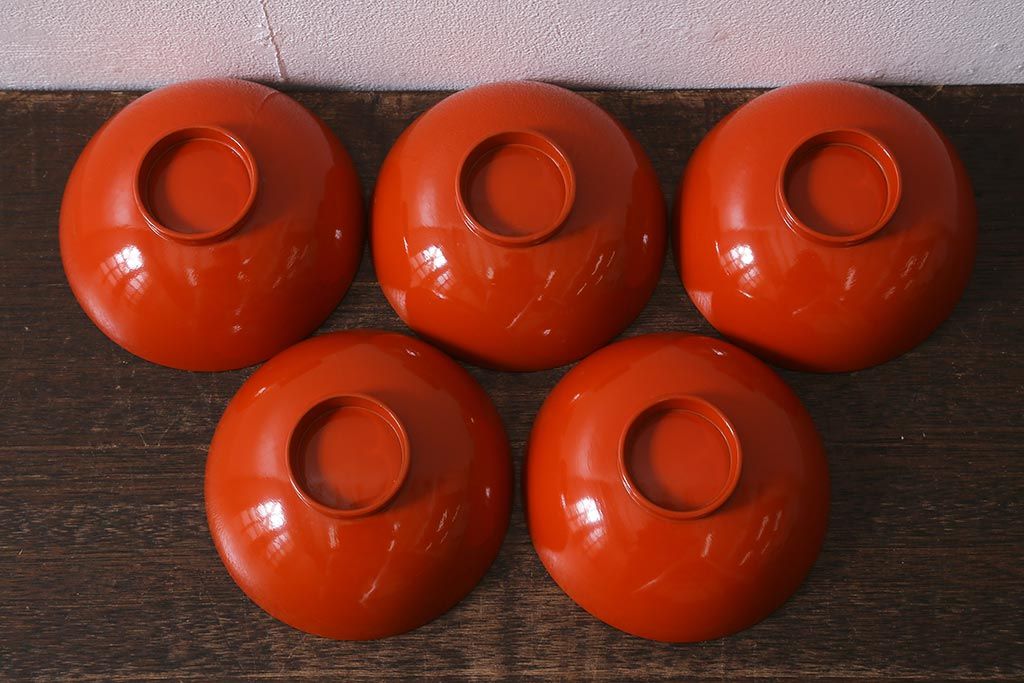 ラフジュ工房> 骨董・美術品> 骨董-漆器 > アンティーク雑貨 大正昭和初期 朱塗り 鷹蒔絵 お椀5客セット(木製漆器、和食器)(R-040556)