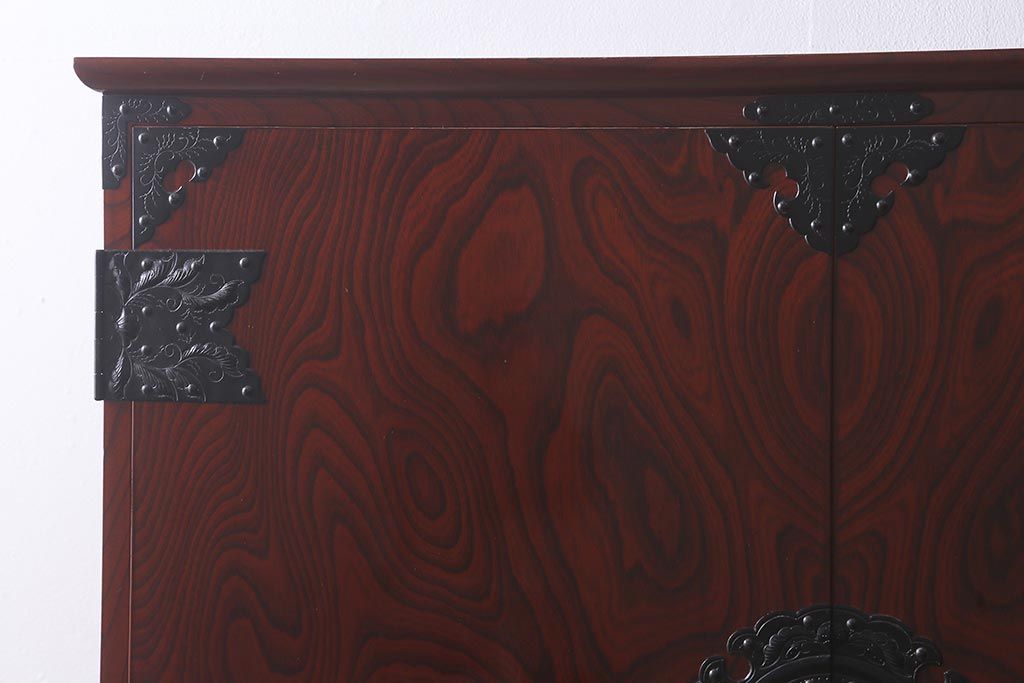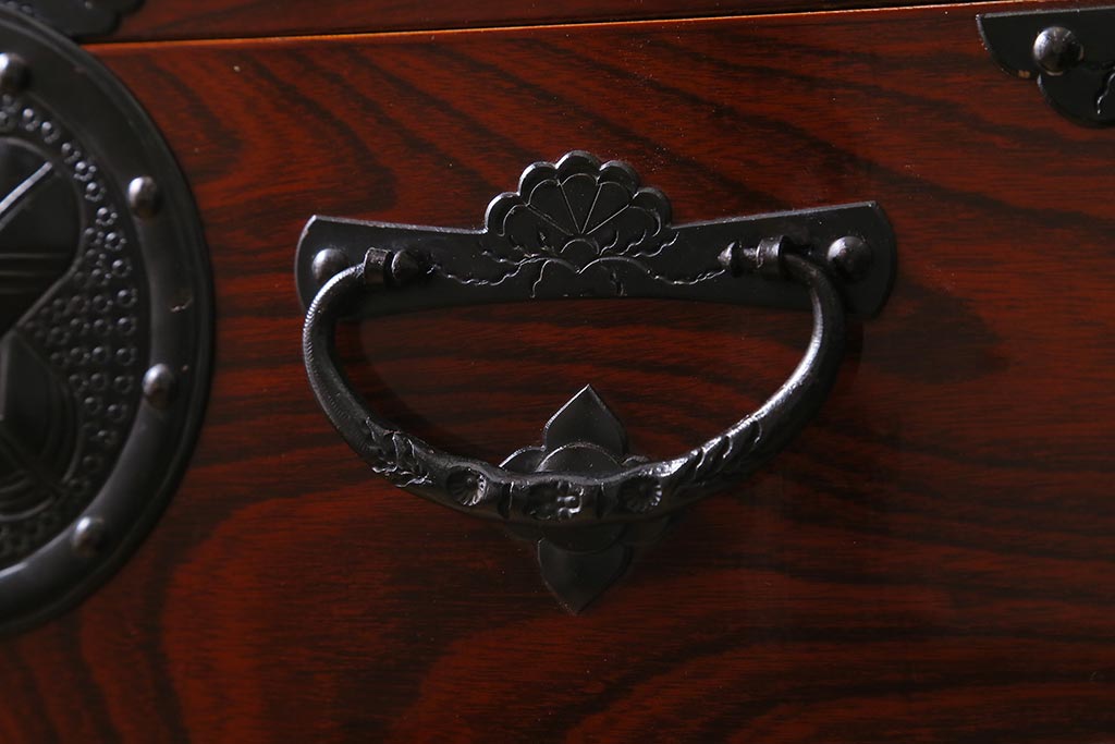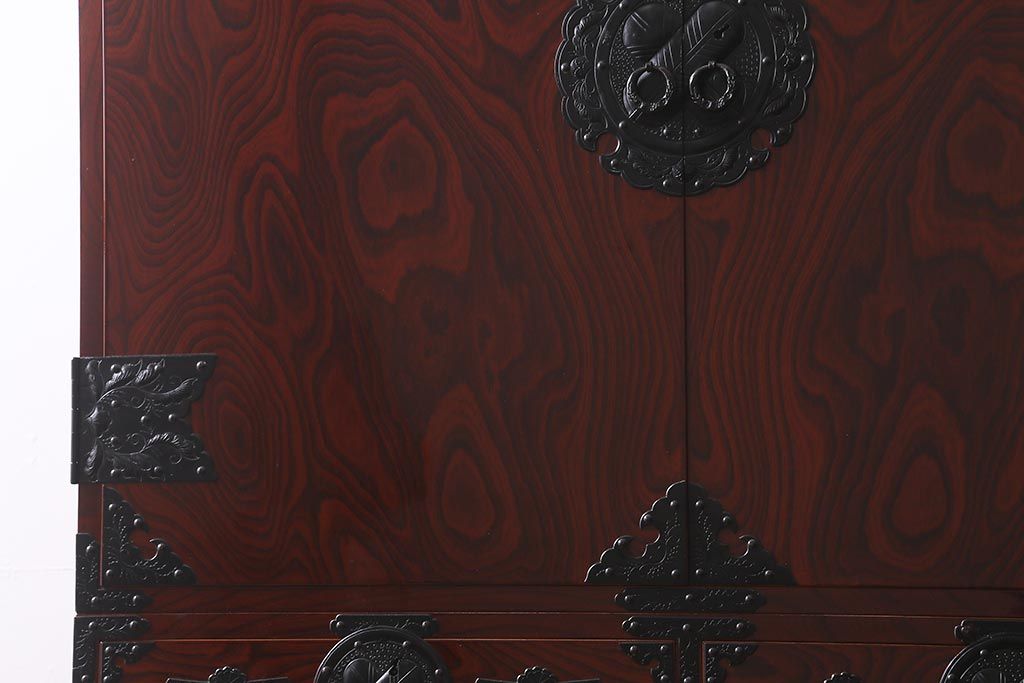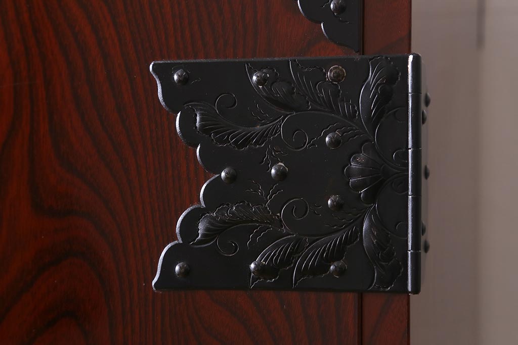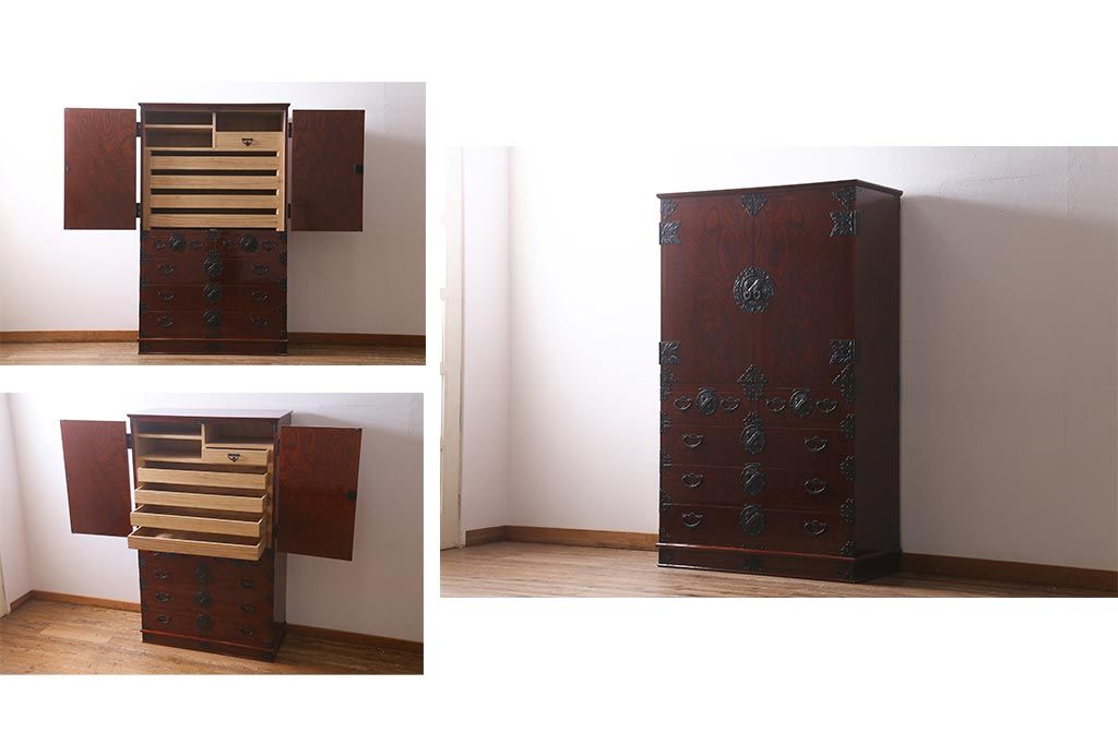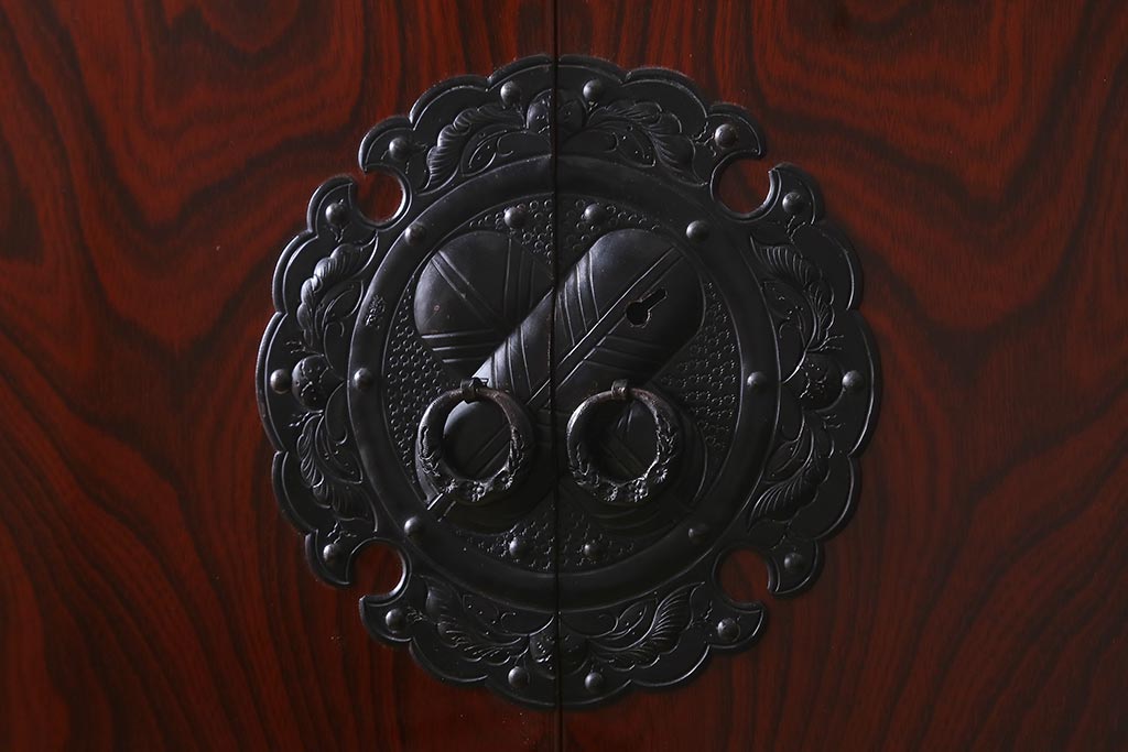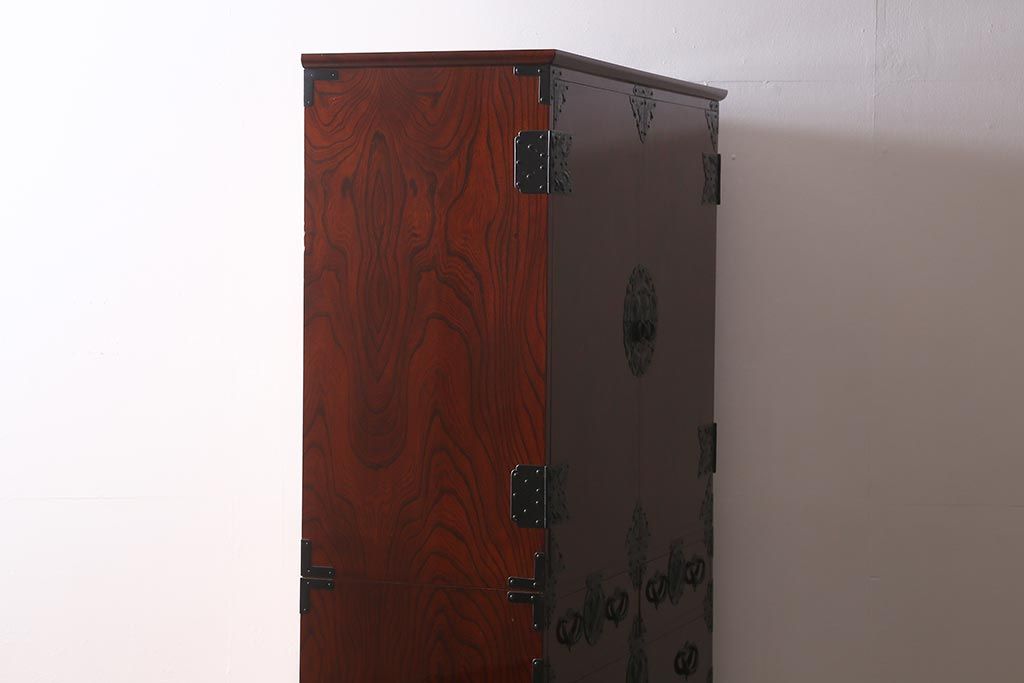 ラフジュ工房> 民芸家具 > ビンテージ家具 岩谷堂箪笥 銘入り「菊政」 手打ち金具・鷹の羽紋 木地呂塗り 衣装盆付き衣装箪笥(和タンス、ヴィンテージ)(R-040472)