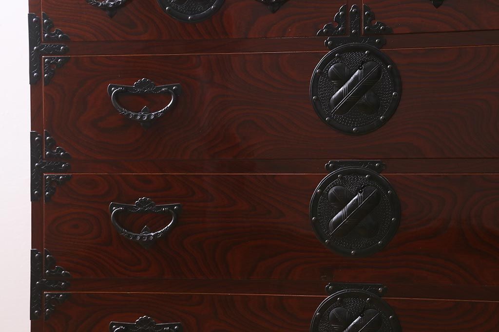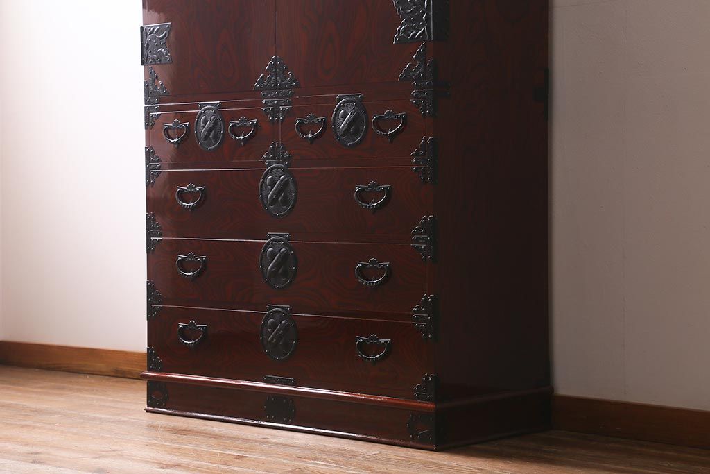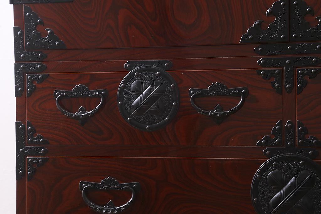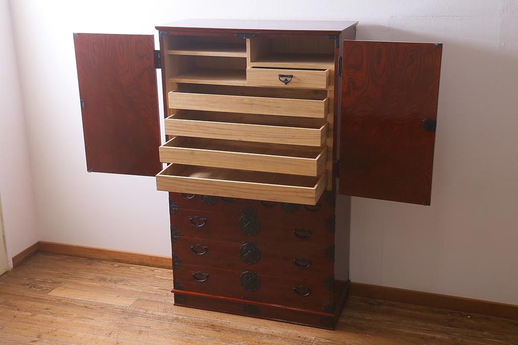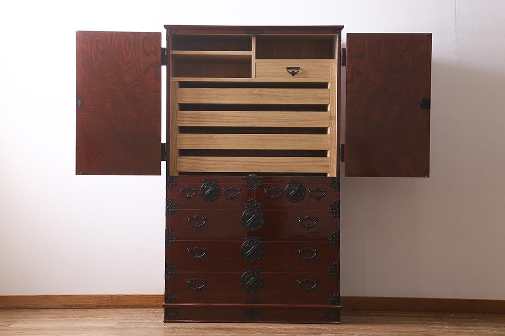 ビンテージ家具 岩谷堂箪笥 銘入り「菊政」 手打ち金具・鷹の羽紋 木地呂塗り 衣装盆付き衣装箪笥(和タンス、ヴィンテージ)(R-040472)