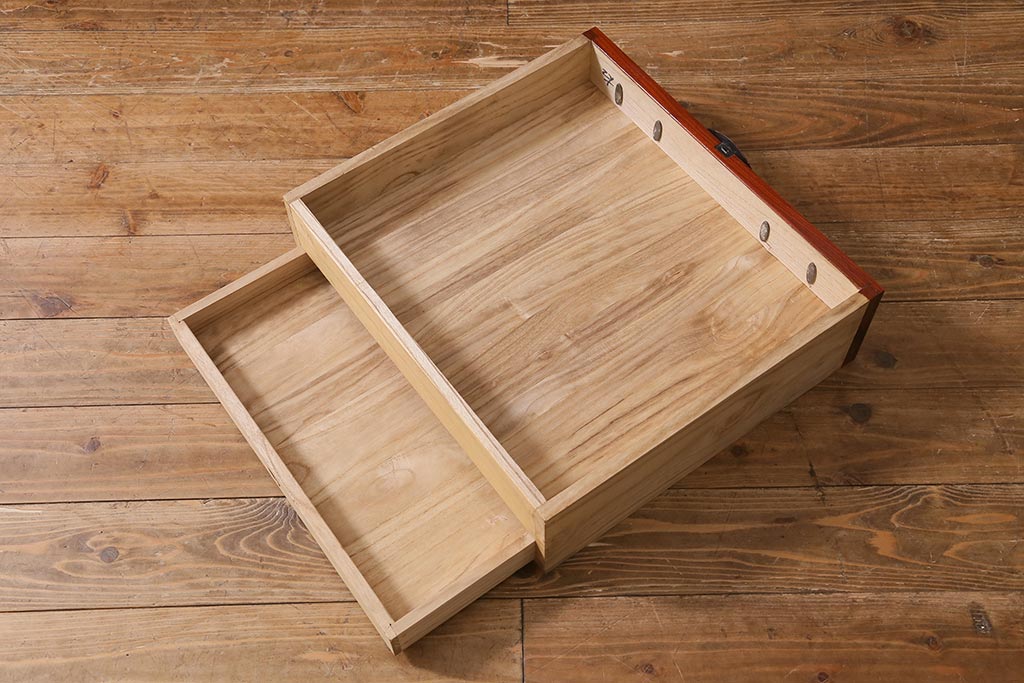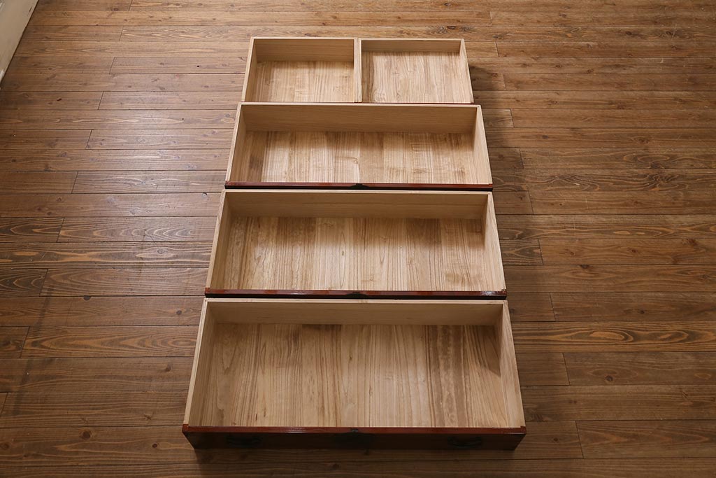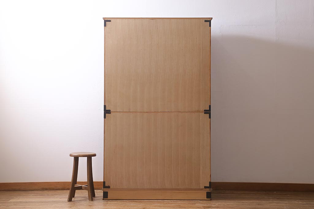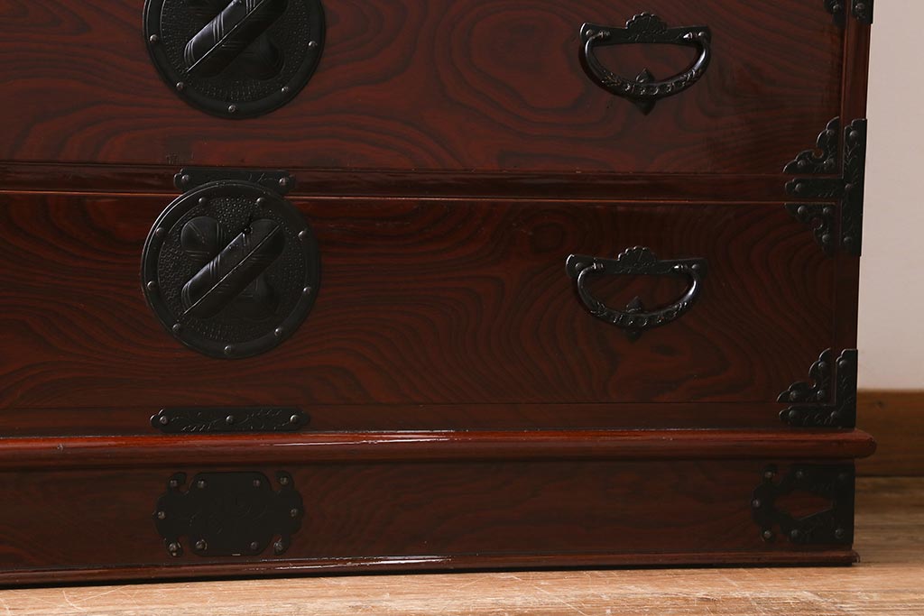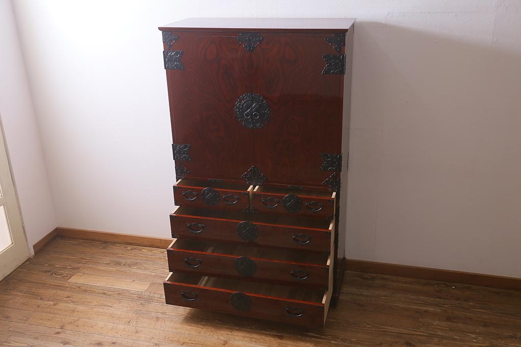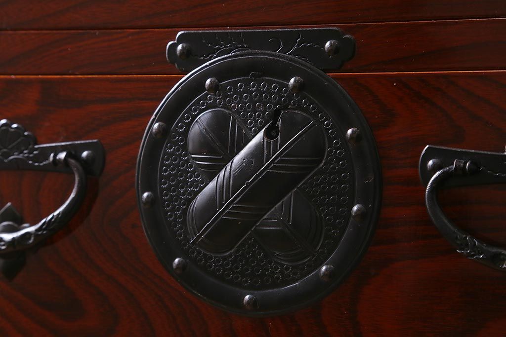 ビンテージ家具 岩谷堂箪笥 銘入り「菊政」 手打ち金具・鷹の羽紋 木地呂塗り 衣装盆付き衣装箪笥(和タンス、ヴィンテージ)(R-040472)