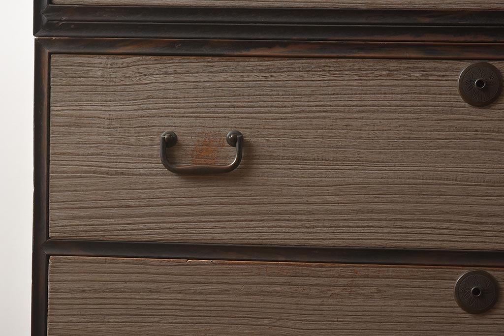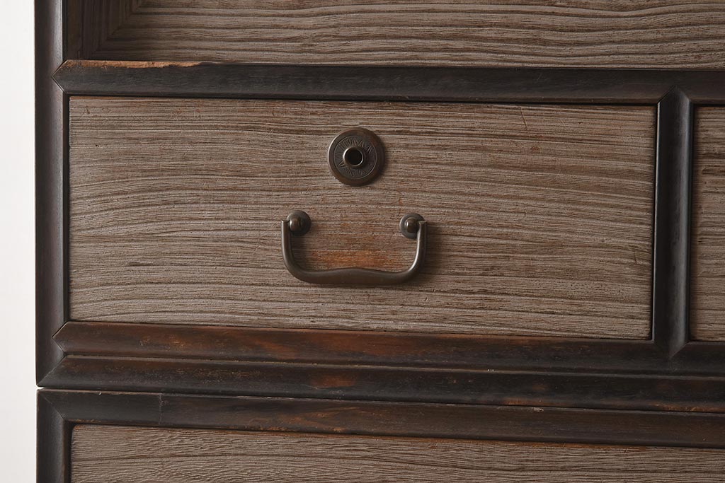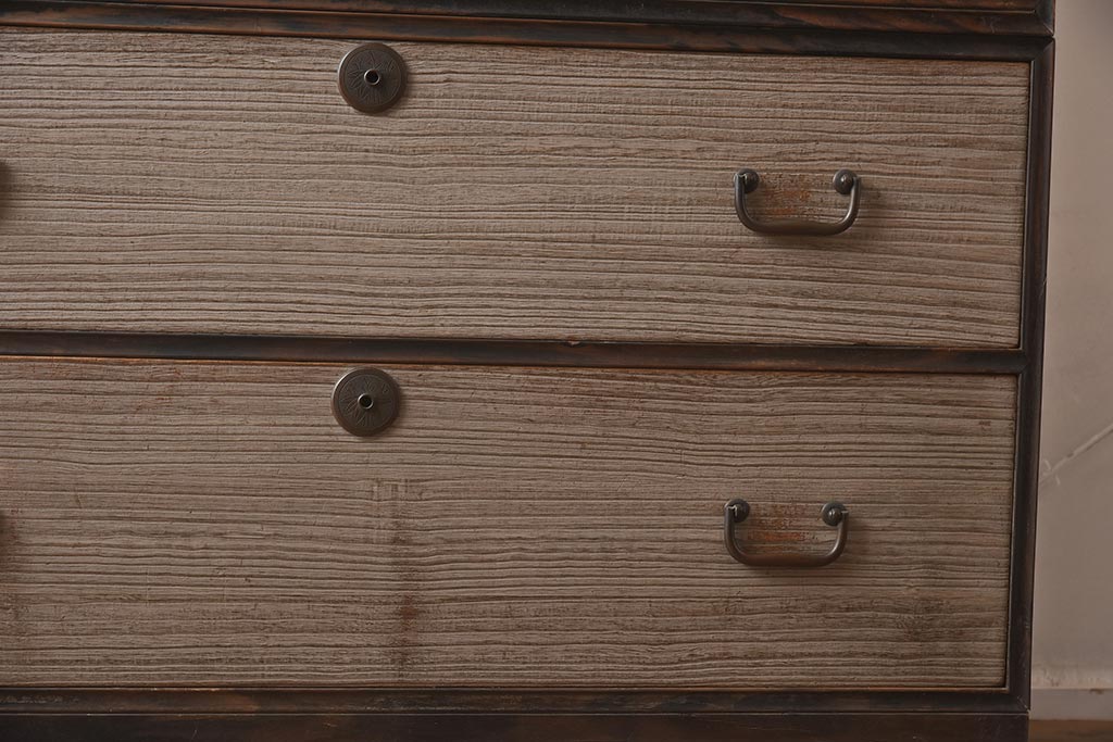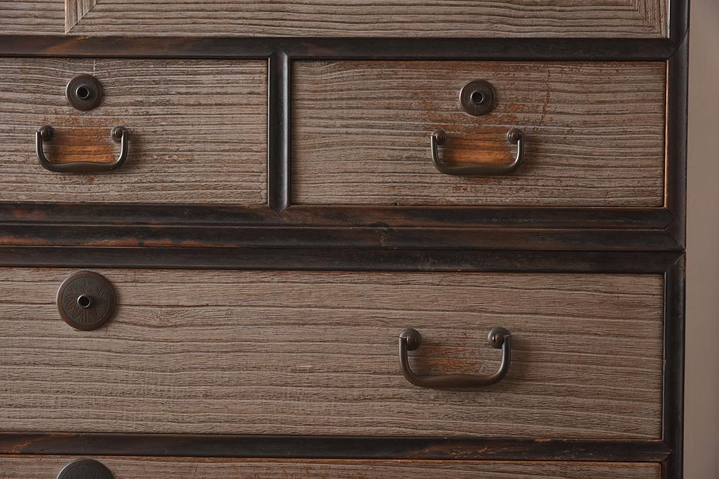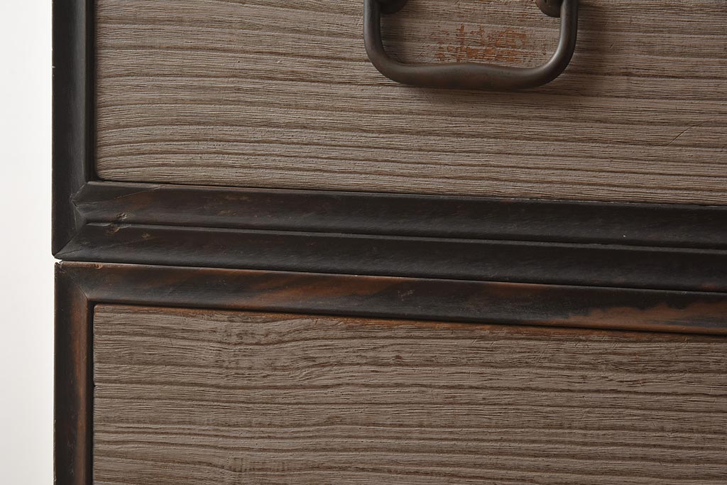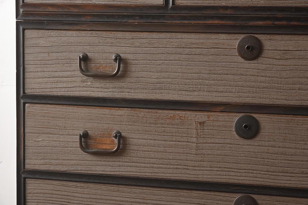 和箪笥> 衣装箪笥 > 【簡易リペア限定品】アンティーク建具 和製アンティーク 昭和中期 総桐材 黒檀材 古い木肌が味わい深い上手物の3段重ね箪笥(衣装箪笥、引き出し、桐箪笥、桐たんす、和タンス、収納箪笥)(R-040622)