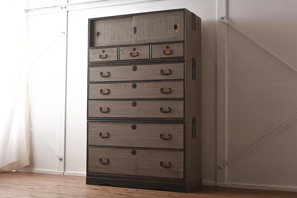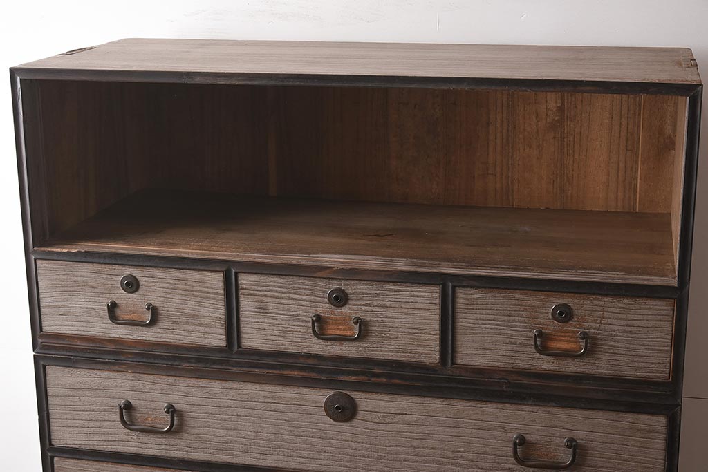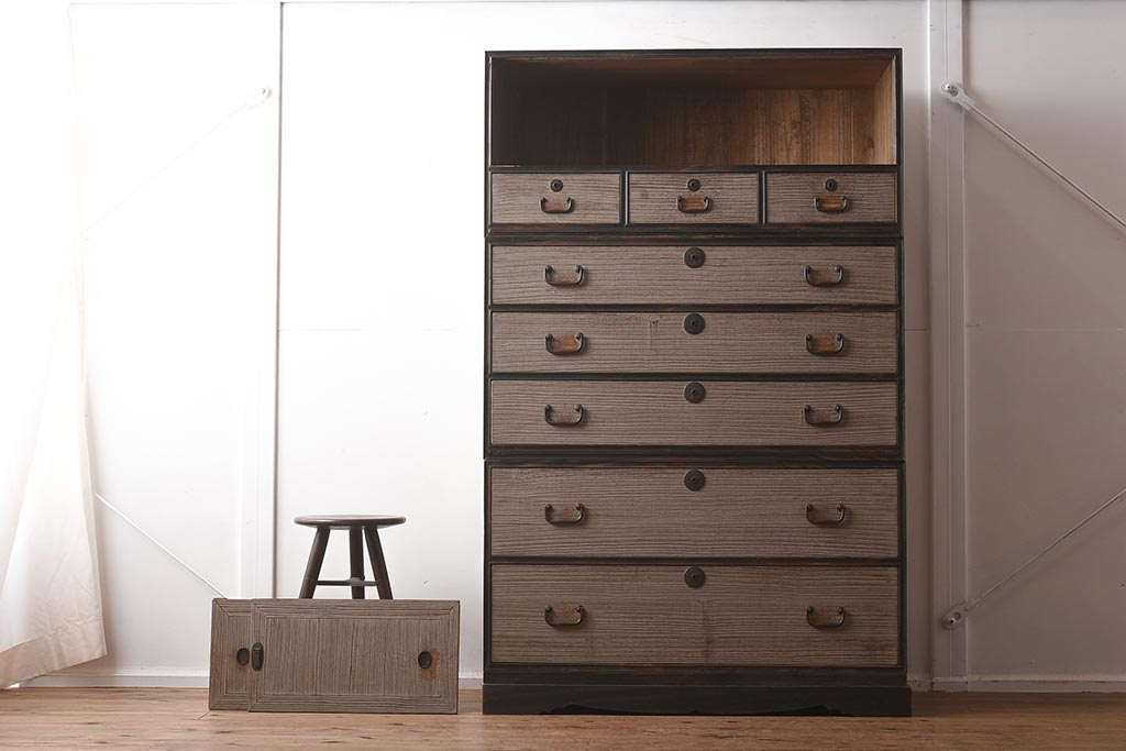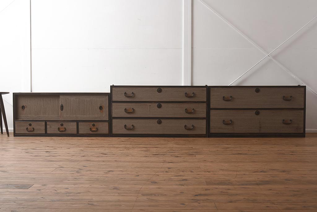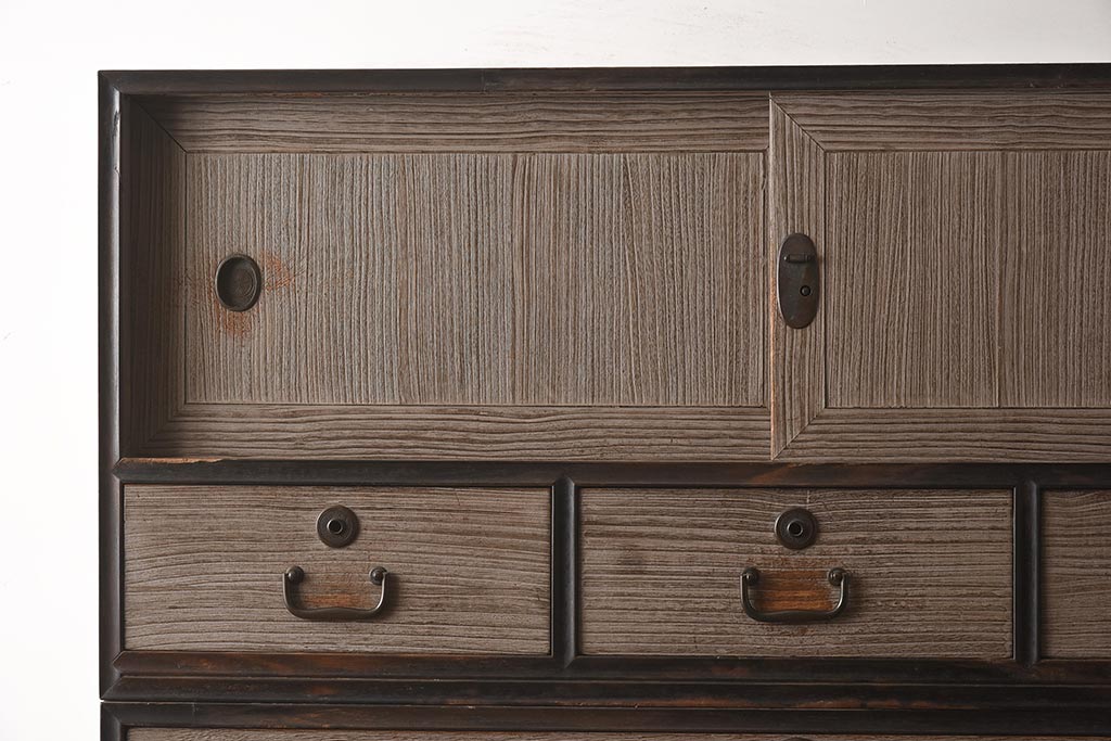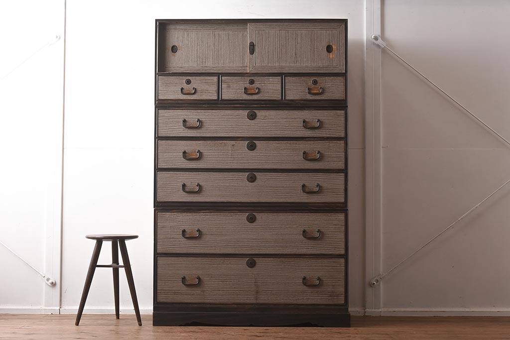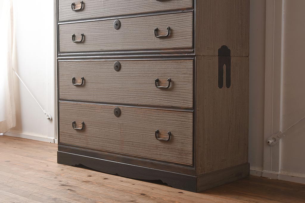和箪笥> 衣装箪笥 > 【簡易リペア限定品】アンティーク建具 和製アンティーク 昭和中期 総桐材 黒檀材 古い木肌が味わい深い上手物の3段重ね箪笥(衣装箪笥、引き出し、桐箪笥、桐たんす、和タンス、収納箪笥)(R-040622)