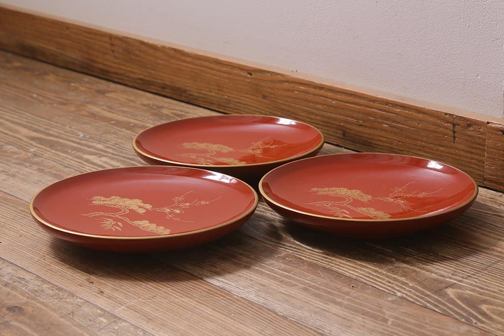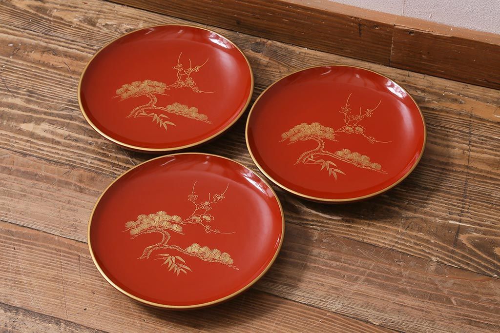 ラフジュ工房> 和食器・茶道具> 皿 > 古民具 大正昭和初期 輪島塗 松竹梅 沈金蒔絵菓子皿3枚セット(菓子盆、漆器、木製皿)(R-040510)