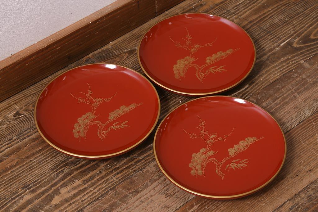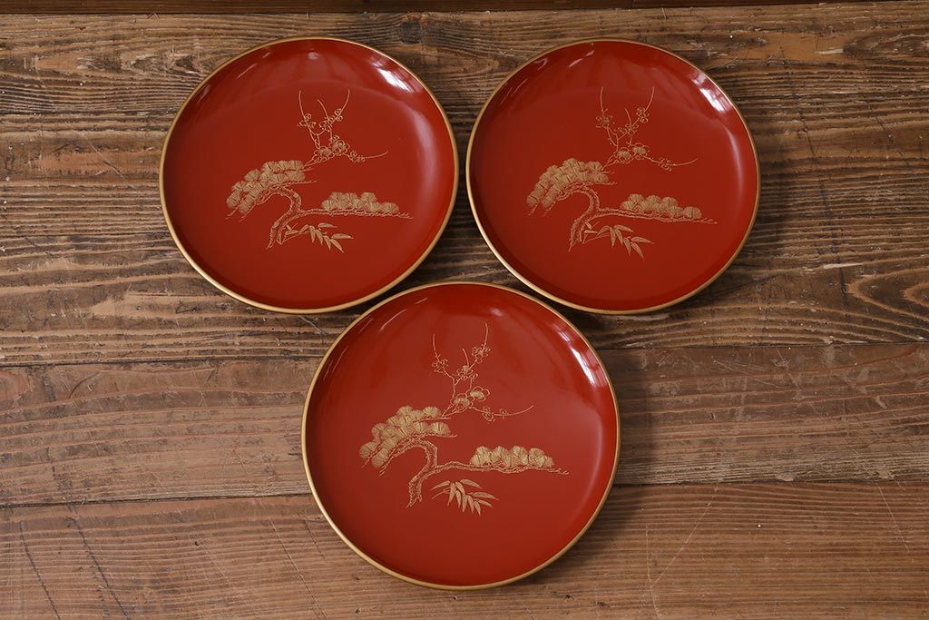 古民具 大正昭和初期 輪島塗 松竹梅 沈金蒔絵菓子皿3枚セット(菓子盆、漆器、木製皿)(R-040510)