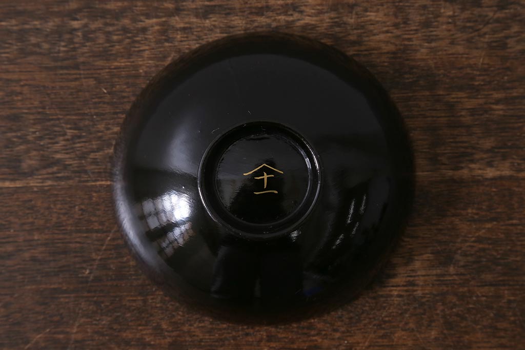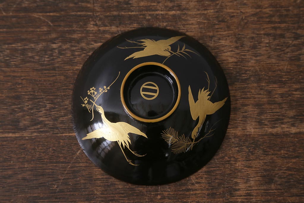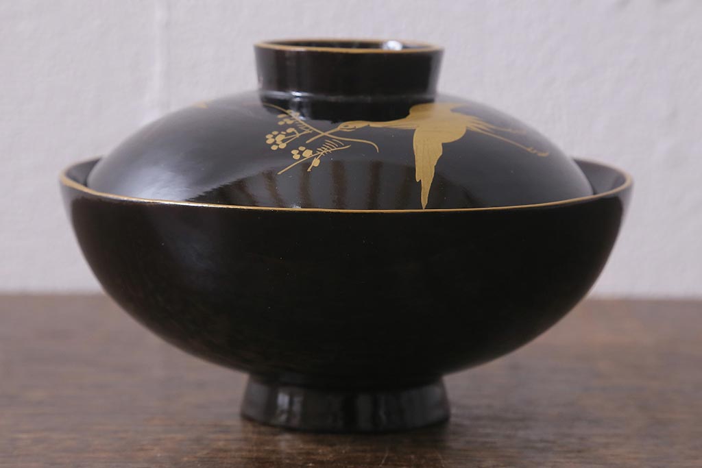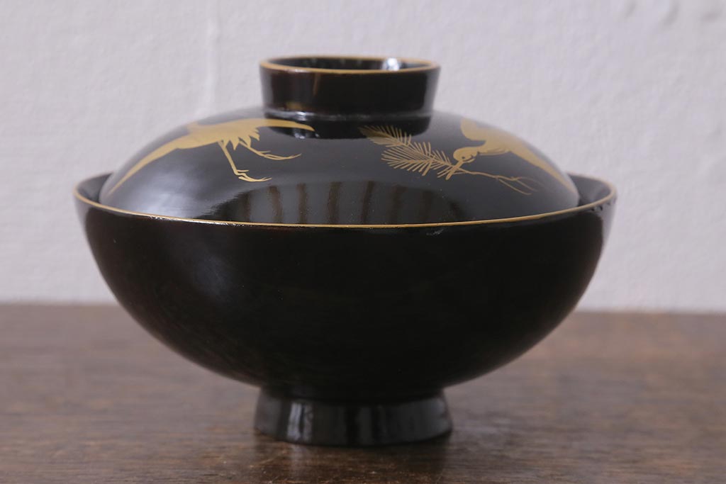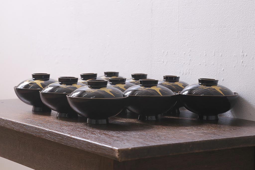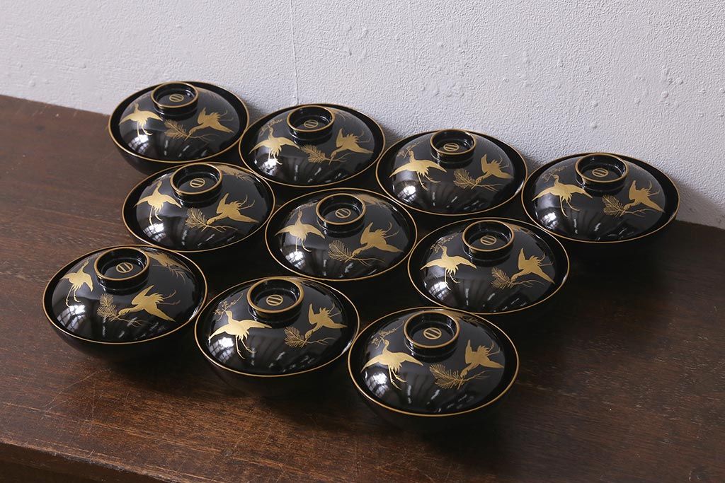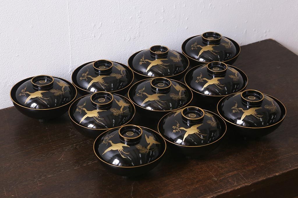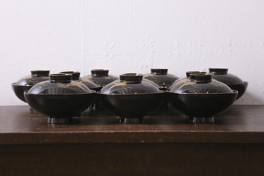 ラフジュ工房> 和食器・茶道具> お椀・茶碗 > 古民具 大正昭和初期 黒漆鶴蒔絵蓋付木製椀10客セット(お椀、漆器)(R-040548)
