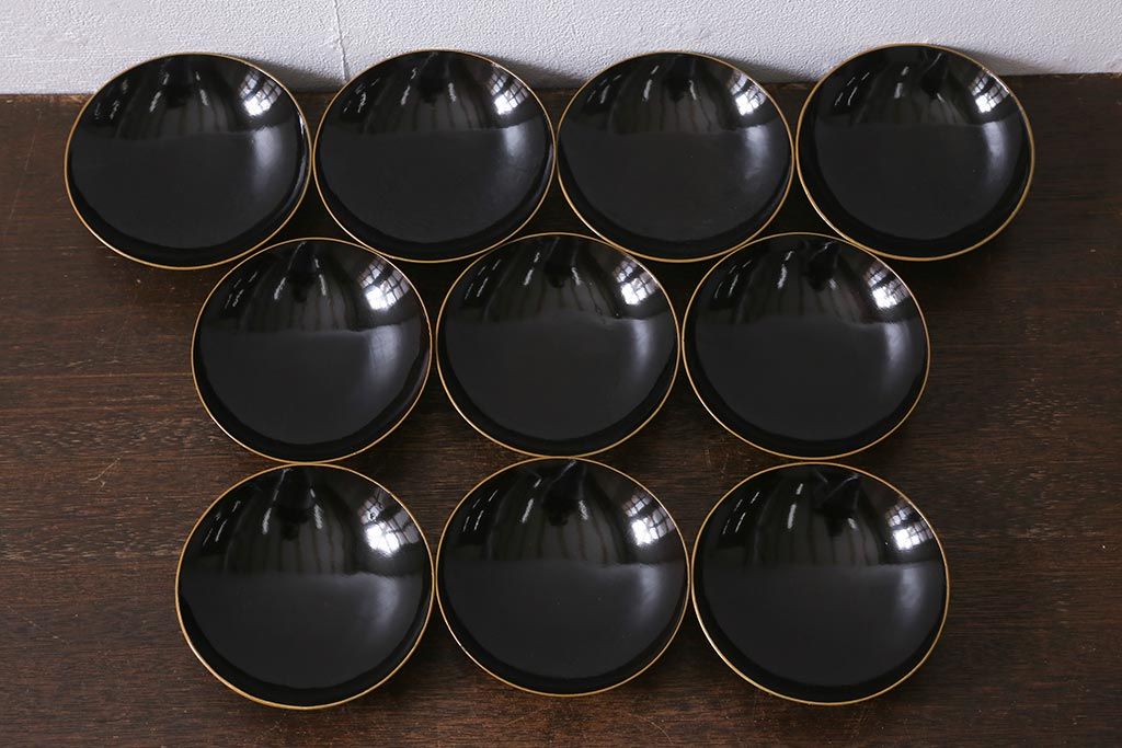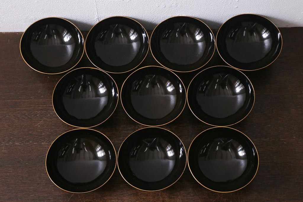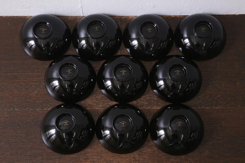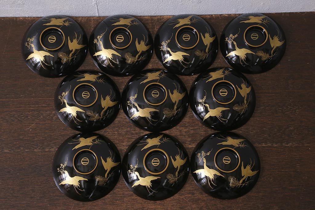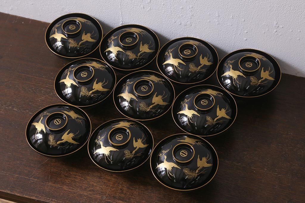 古民具 大正昭和初期 黒漆鶴蒔絵蓋付木製椀10客セット(お椀、漆器)(R-040548)