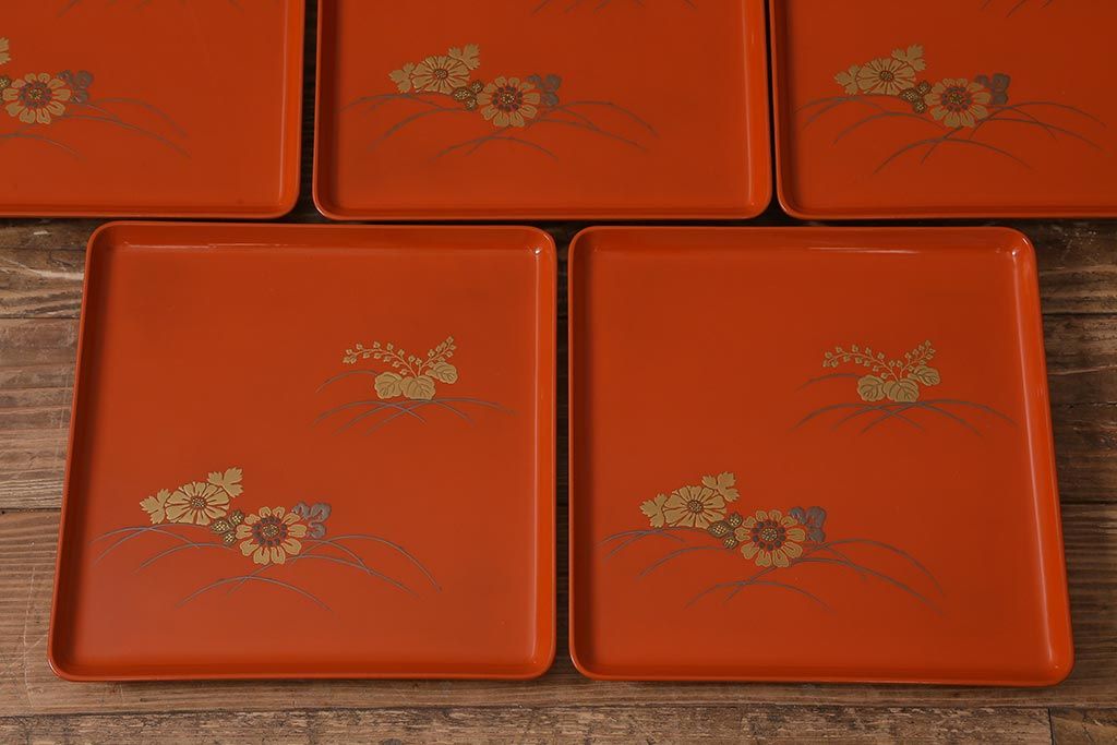 ラフジュ工房> 骨董・美術品> 骨董-漆器 > アンティーク雑貨 古民具・骨董 明治〜大正期 輪島塗木製蒔絵膳5枚セット(漆器、お盆)(R-040119)