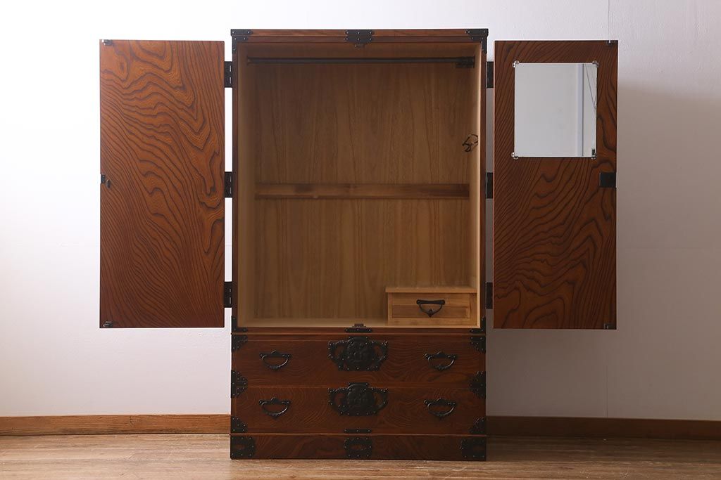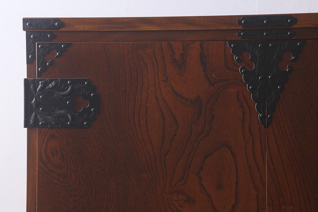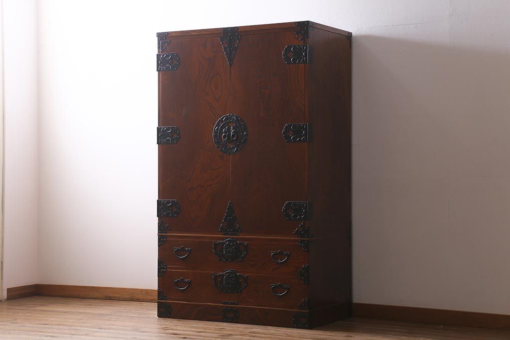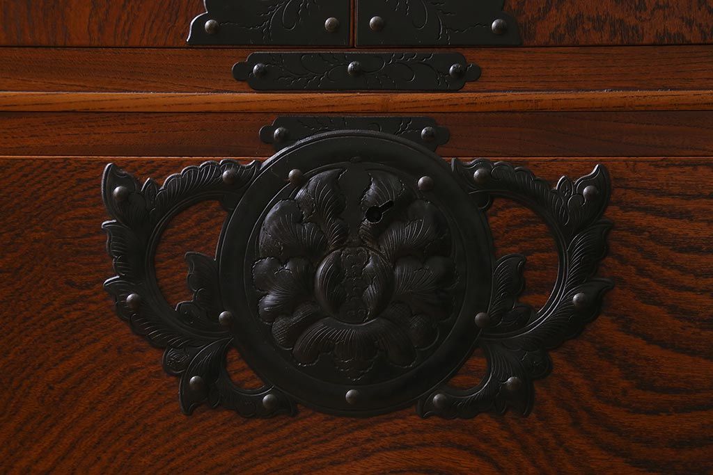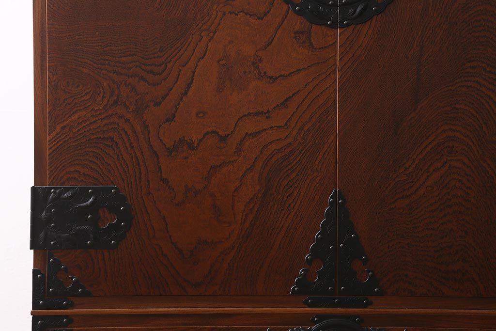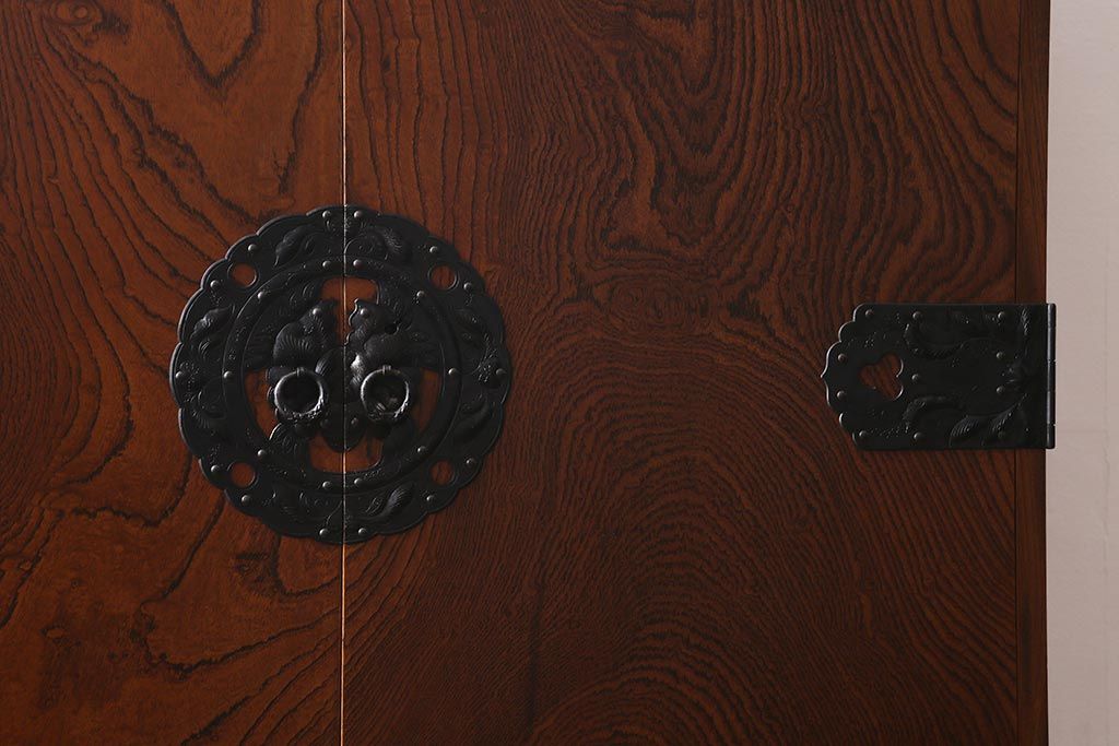 ビンテージ家具 岩谷堂箪笥 銘入り「菊政」 手打ち金具 漆塗り 美しい杢目と重厚感のある金具が魅力的なワードローブ(洋服タンス)(R-040479)