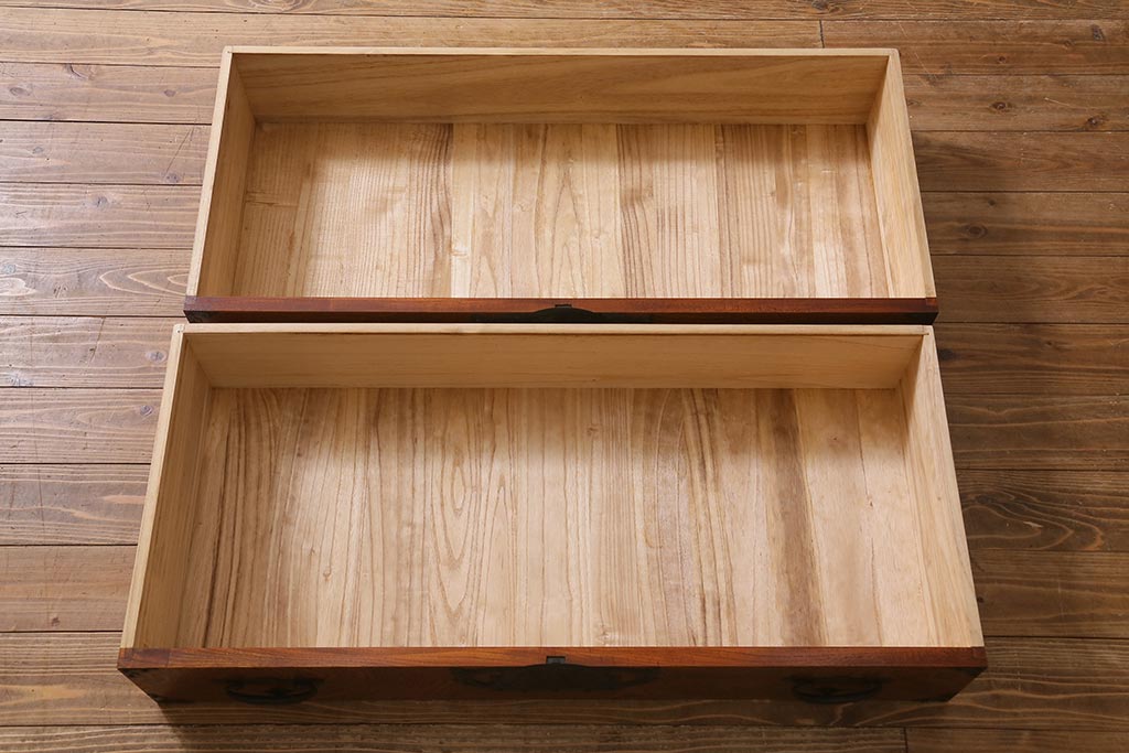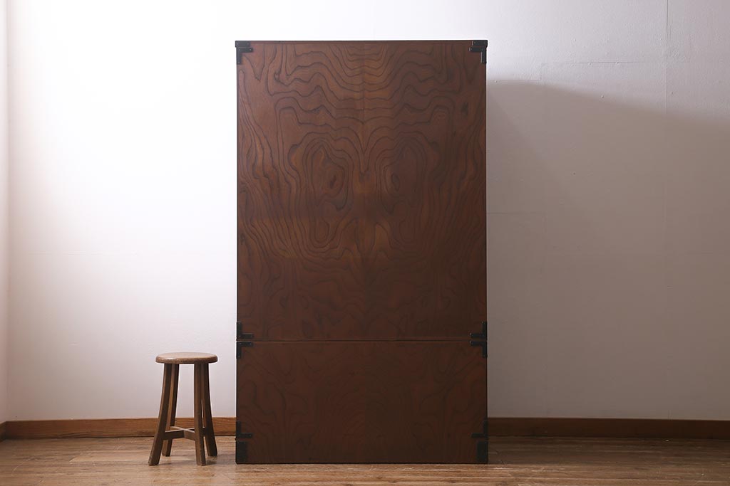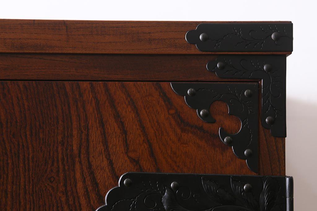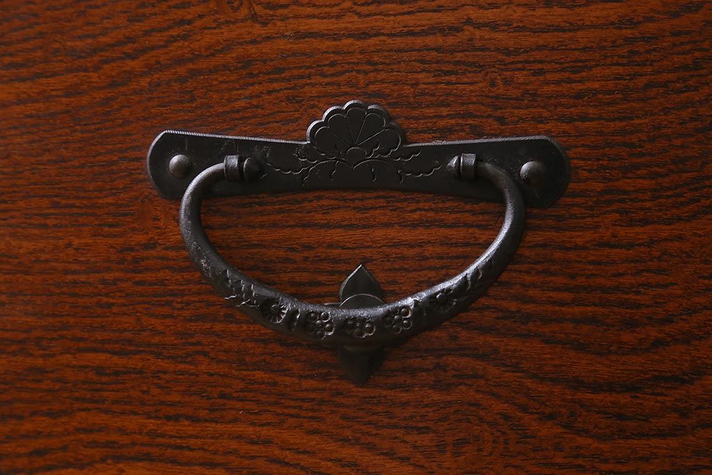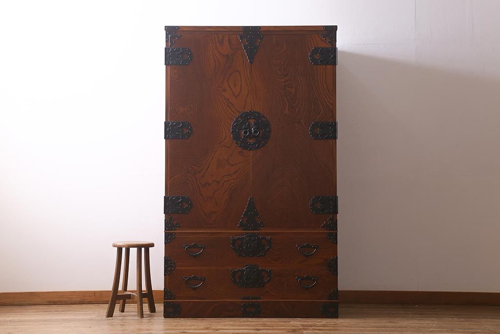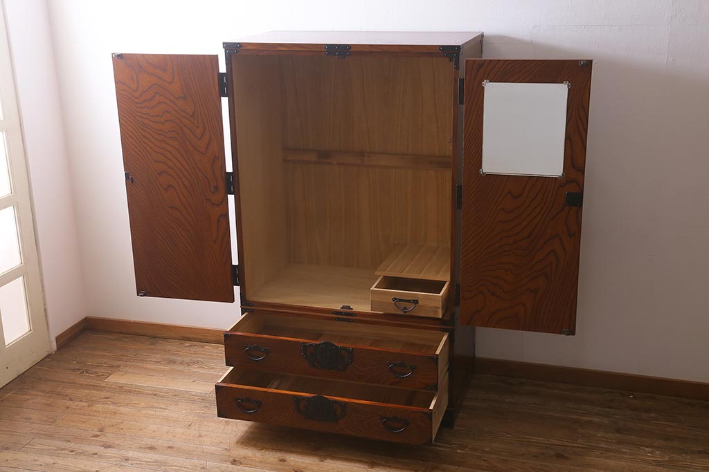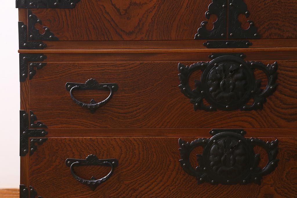ビンテージ家具 岩谷堂箪笥 銘入り「菊政」 手打ち金具 漆塗り 美しい杢目と重厚感のある金具が魅力的なワードローブ(洋服タンス)(R-040479)
