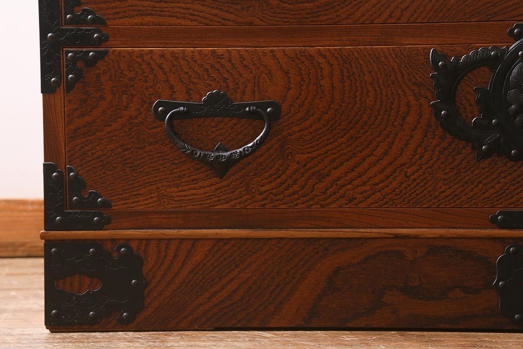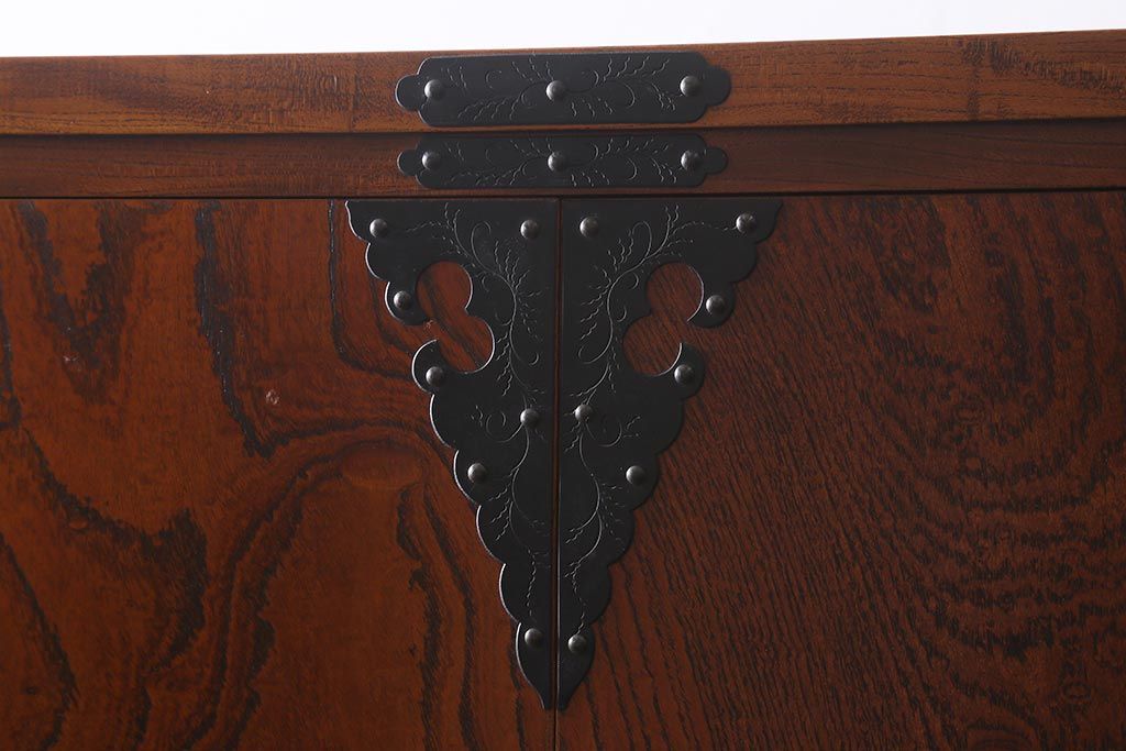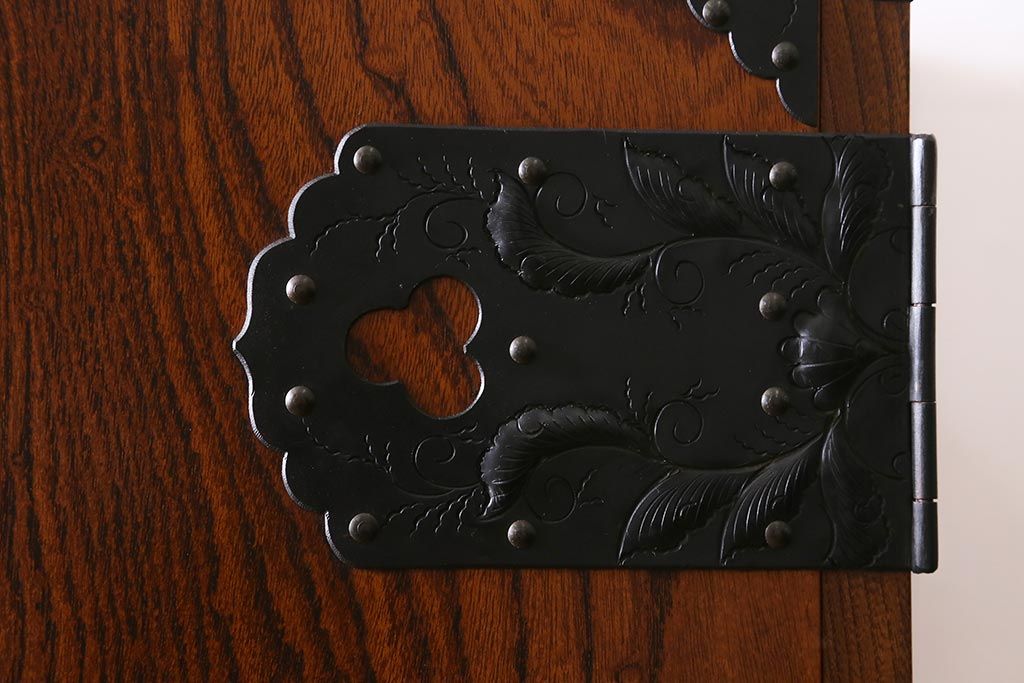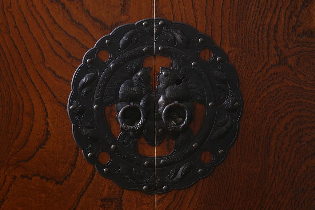 ラフジュ工房> 民芸家具 > ビンテージ家具 岩谷堂箪笥 銘入り「菊政」 手打ち金具 漆塗り 美しい杢目と重厚感のある金具が魅力的なワードローブ(洋服タンス)(R-040479)
