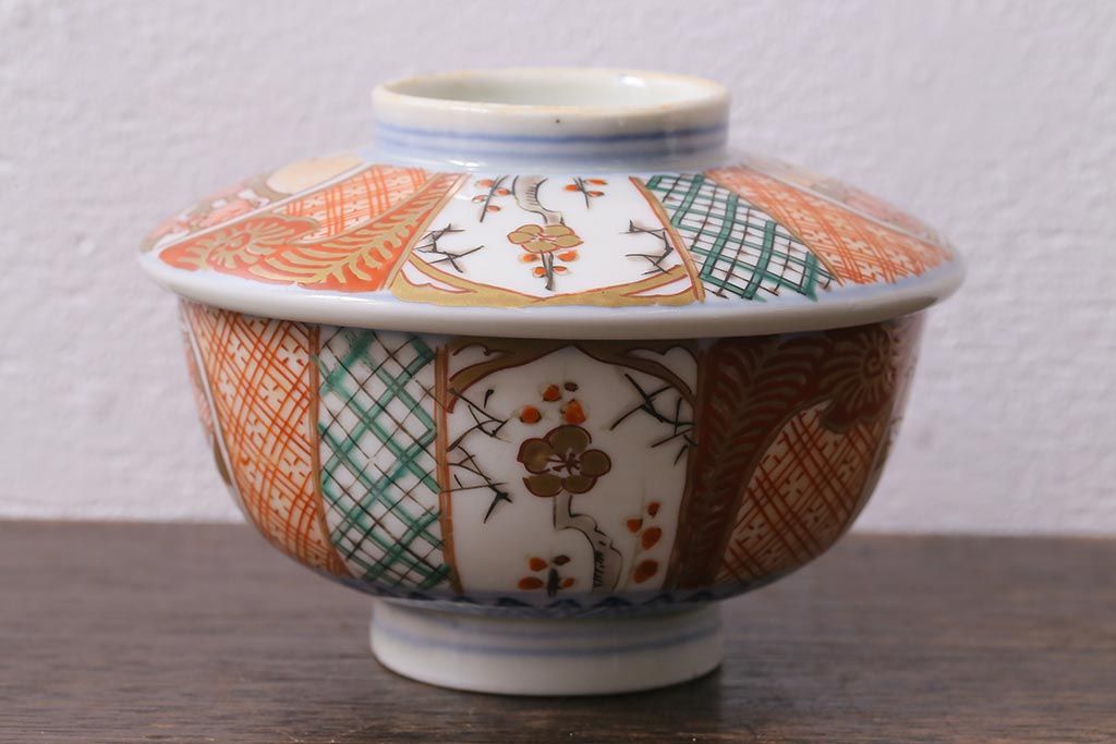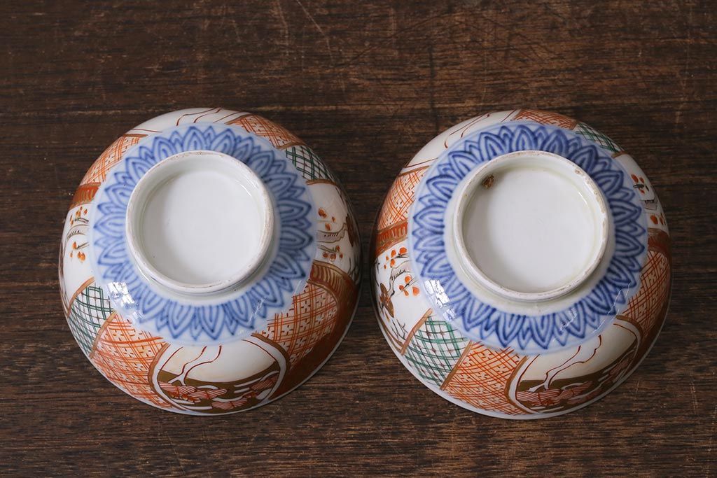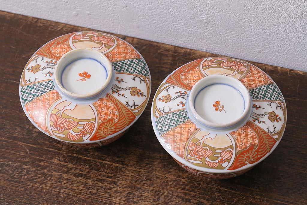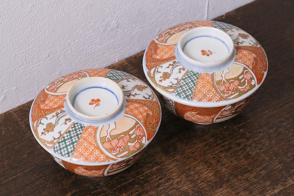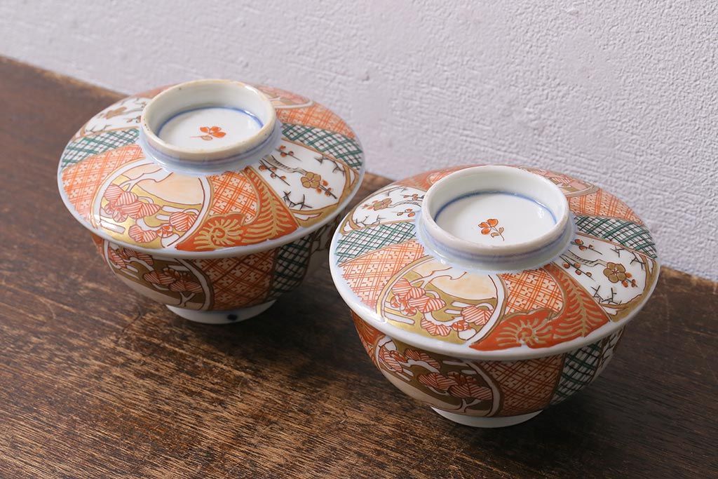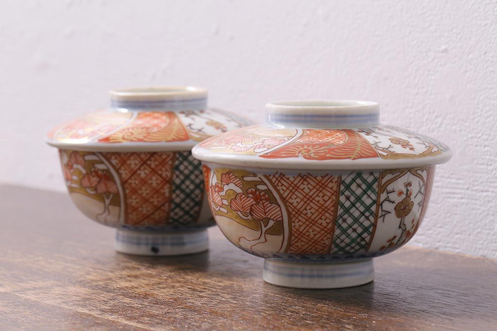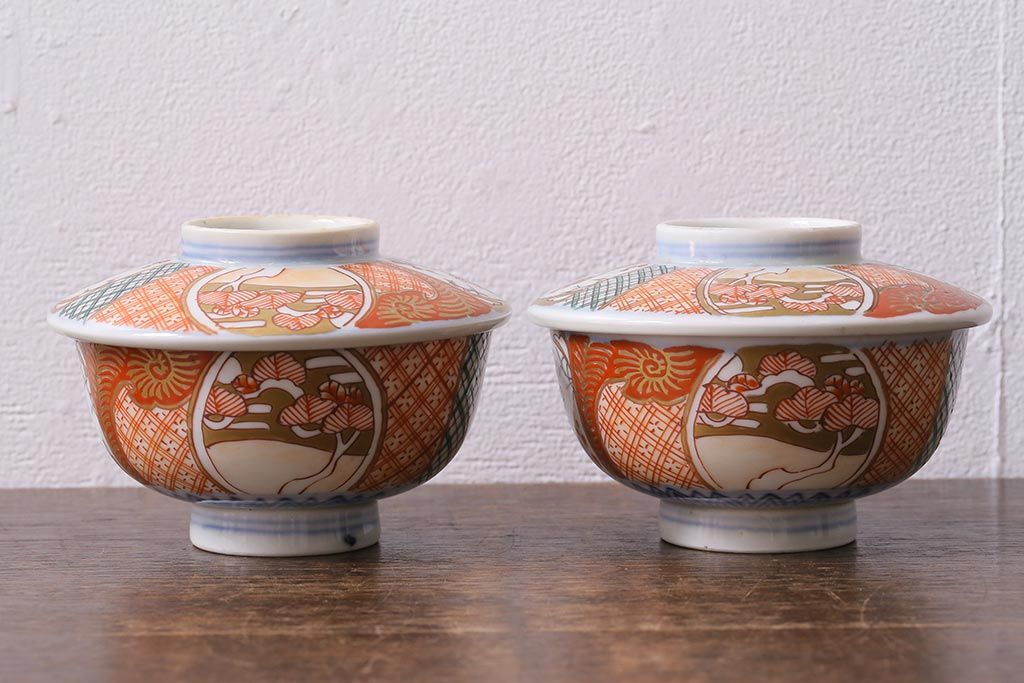 アンティーク雑貨 幕末明治期 伊万里焼 色絵蓋茶碗2客セット(蓋付茶碗、和食器)(R-040573)