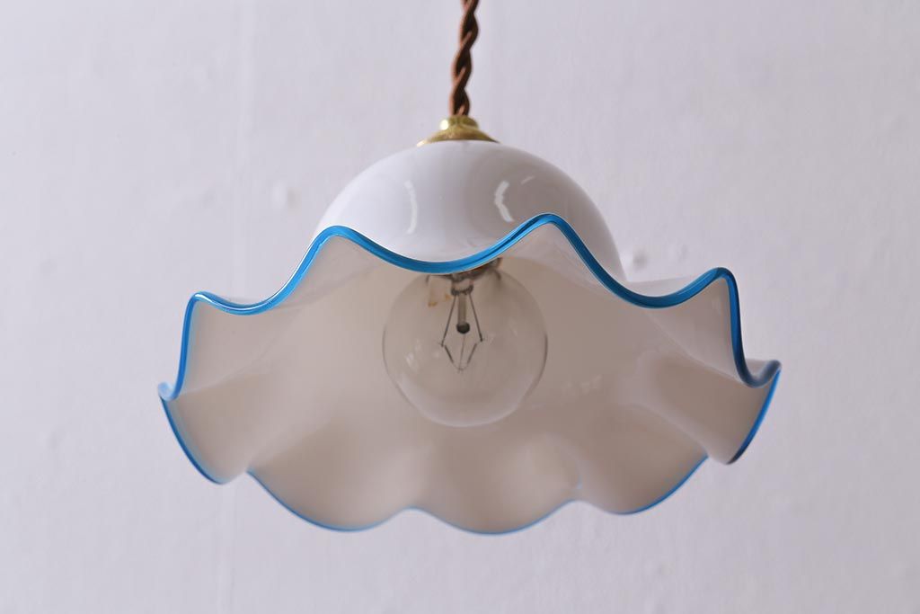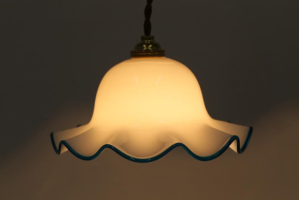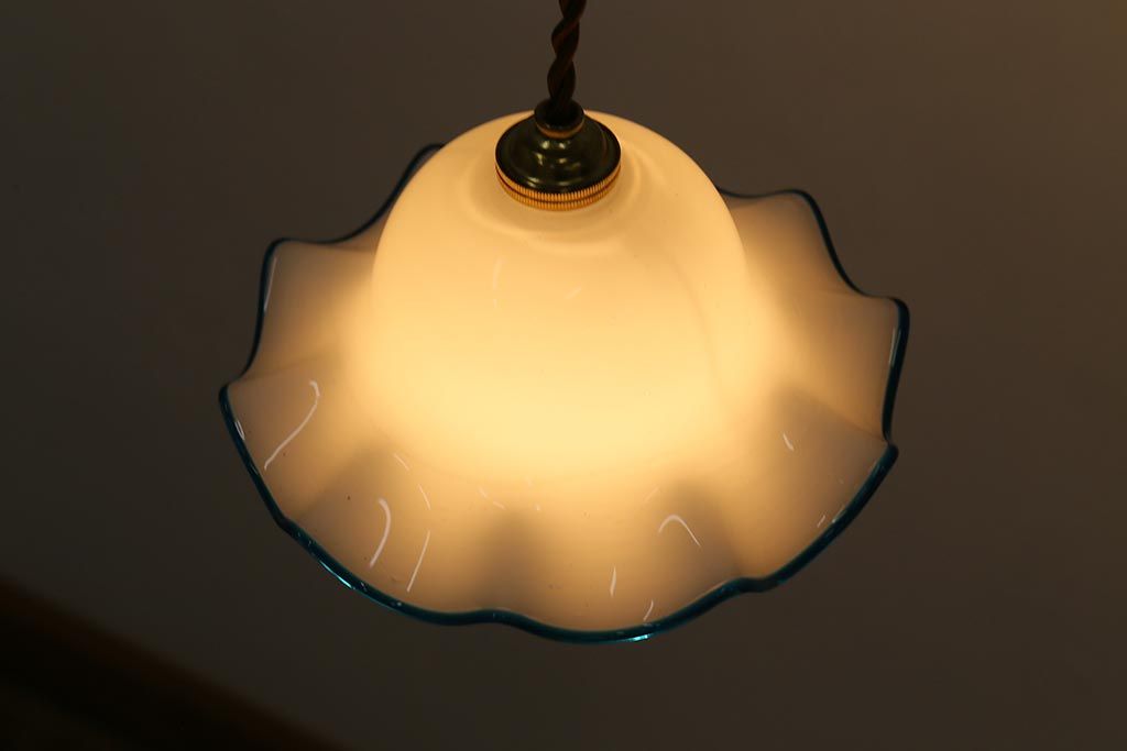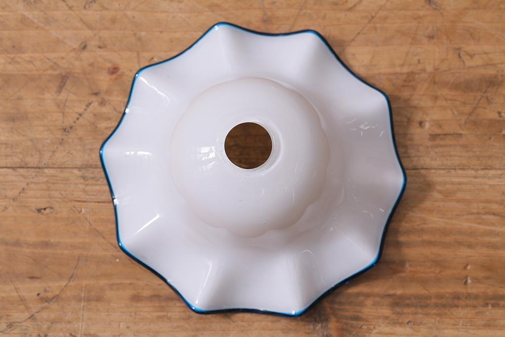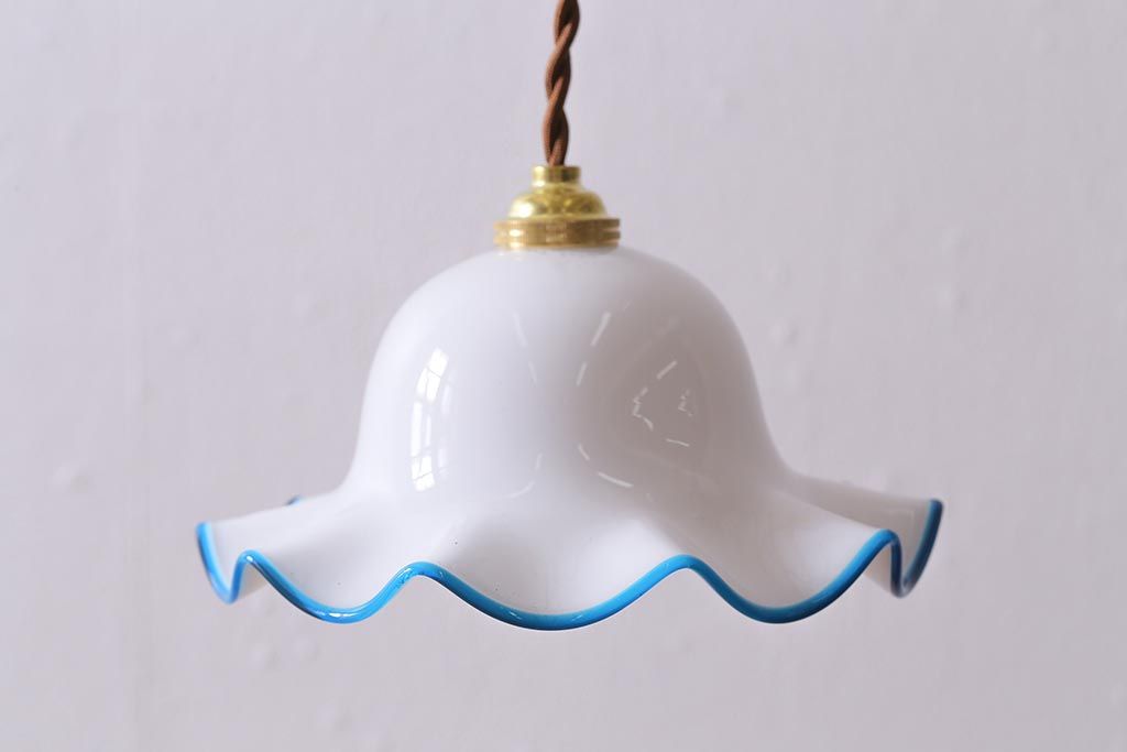 ヴィンテージ照明 イギリスビンテージ 水色縁フリルのミルクガラスペンダントライト(ランプシェード、天井照明)(R-040805)