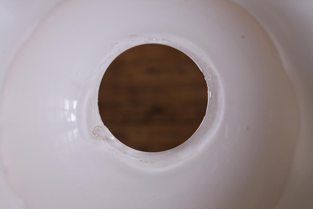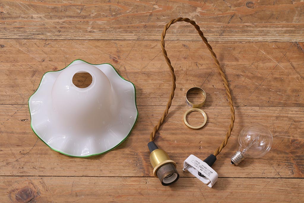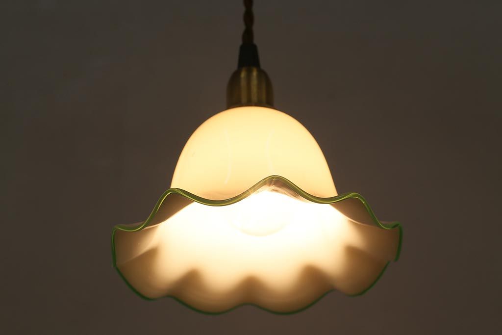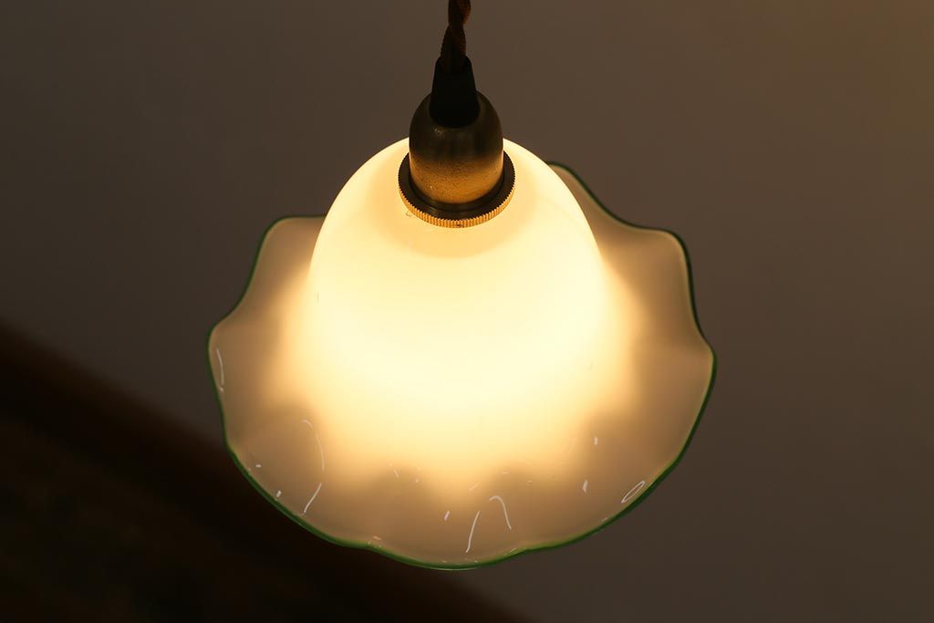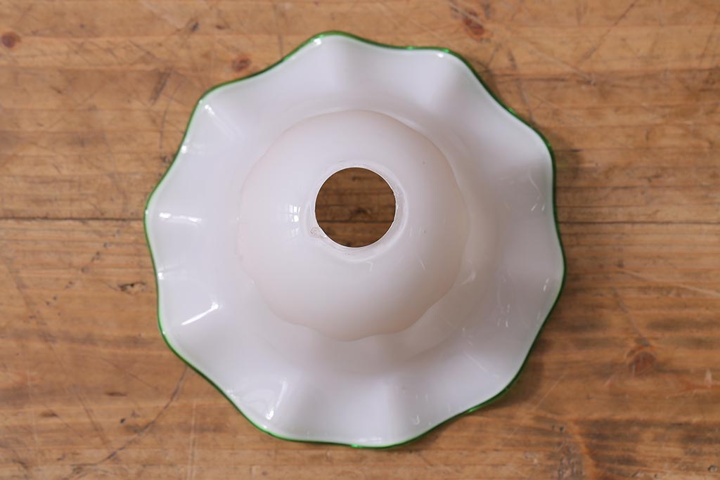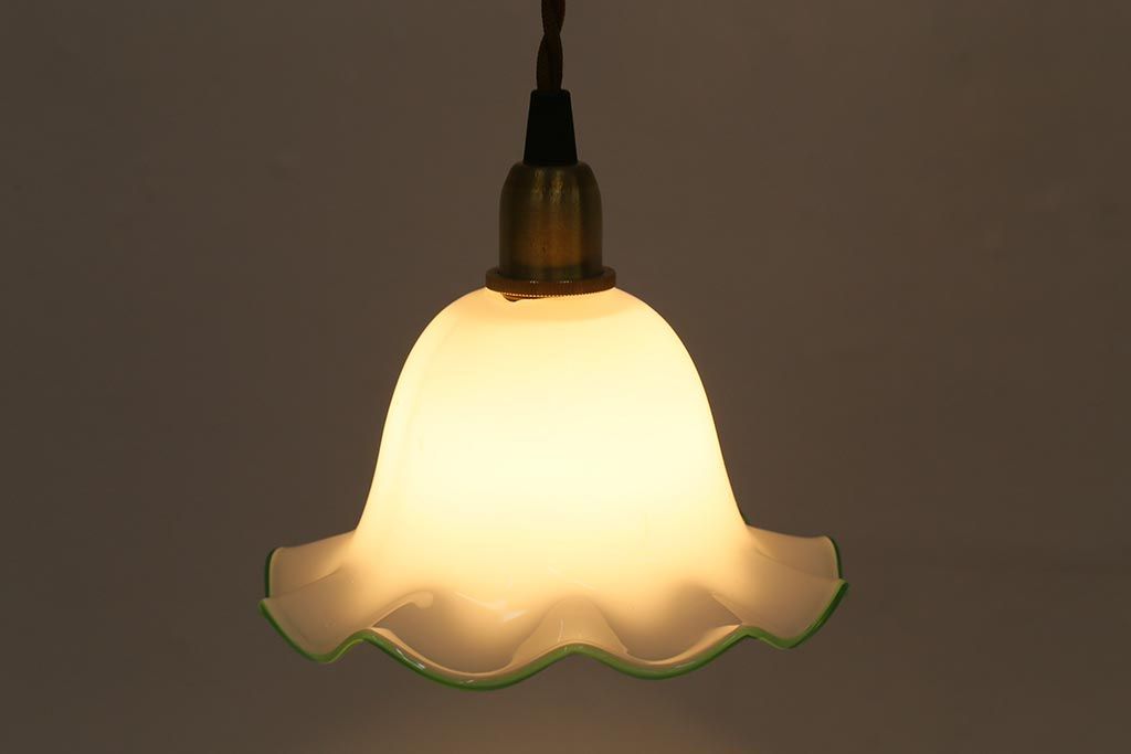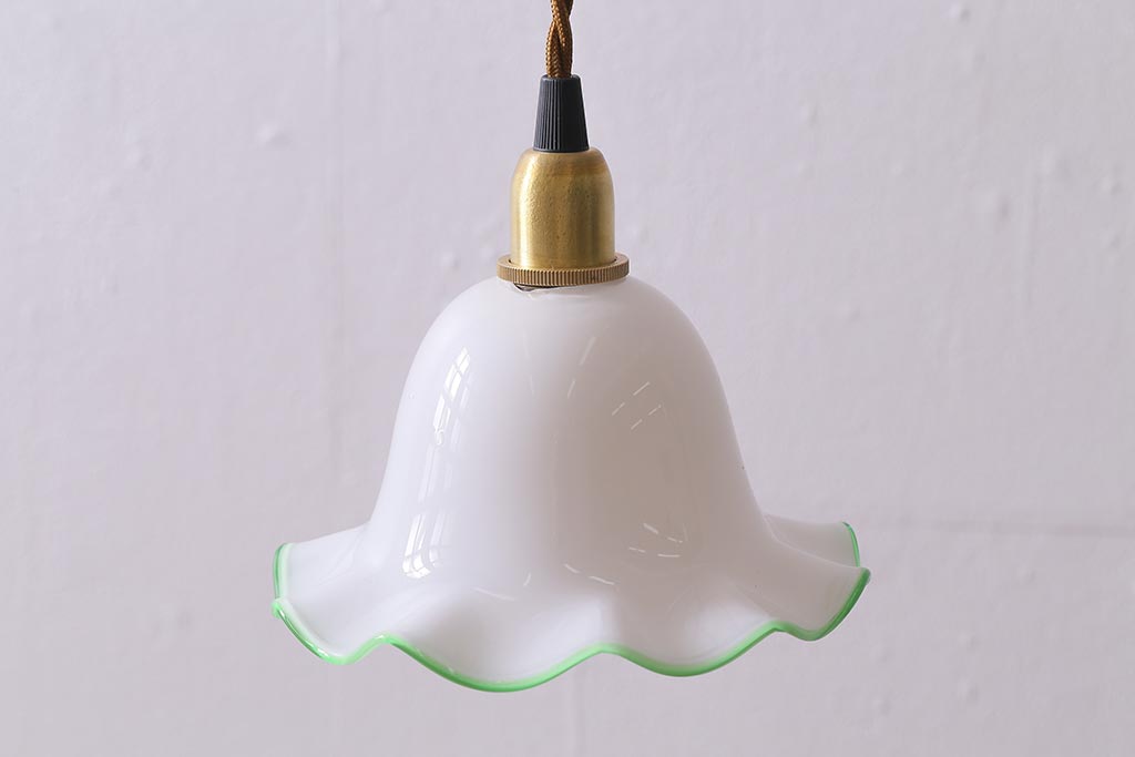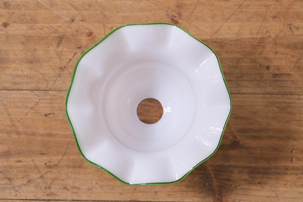 ヴィンテージ照明 イギリスビンテージ 小振りな緑縁フリルのミルクガラスペンダントライト(ランプシェード、天井照明)(R-040803)