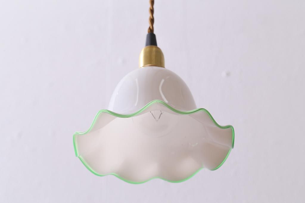 ヴィンテージ照明 イギリスビンテージ 小振りな緑縁フリルのミルクガラスペンダントライト(ランプシェード、天井照明)(R-040803)です。