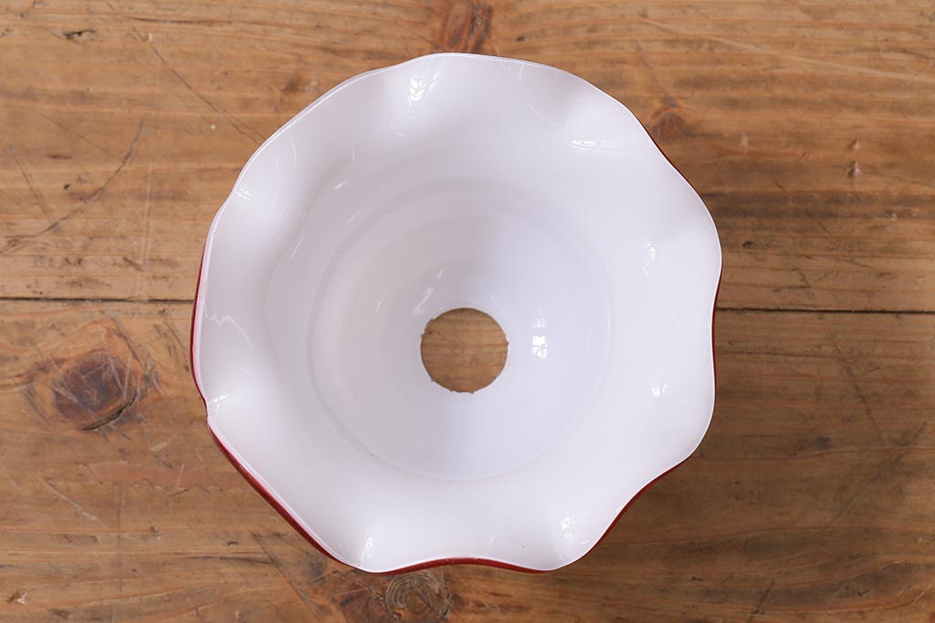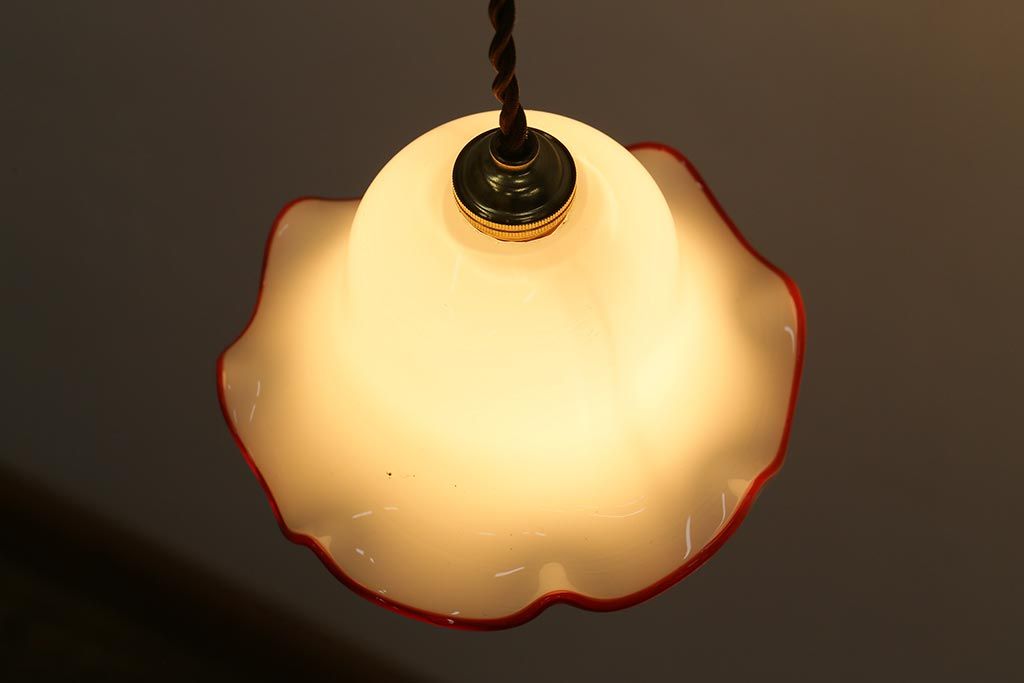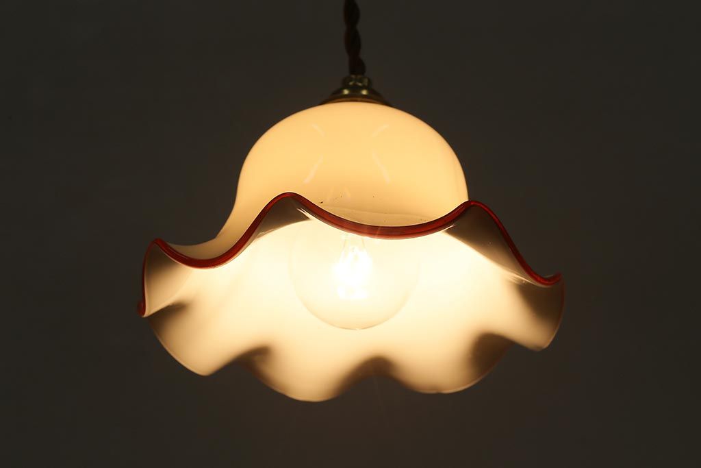 ヴィンテージ照明 イギリスビンテージ 小振りな赤縁フリルのミルクガラスペンダントライト(ランプシェード、天井照明)(R-040808)