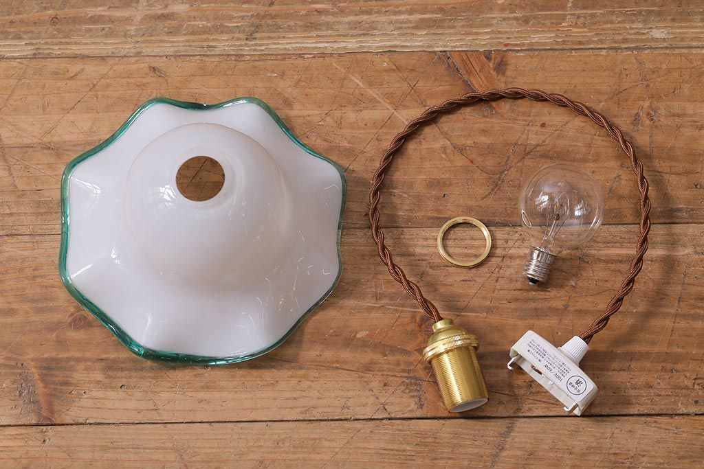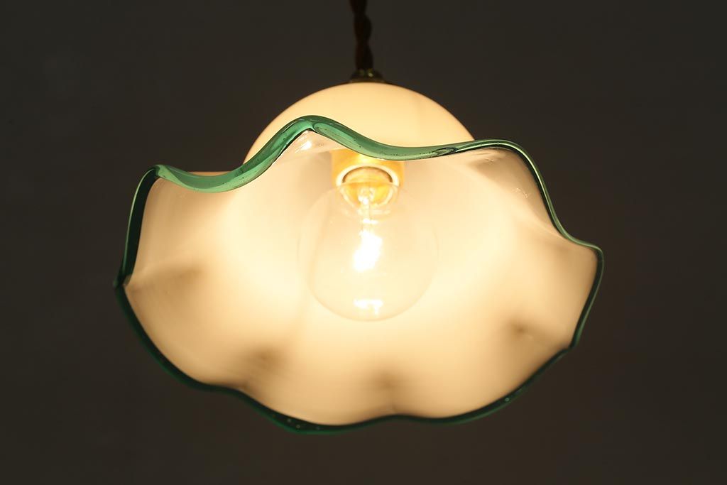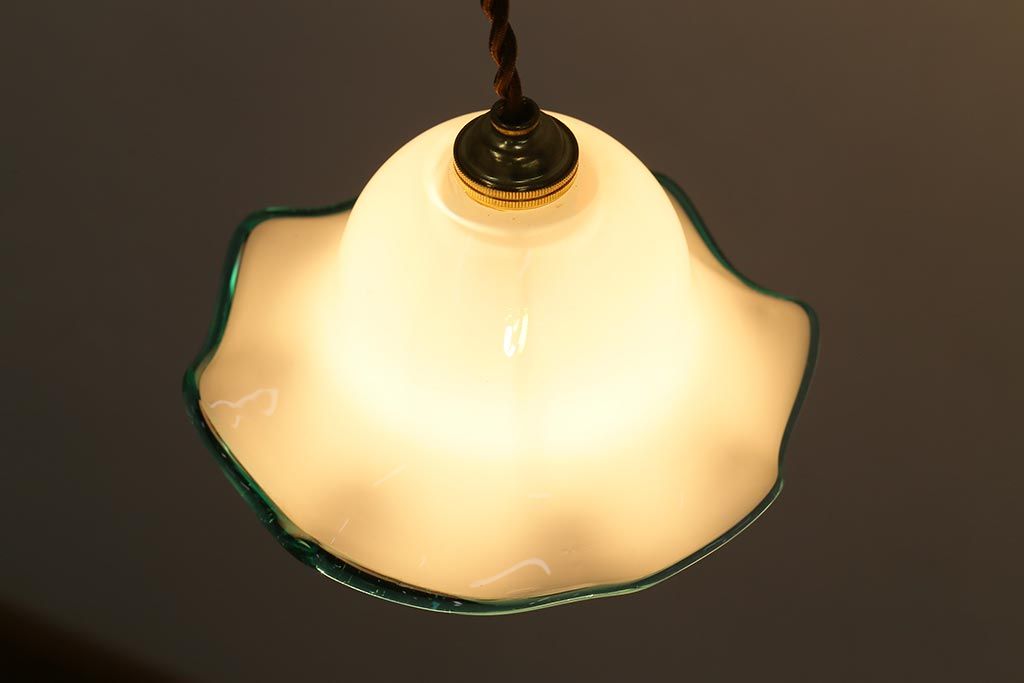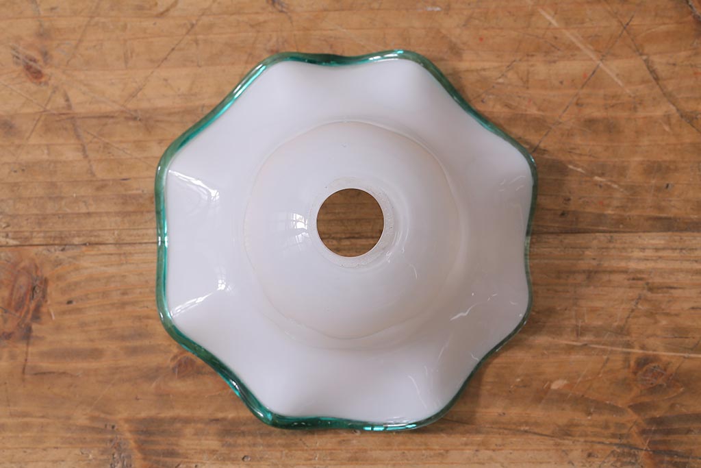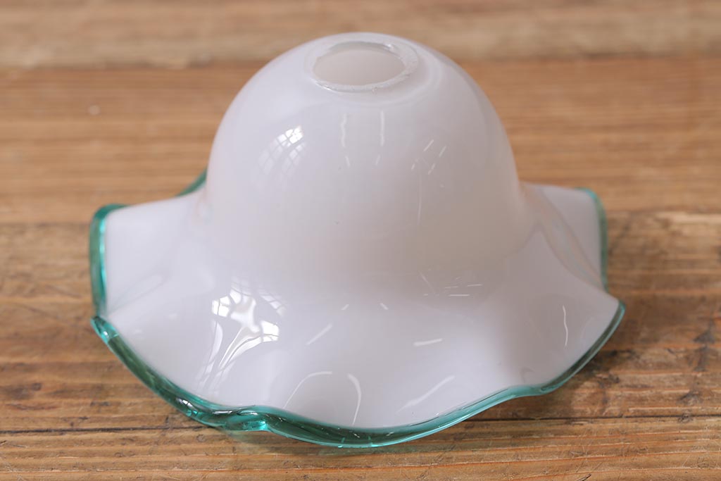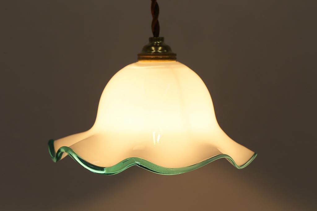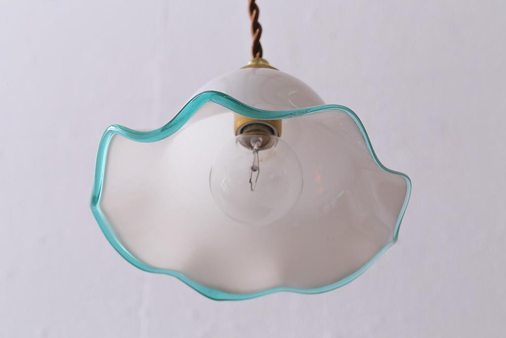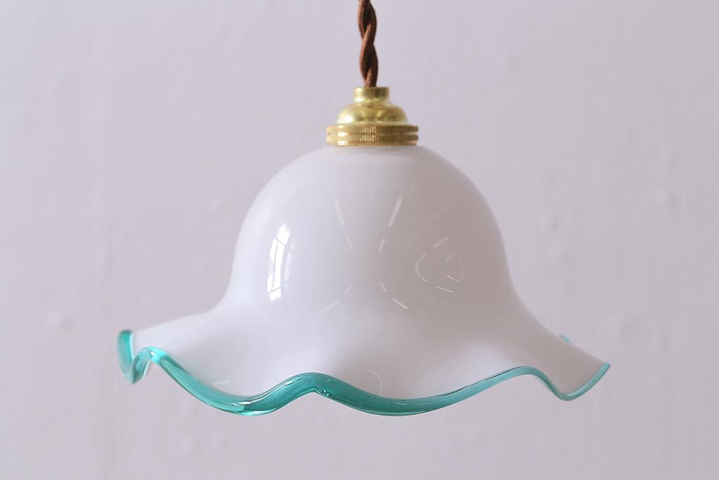 ヴィンテージ照明 イギリスビンテージ 小振りな水色縁フリルのミルクガラスペンダントライト(ランプシェード、天井照明)(R-040809)