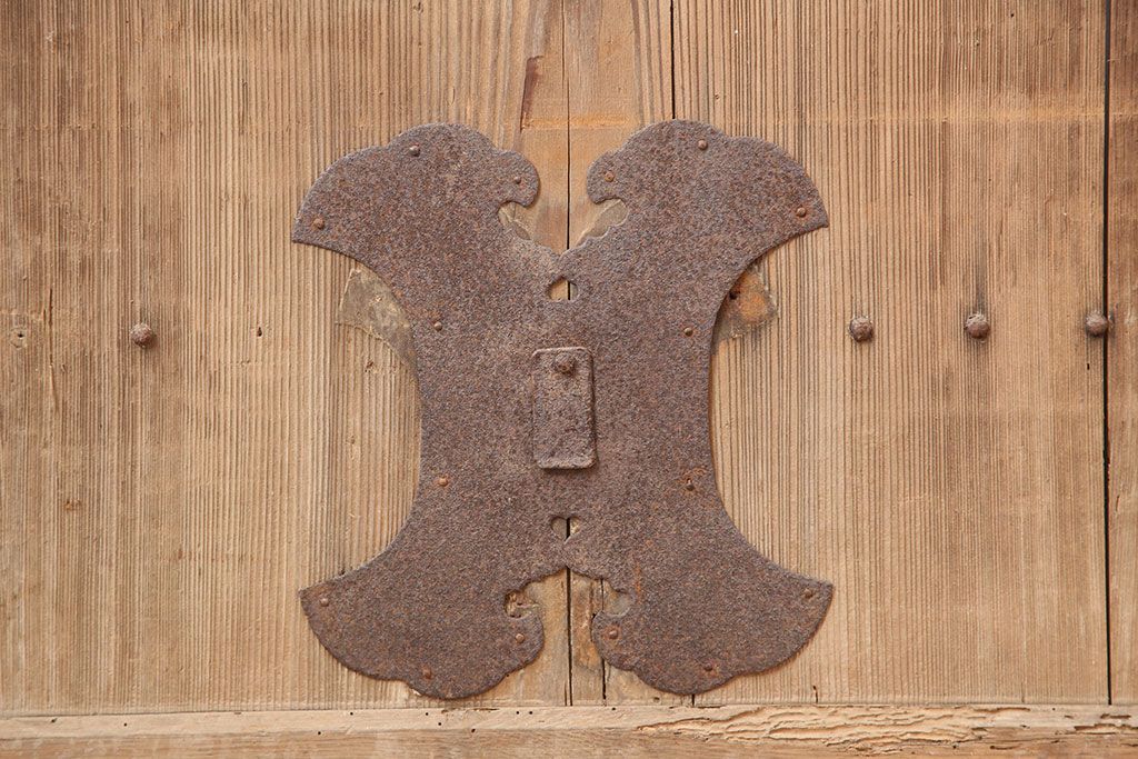 アンティーク建具 和製アンティーク ヒノキ材 風格漂う格子蔵戸(玄関戸、引き戸)(R-040430)です。