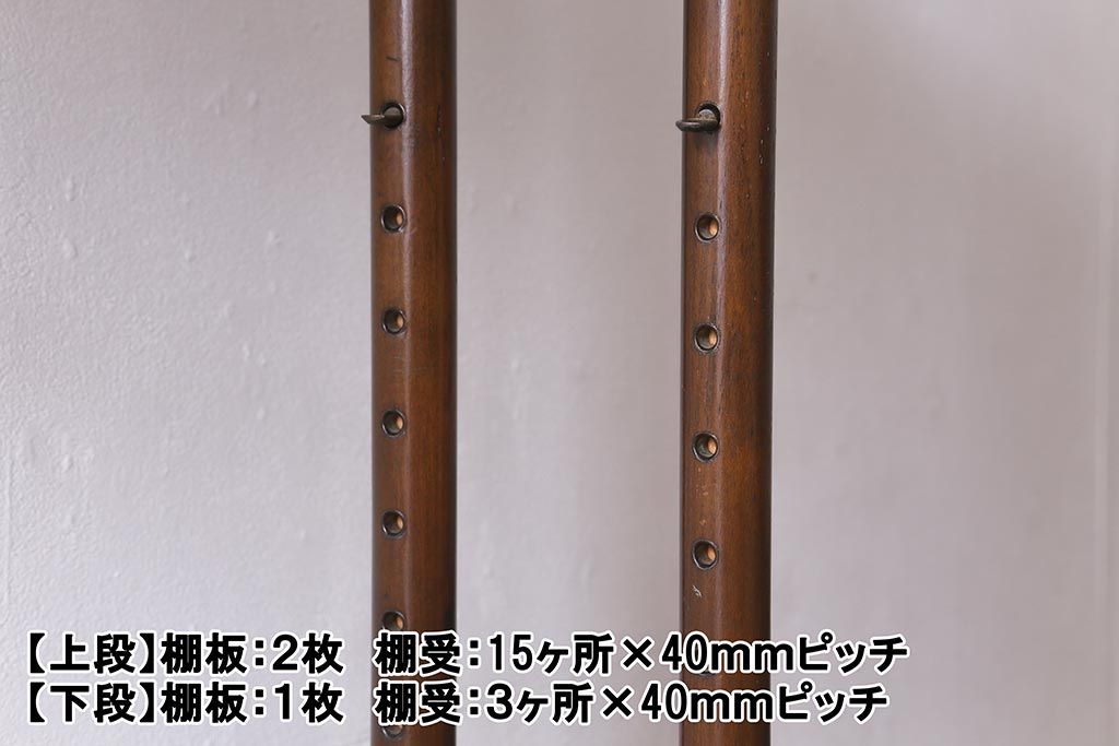 棚板は取り外しできます。棚板は上段2枚、下段1枚あります。棚受けは上段15ヶ所、下段3ヶ所、どちらも40mmピッチで調整できます。棚幅サイズのものが1枚の作りです。