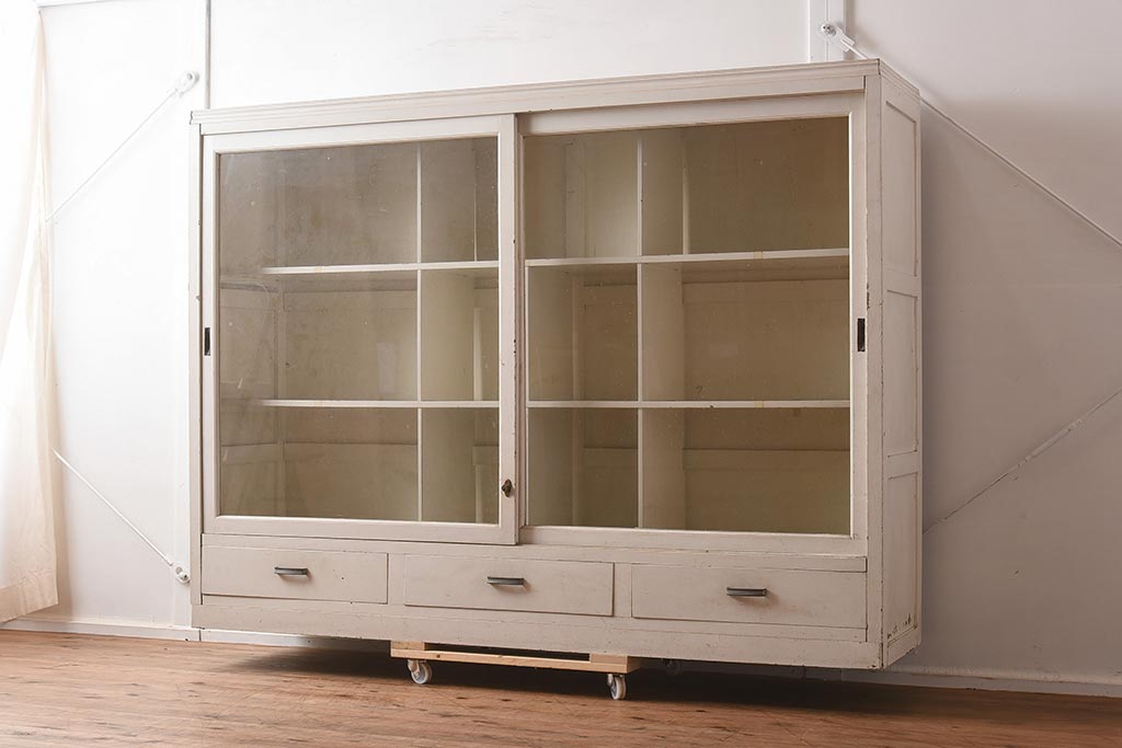 レトロ家具 ナチュラルインテリアにぴったりなホワイトペイントのガラス戸棚(収納棚、キャビネット)です。