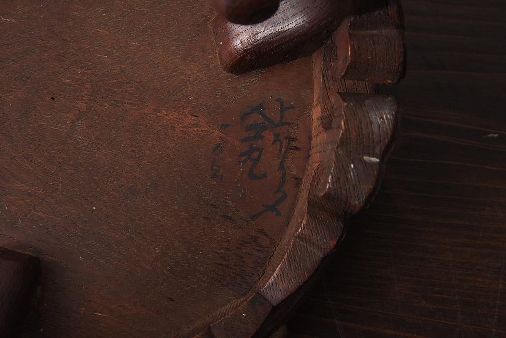 力強い木目と複雑な曲線の彫刻が印象的で、