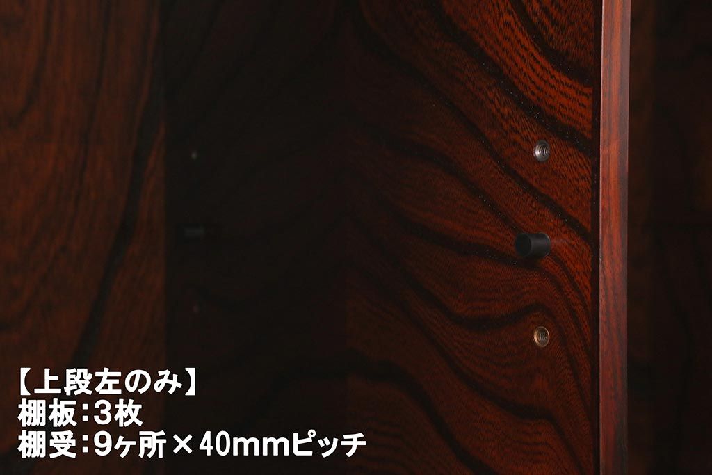 上段左側のみ、棚受けは9か所あり、40mmピッチで調整できます。棚幅サイズのものが1枚の作りです。