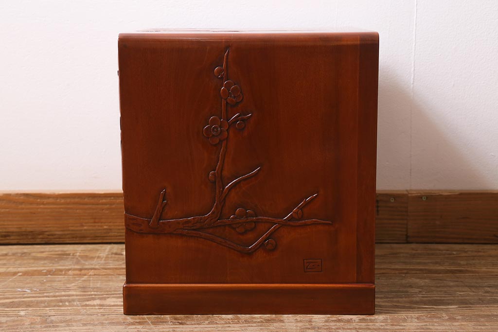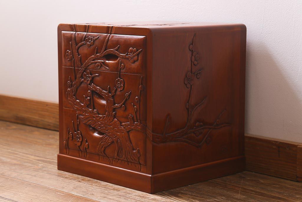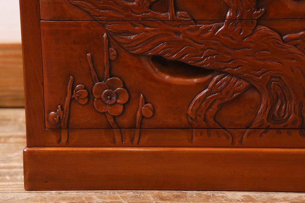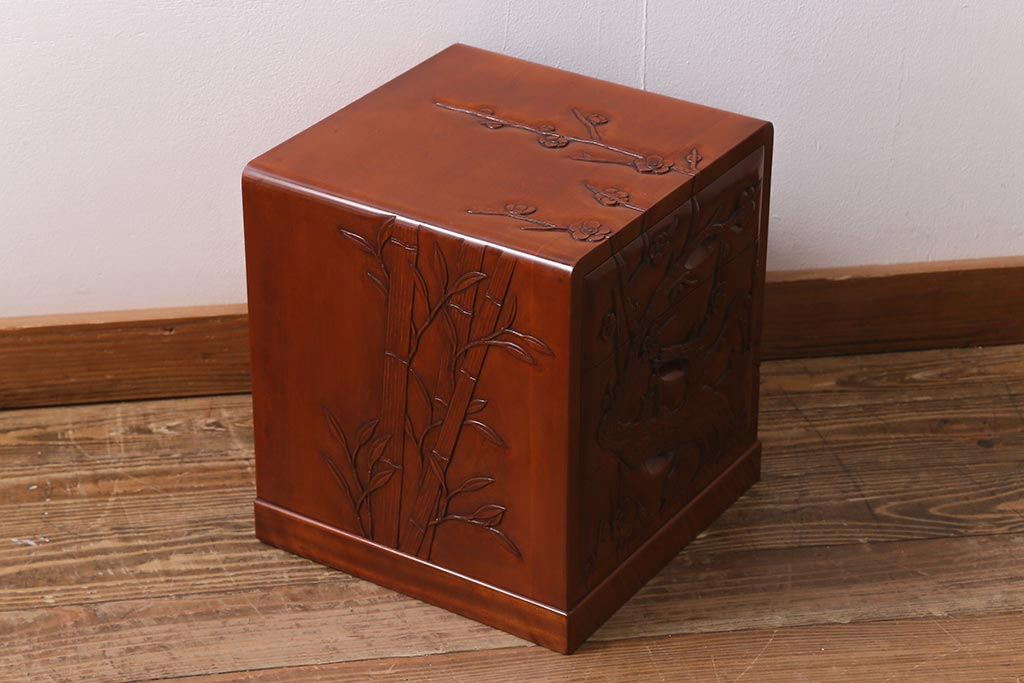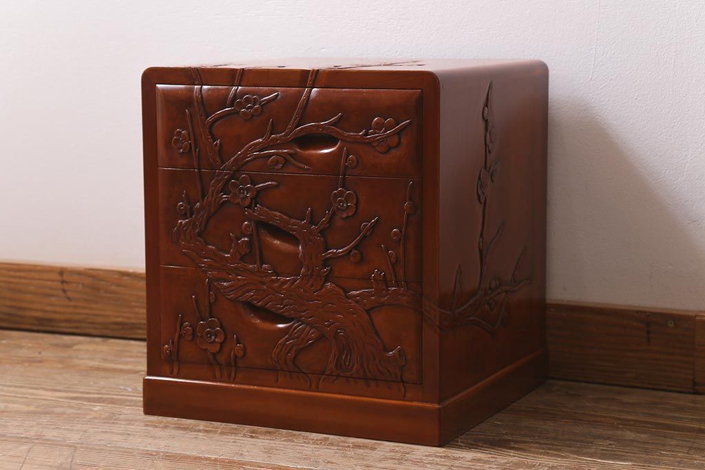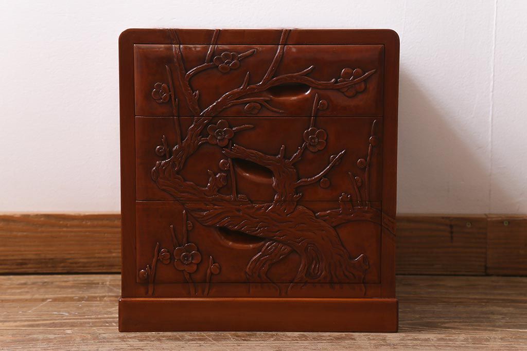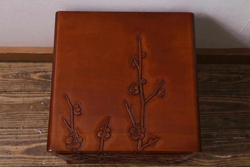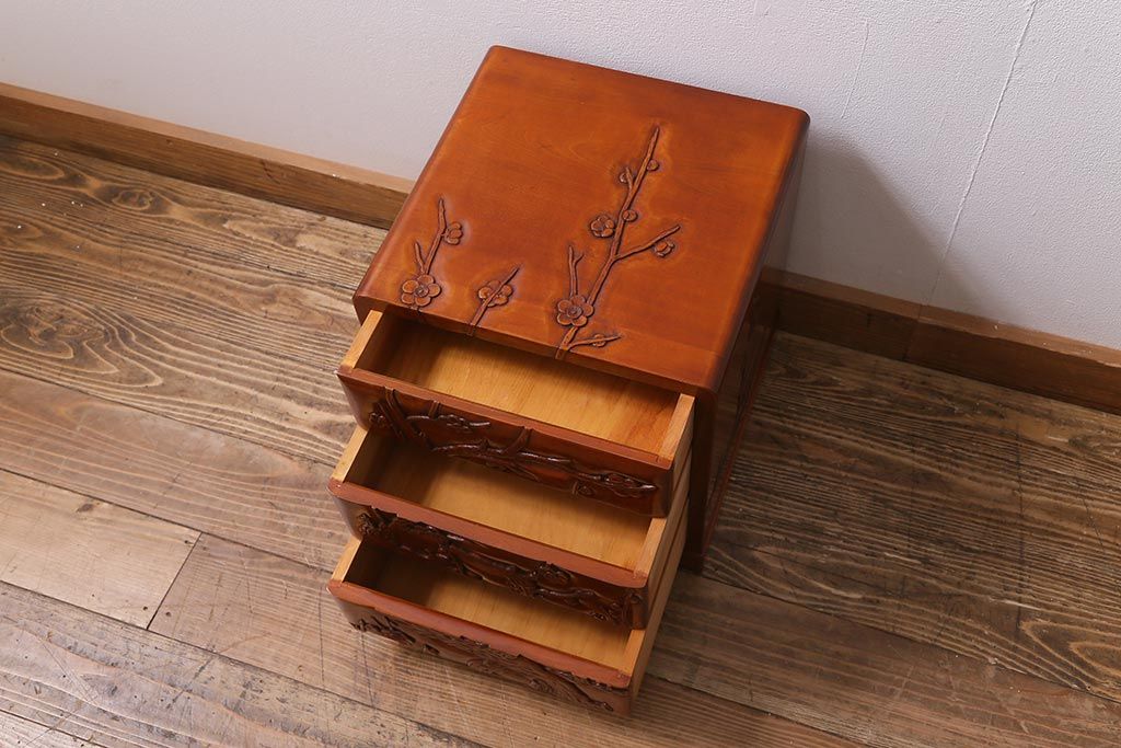中古 伝統工芸 日光彫り 竹・梅の木 彫刻が魅力の小引き出し(卓上収納、小物収納)(R-040883)