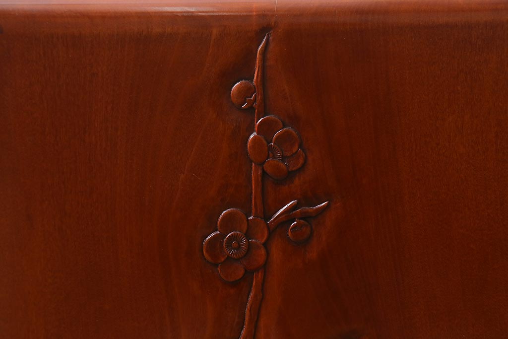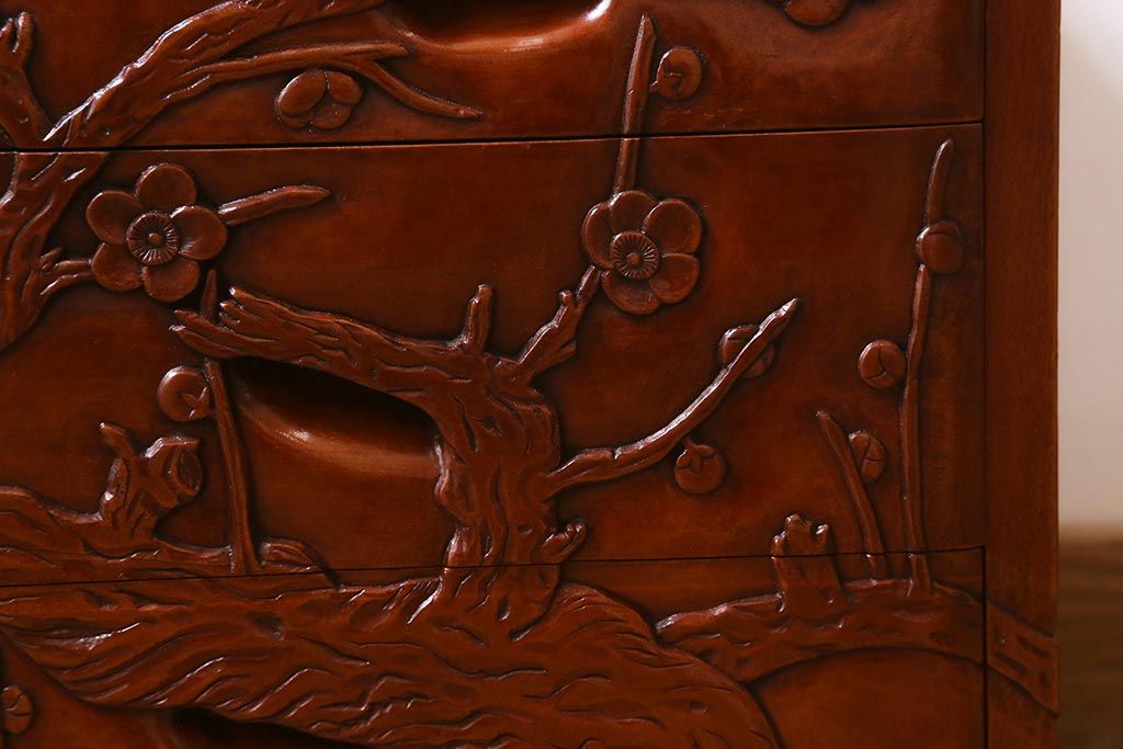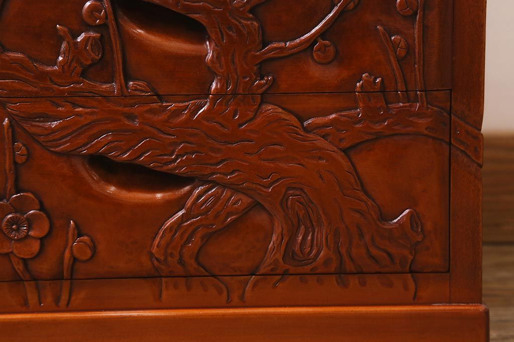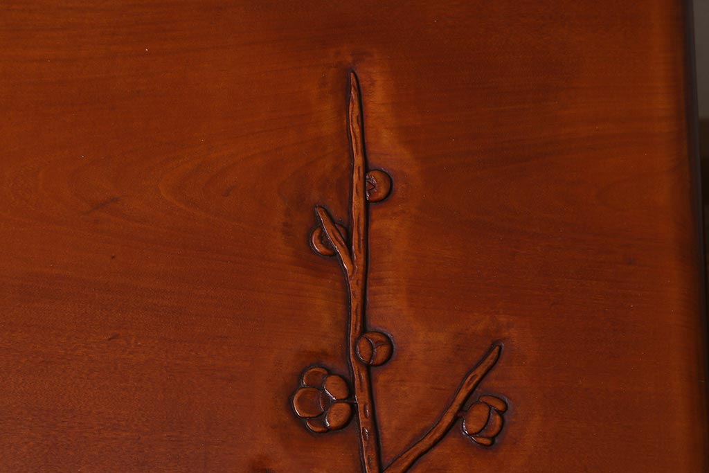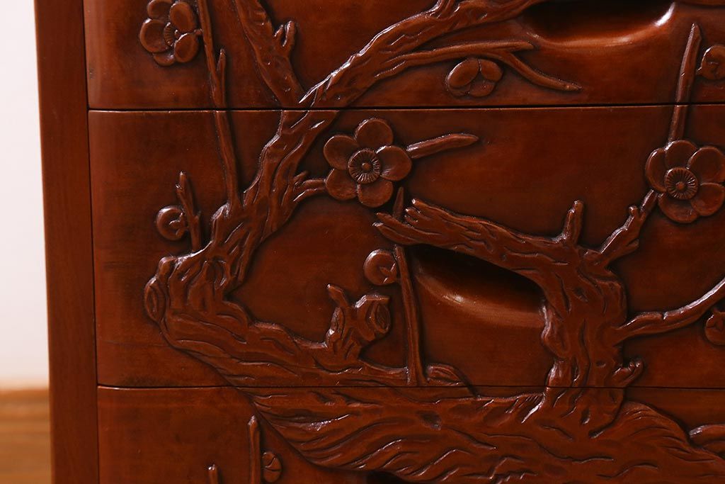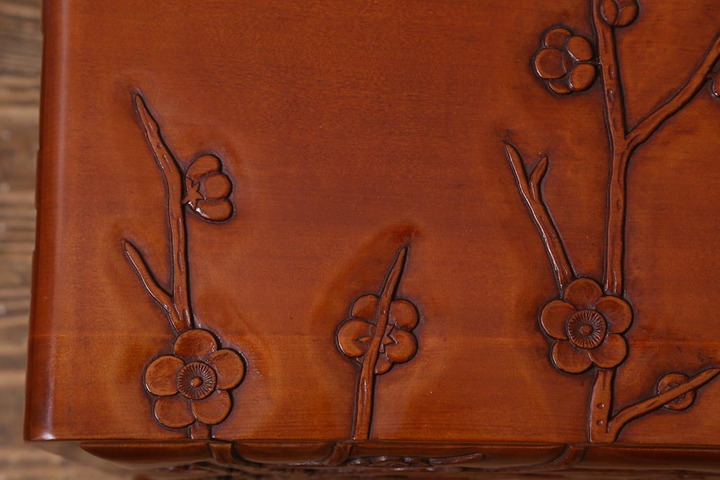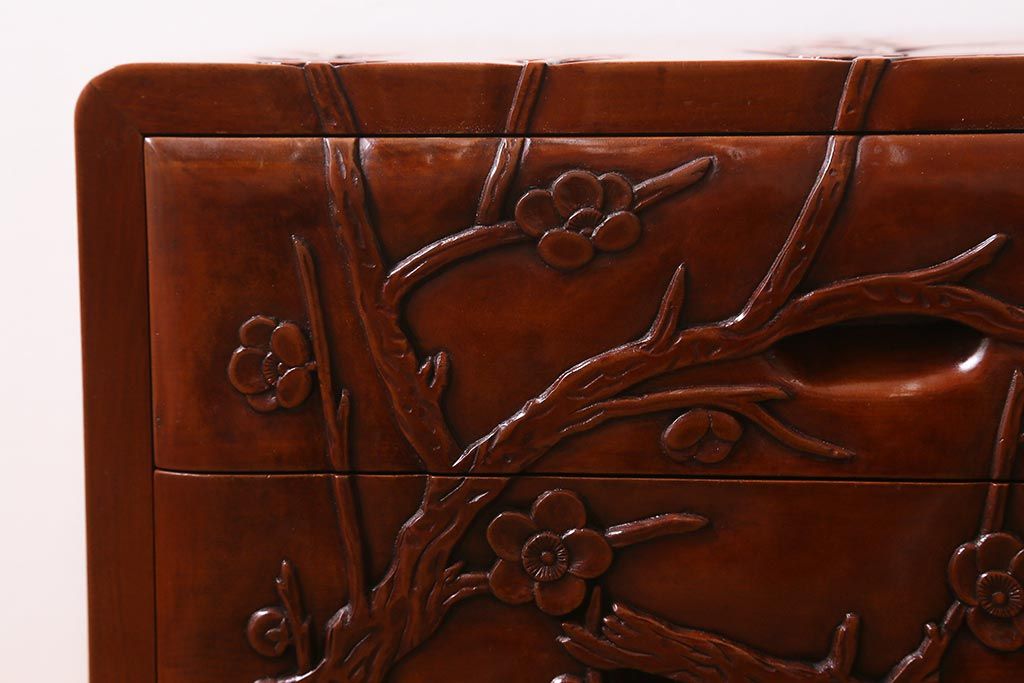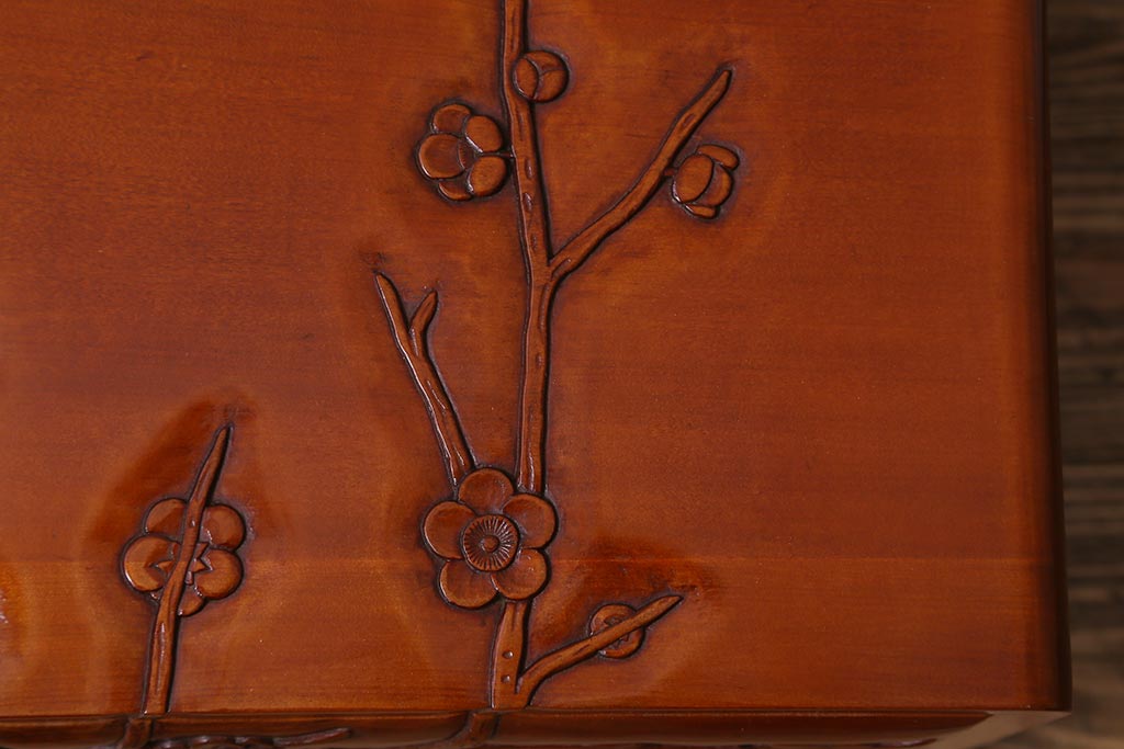 中古 伝統工芸 日光彫り 竹・梅の木 彫刻が魅力の小引き出し(卓上収納、小物収納)(R-040883)