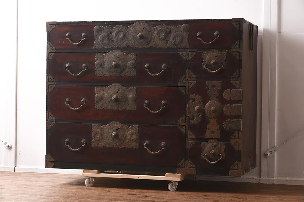 和箪笥> 衣装箪笥 > アンティーク家具 前面欅(ケヤキ)材 迫力ある金具の仙台箪笥(野郎箪笥、時代箪笥、衣装箪笥、和タンス)(R-040784)