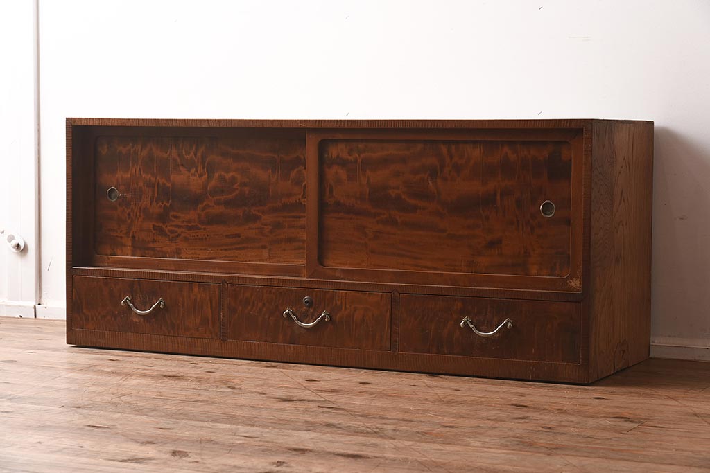 アンティーク家具 昭和初期 動きのある杢目が魅力的な箪笥ローボード(戸棚、収納棚)(R-040759)
