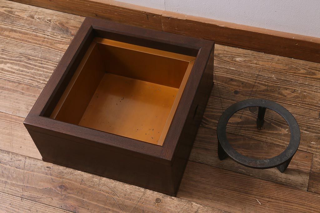 レトロ雑貨 指物家具 昭和後期 五徳付き 桑材 シンプルなデザインの木製角火鉢(箱火鉢、茶道具)(R-040907)