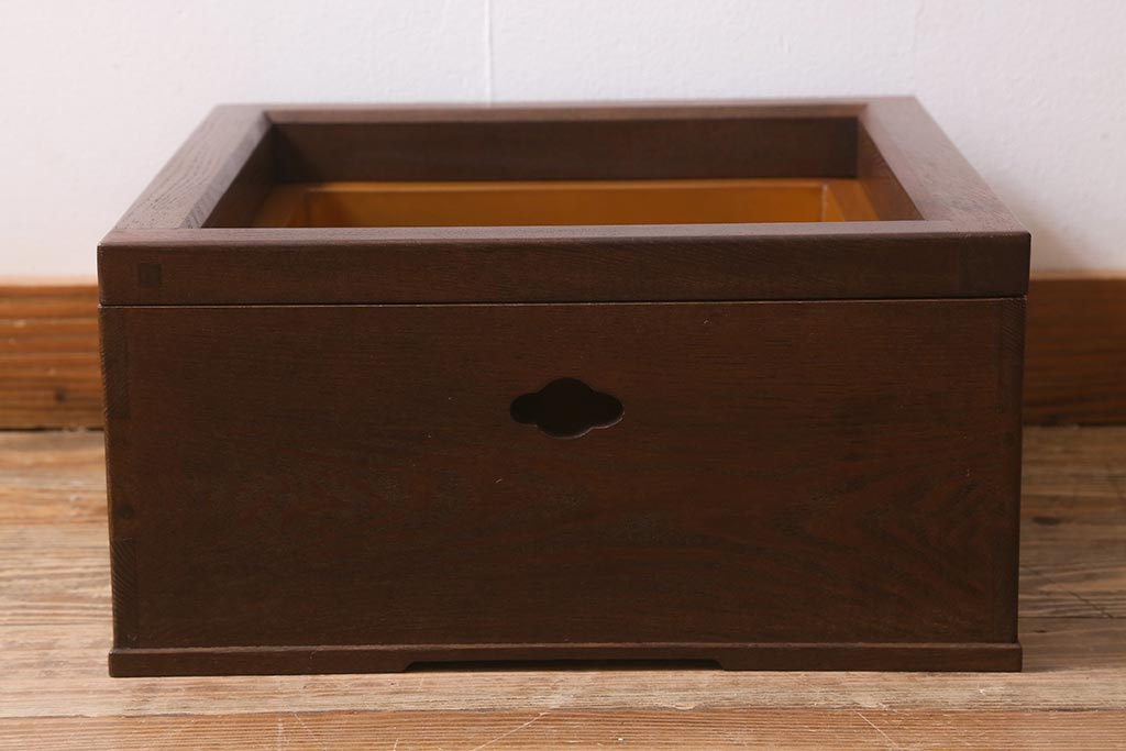 火鉢> 木製火鉢 > レトロ雑貨 指物家具 昭和後期 五徳付き 桑材 シンプルなデザインの木製角火鉢(箱火鉢、茶道具)(R-040907)