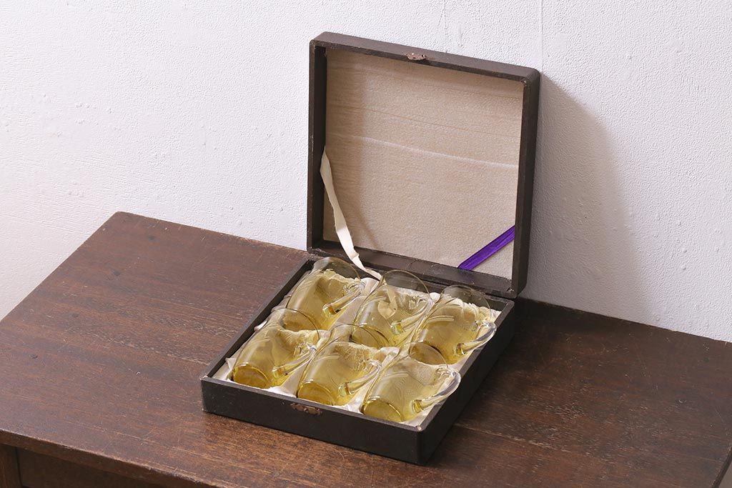 アンティーク雑貨 戦前 昭和初期 取っ手付黄色切子グラス6客セット 箱付(コップ、和ガラス)(R-040216)