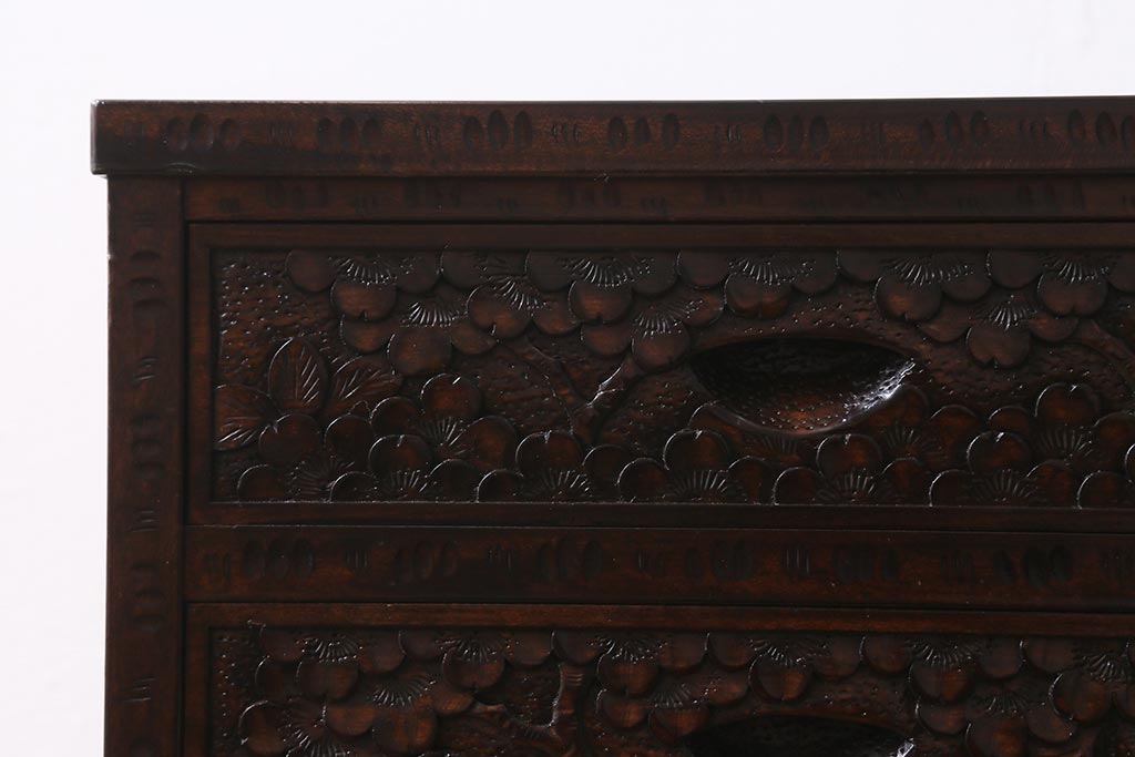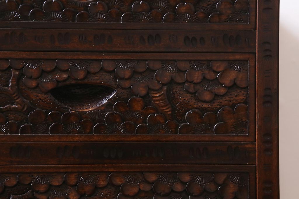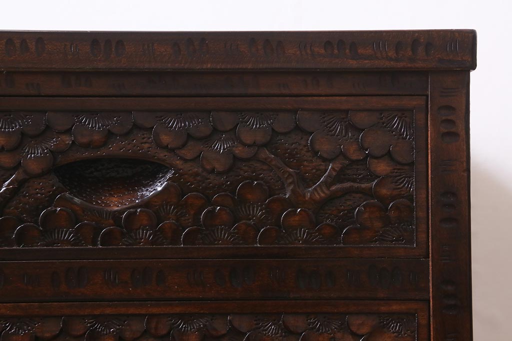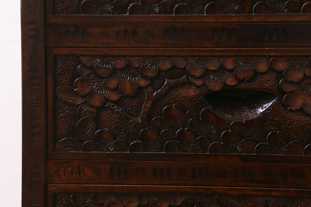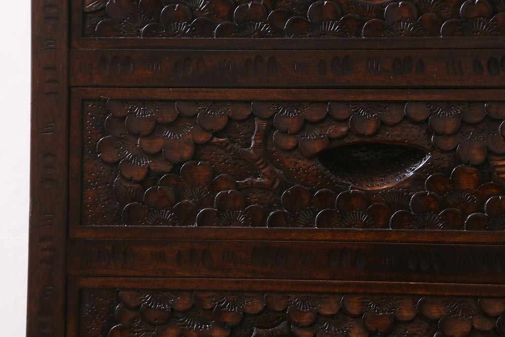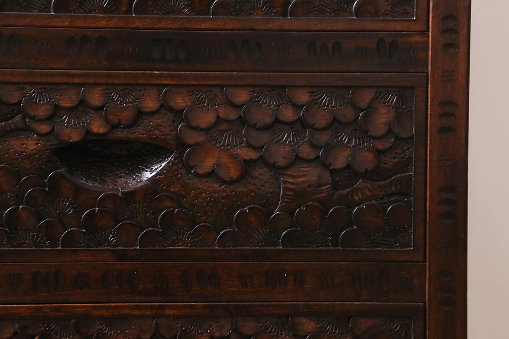 民芸家具 > 中古 伝統工芸 軽井沢彫り 満開に咲き誇る桜の彫りが華やかな小振りのチェスト(小物収納、小箪笥、引き出し)(R-041060)