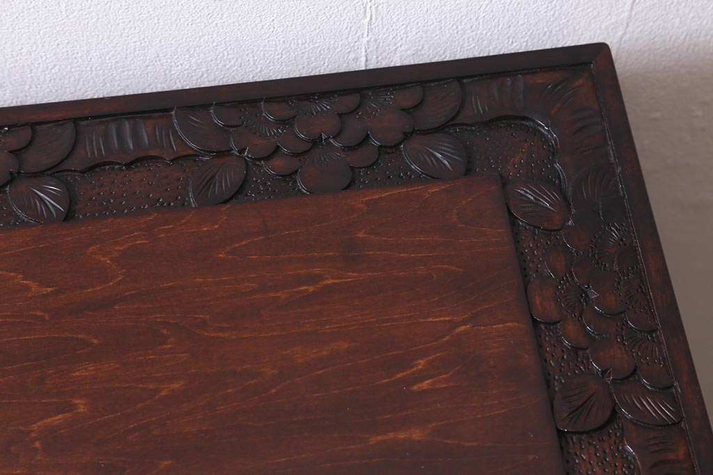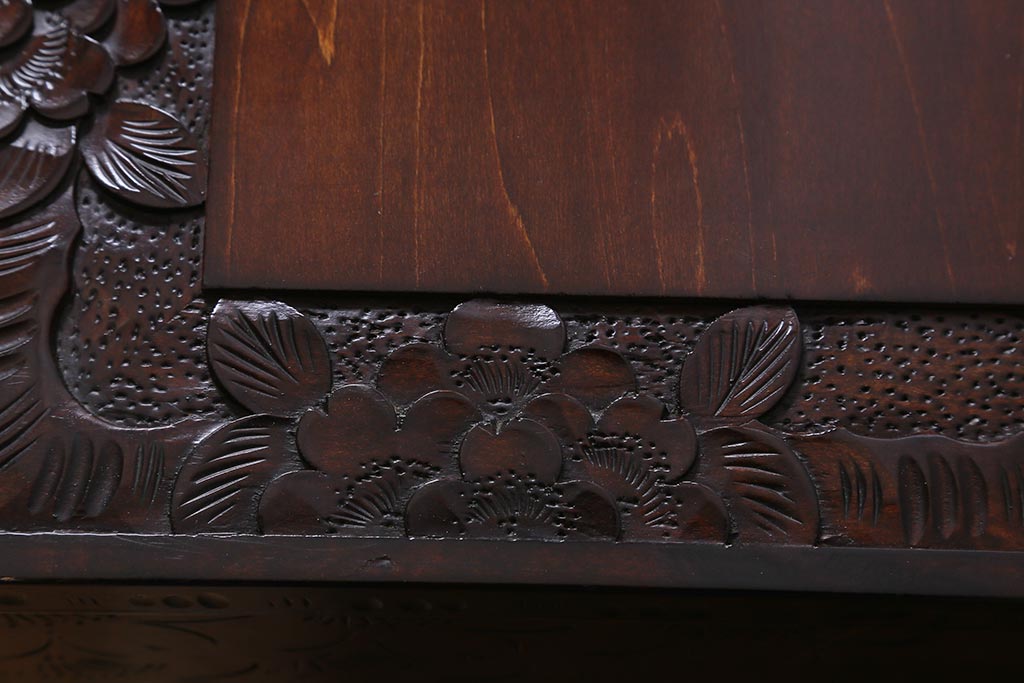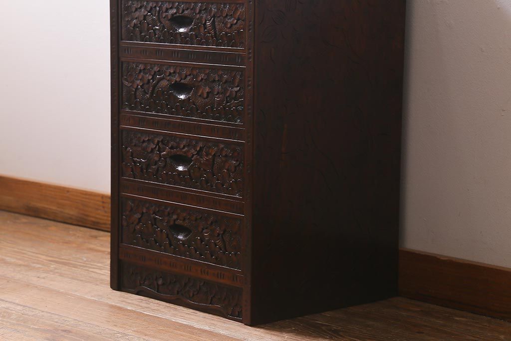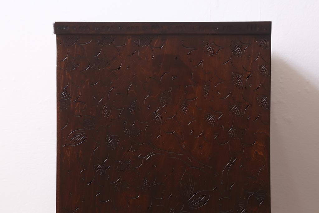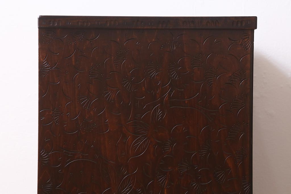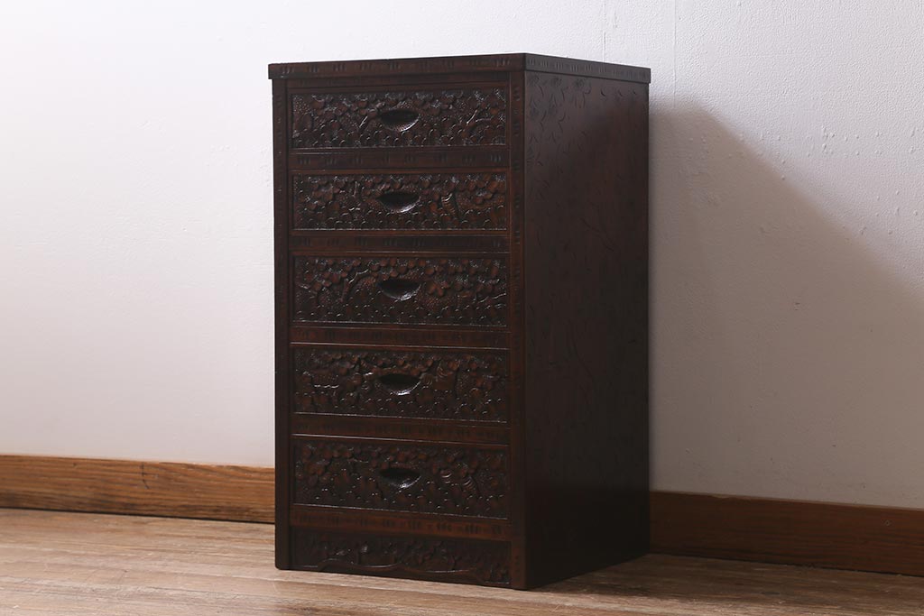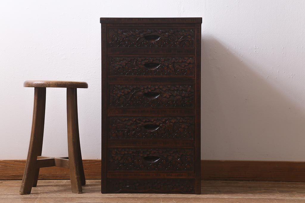 民芸家具 > 中古 伝統工芸 軽井沢彫り 満開に咲き誇る桜の彫りが華やかな小振りのチェスト(小物収納、小箪笥、引き出し)(R-041060)
